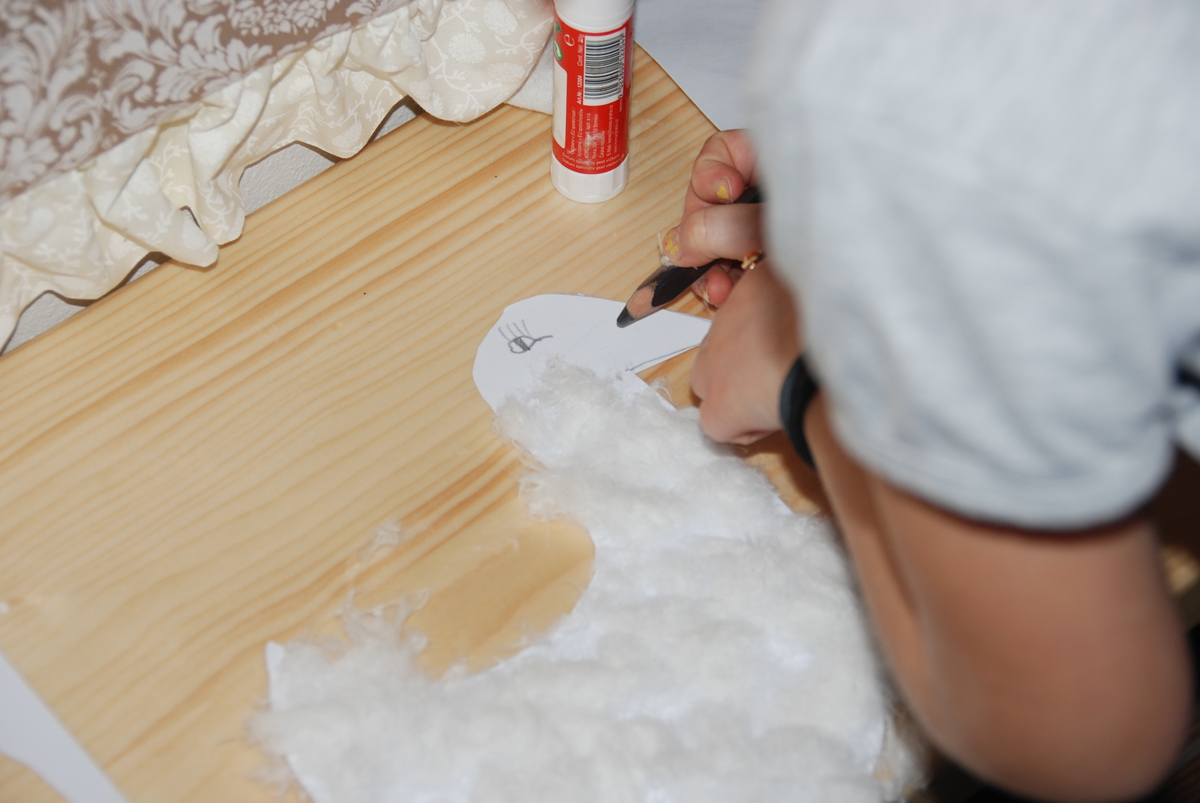 Holčičky na draní použily tmavé peří od slepiček (bílé nebylo☺), které pak spolu s vatou lepily na vystřižené tvary hus. Draní jim šlo pěkně od ruky, a při "táčkách" si povídaly o tom, jaké to kdysi bylo. A aby jim šla práce od ruky, tak si i zazpívaly lidovou písničku z Horácka "Husičky popelavé"...☺