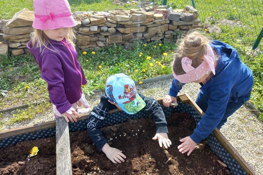 Tak už je tam! Kulička vedle kuličky.. Připravit řádky, poctivě nasázet, zahrabat .. naší malí zahradníčci zvládli vše na jedničku. Teď už jen pravidelně zalévat a těšit se na první lusky.
