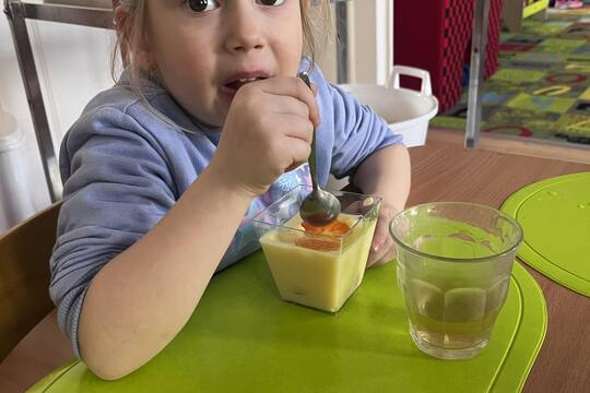 Na svačinku dětem připravila paní kuchařka Blanička vanilkový pudink bez cukru, který dozdobila čerstvými mandarinkami. Děti vůbec nepoznaly, že by v pudinku něco chybělo.
