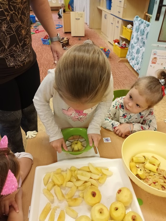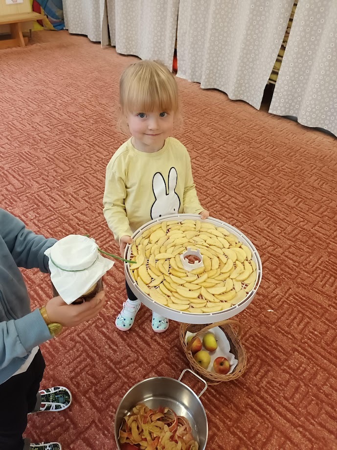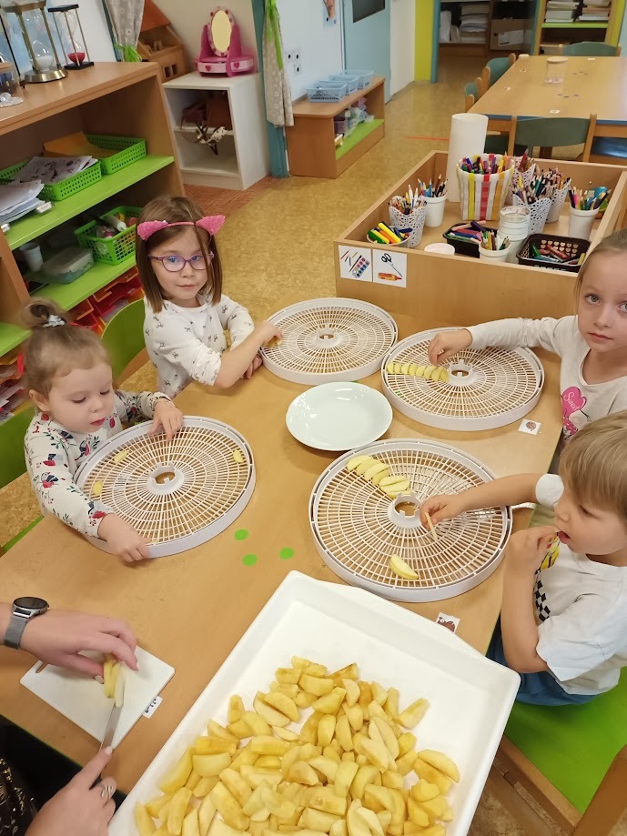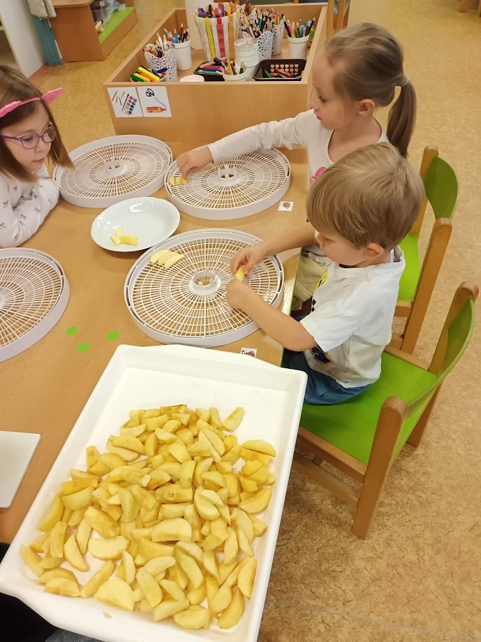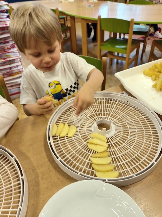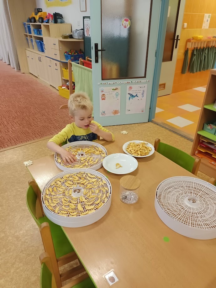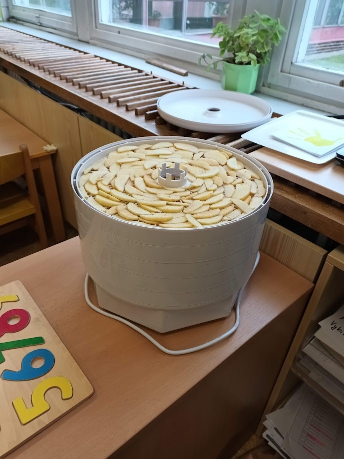 Ve třídě Chobotniček se děti pustily do přípravy křížal z jablíček. Jak na to? Jablka bylo třeba nejprve umýt, poté oloupat, odjadřincovat a nakrájet. Malí pomocníci si dali záležet s narovnáním plátků jablíček do plátů na sušení. Pak už zbývalo jen počkat, až se jablíčka v sušičce na ovoce promění na křížaly.