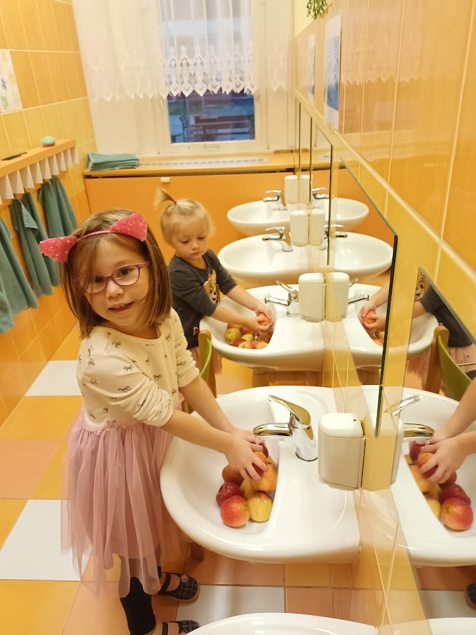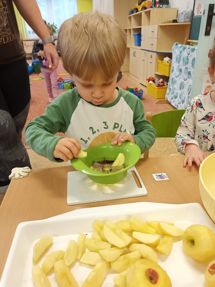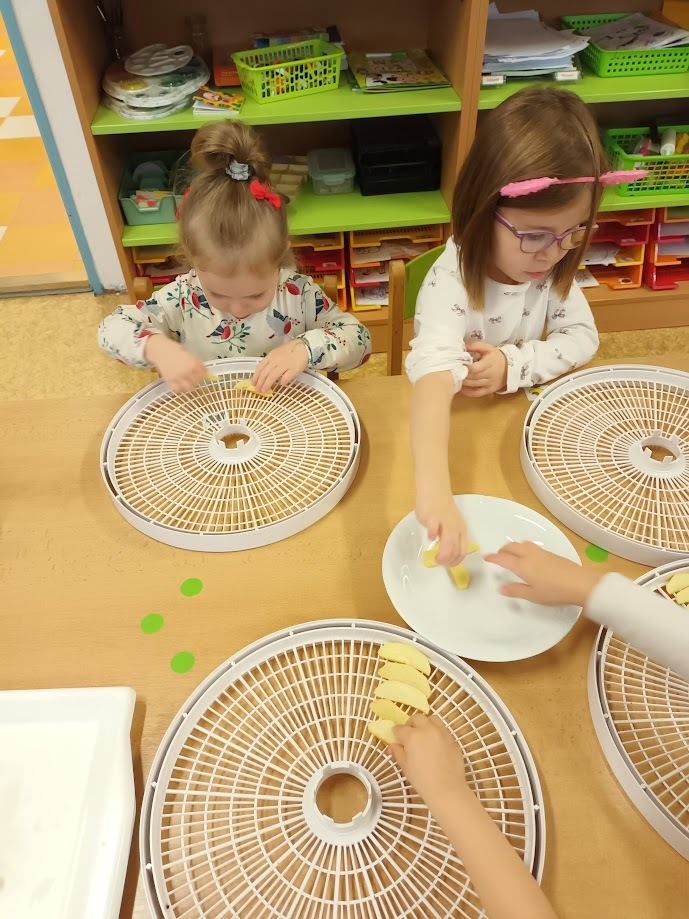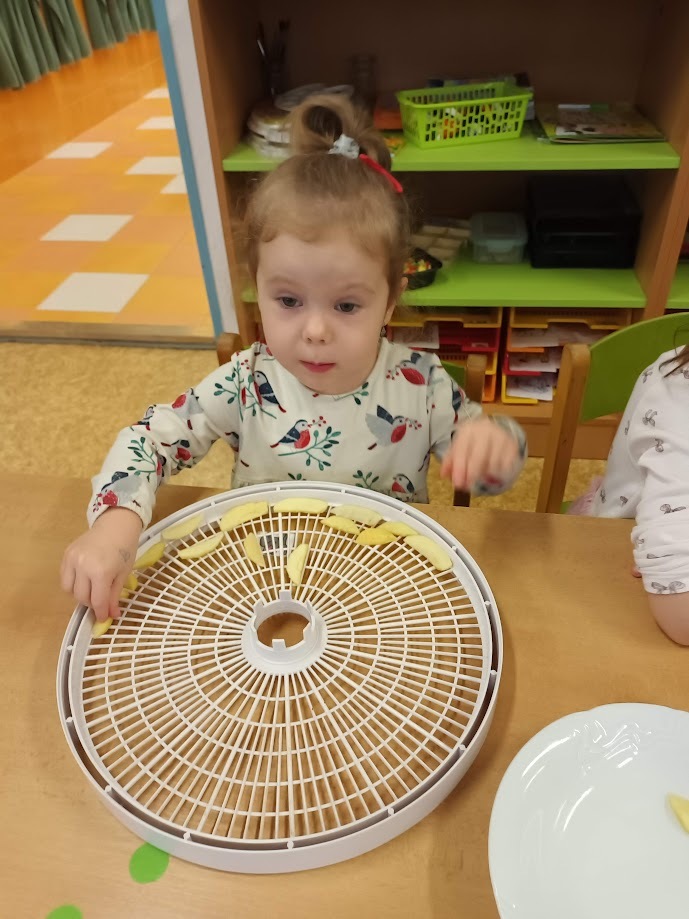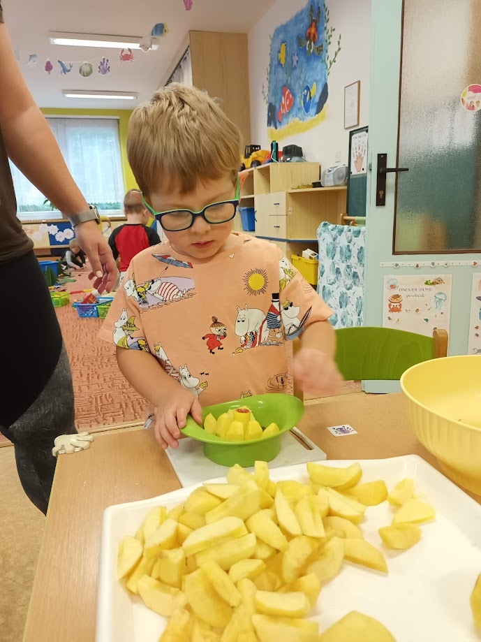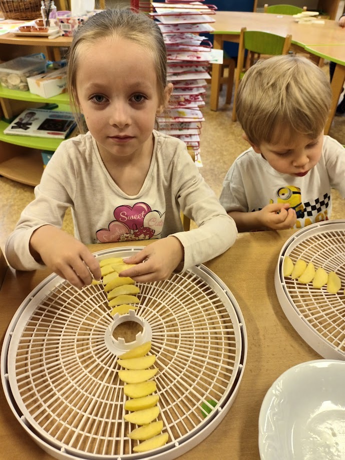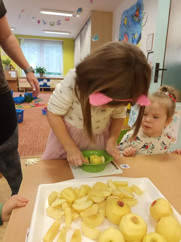 Ve třídě Chobotniček se děti pustily do přípravy křížal z jablíček. Jak na to? Jablka bylo třeba nejprve umýt, poté oloupat, odjadřincovat a nakrájet. Malí pomocníci si dali záležet s narovnáním plátků jablíček do plátů na sušení. Pak už zbývalo jen počkat, až se jablíčka v sušičce na ovoce promění na křížaly.