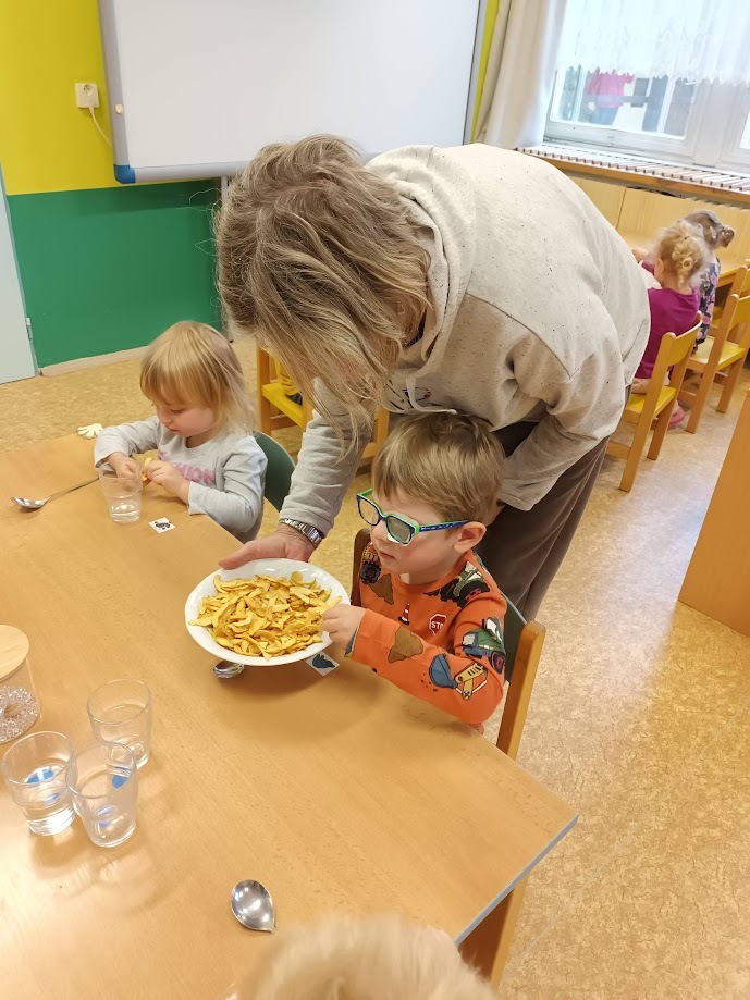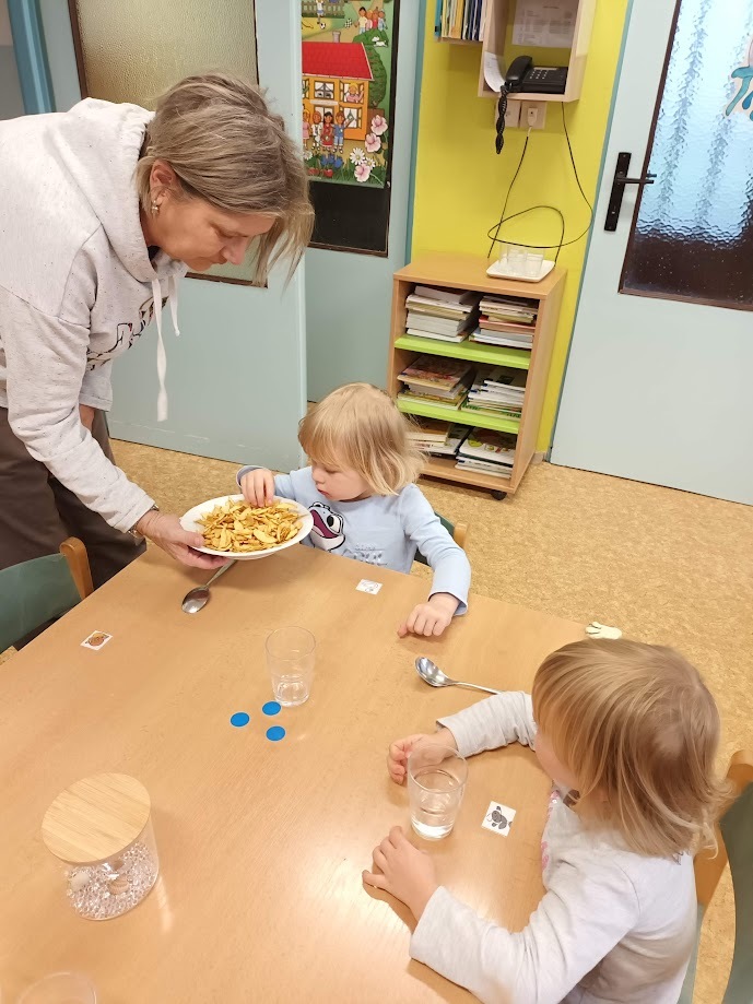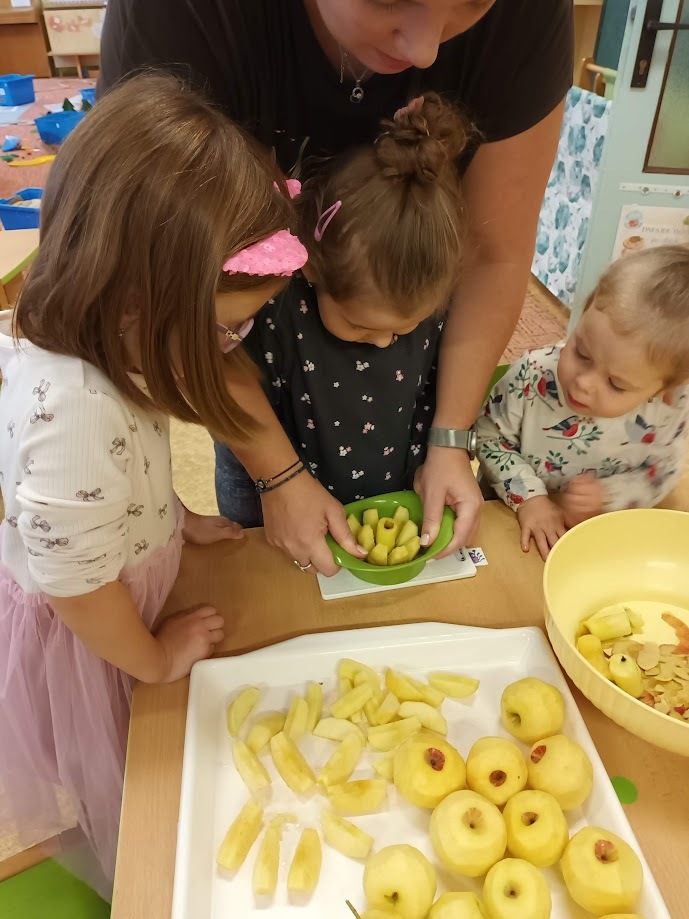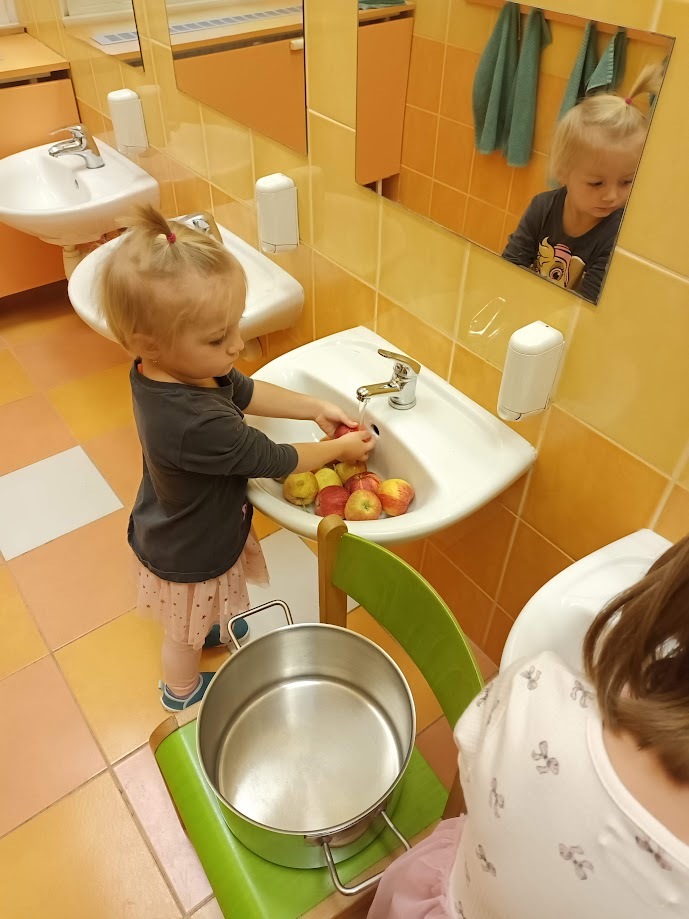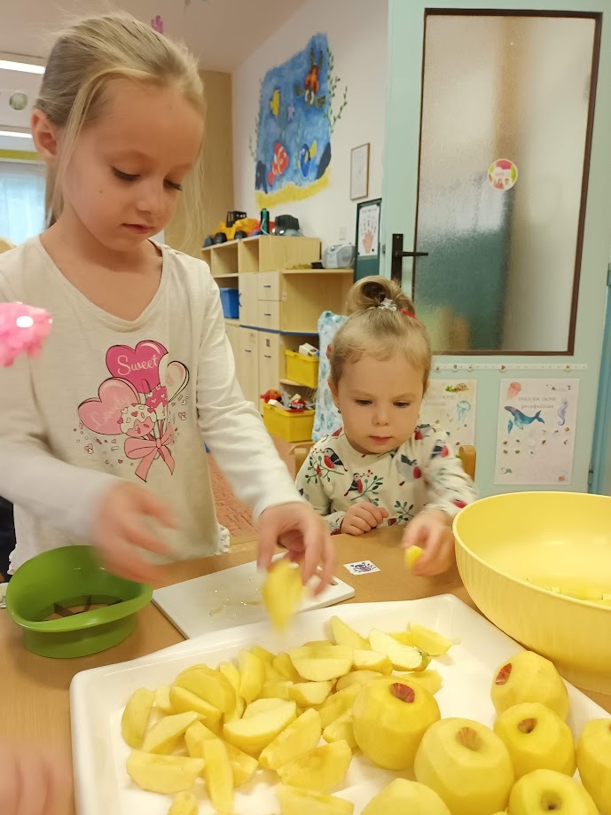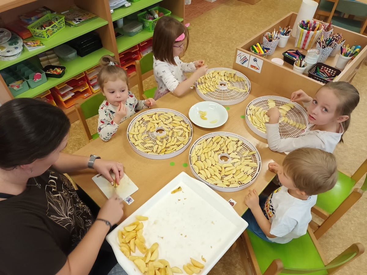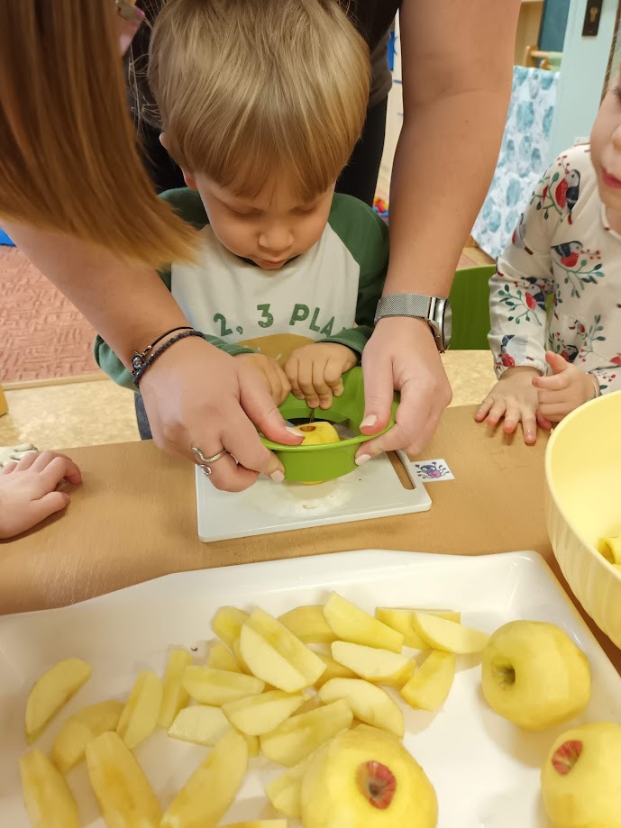 Ve třídě Chobotniček se děti pustily do přípravy křížal z jablíček. Jak na to? Jablka bylo třeba nejprve umýt, poté oloupat, odjadřincovat a nakrájet. Malí pomocníci si dali záležet s narovnáním plátků jablíček do plátů na sušení. Pak už zbývalo jen počkat, až se jablíčka v sušičce na ovoce promění na křížaly.