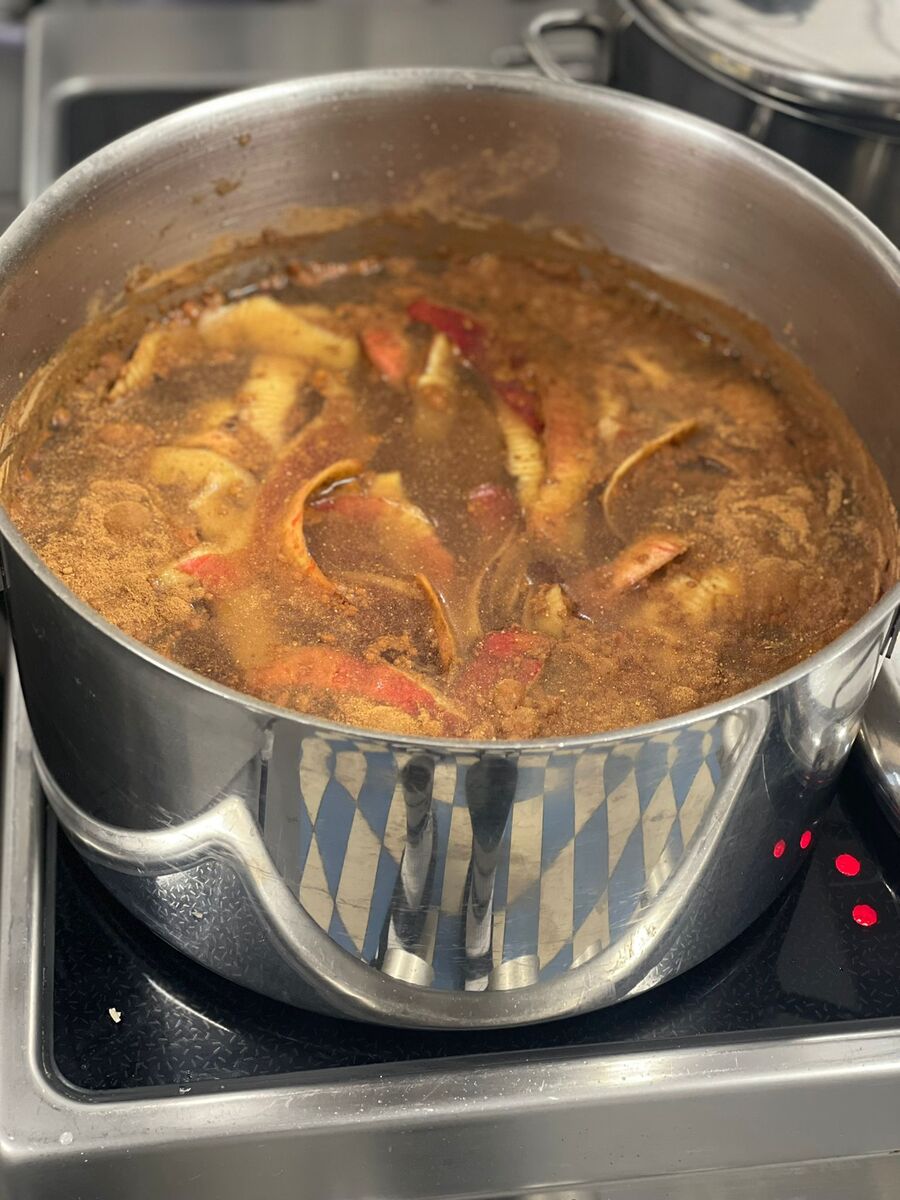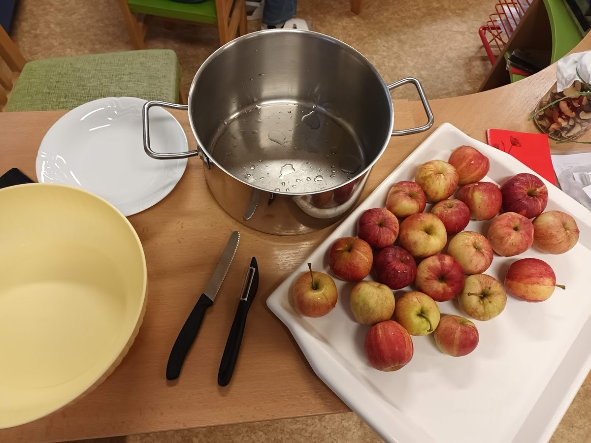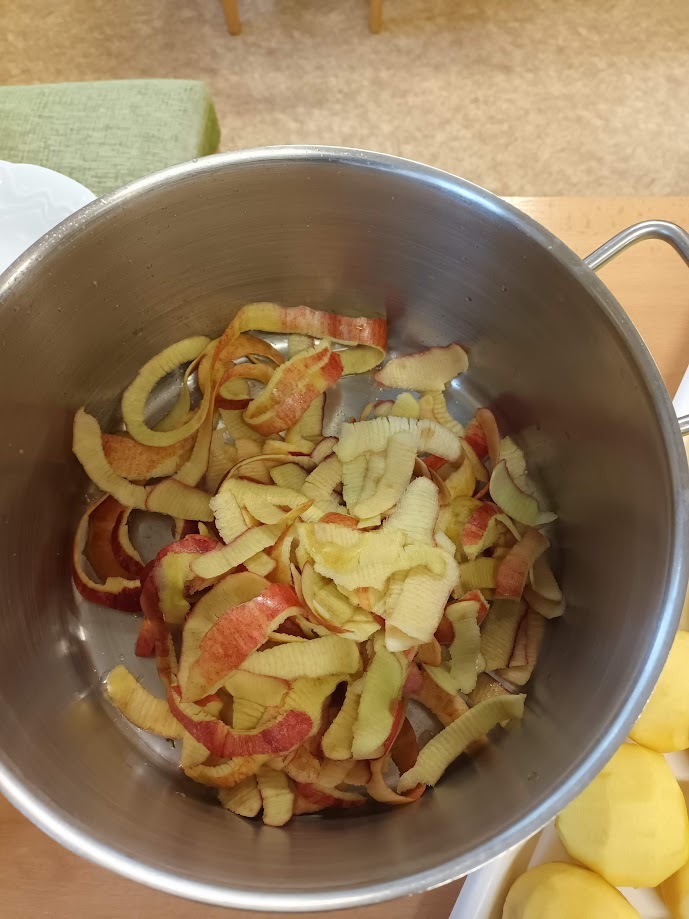 Čekání jsme si zkrátili tím, že jsme si ze slupek ostrouhaných z jablíček, uvařili čaj. Nejen, že se nám tak podařilo využít většinu materiálu, abychom jídlem neplýtvali, ale také jsme se skvěle zahřáli v sychravém podzimním počasí. Stačí přidat jen trošku skořice na provonění a pochoutka je na světě.