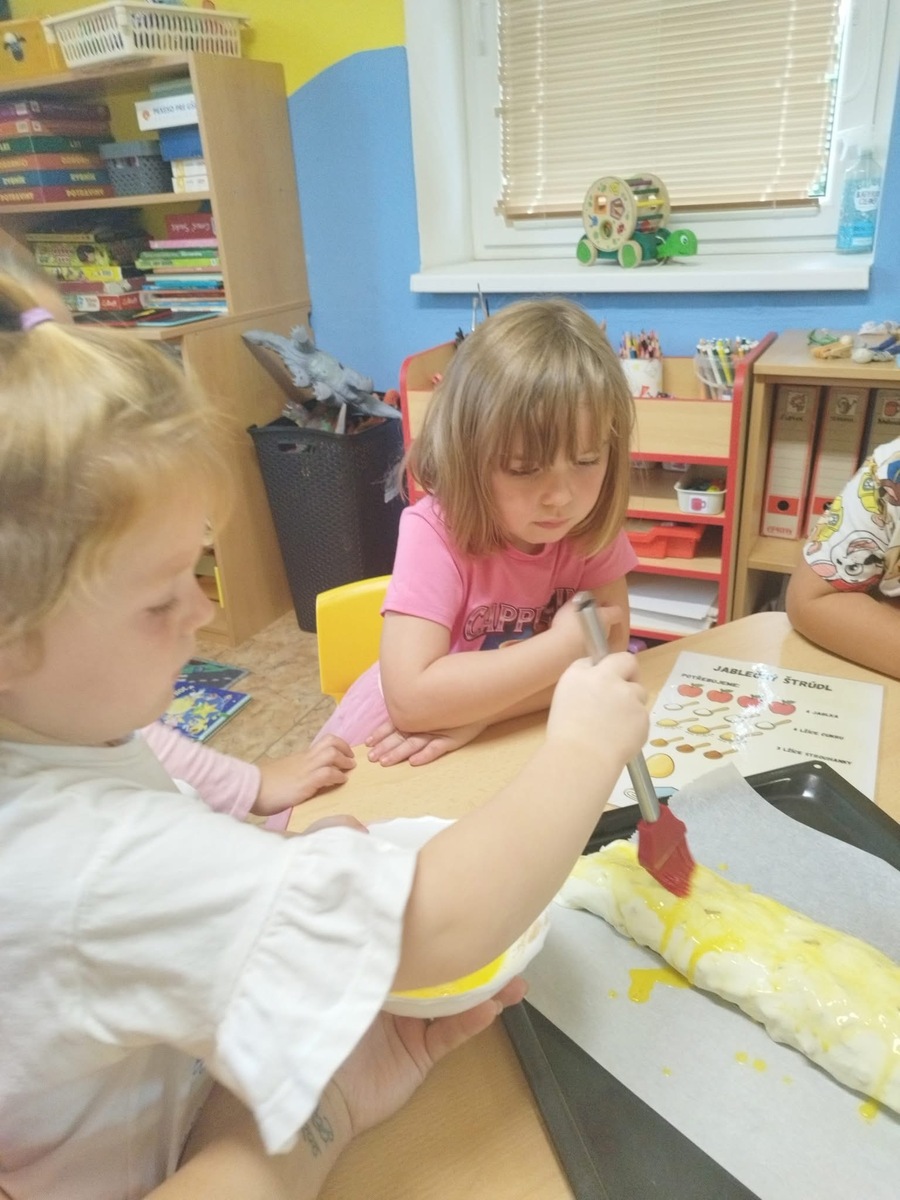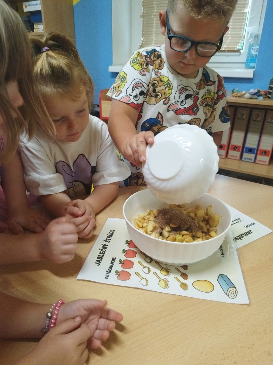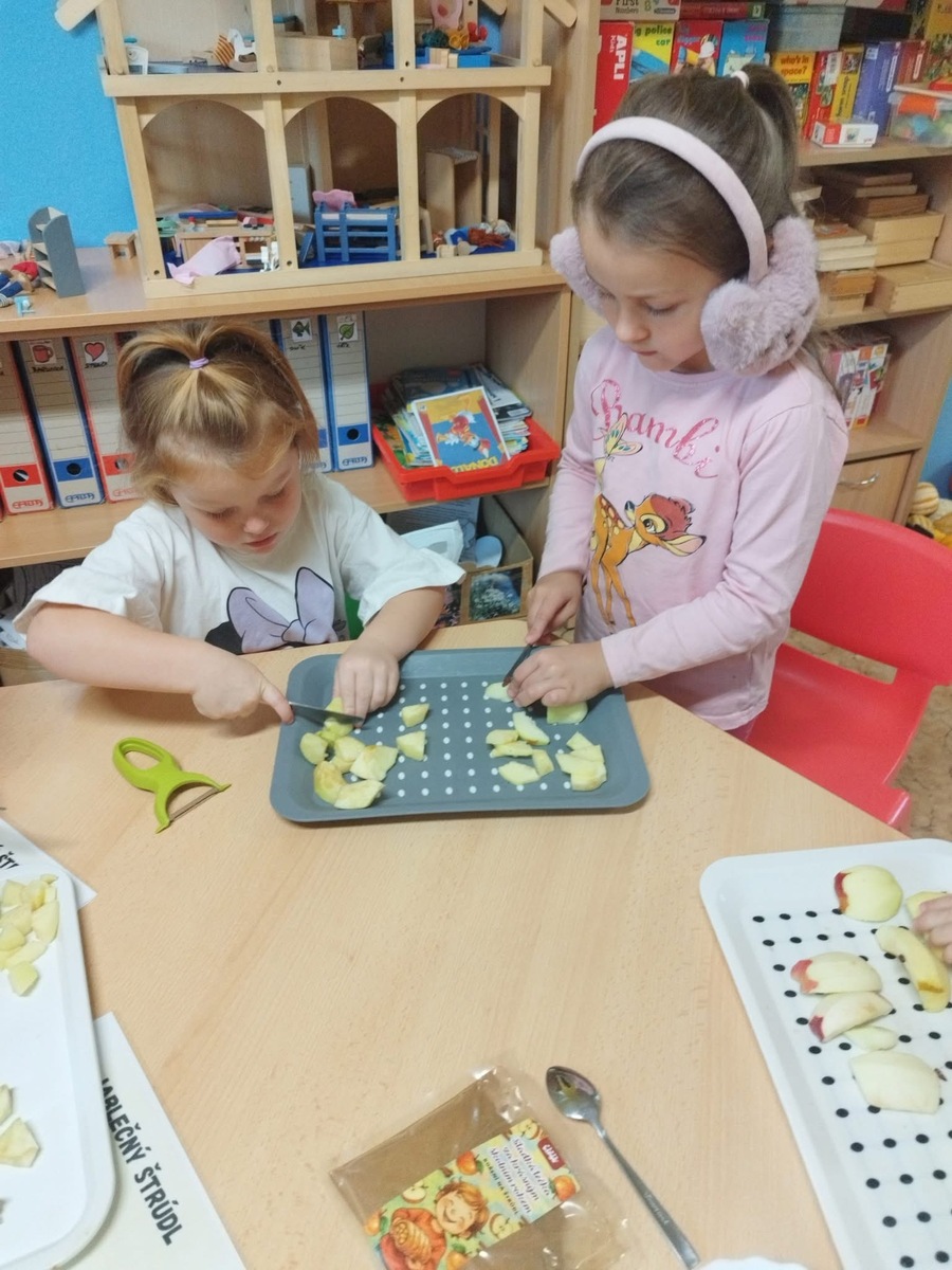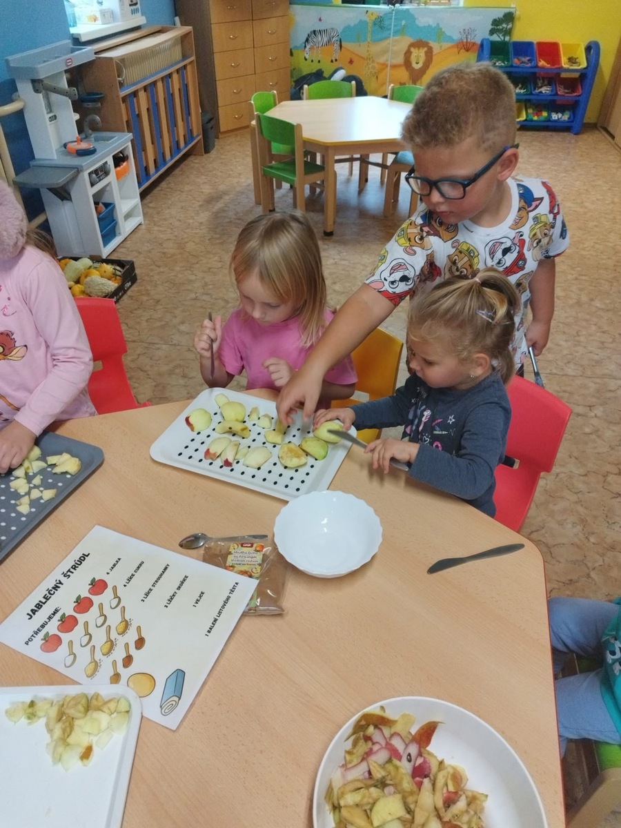 I u nás se pekl klasický "jablečný štrůdlík". Zapojily se úplně všechny děti- i ty nejmenší. Práce šla všem od ruky, protože už jsme zdatní pekaři a proto jsme na jablečné dobrotě pochutnali ještě před obídkem.