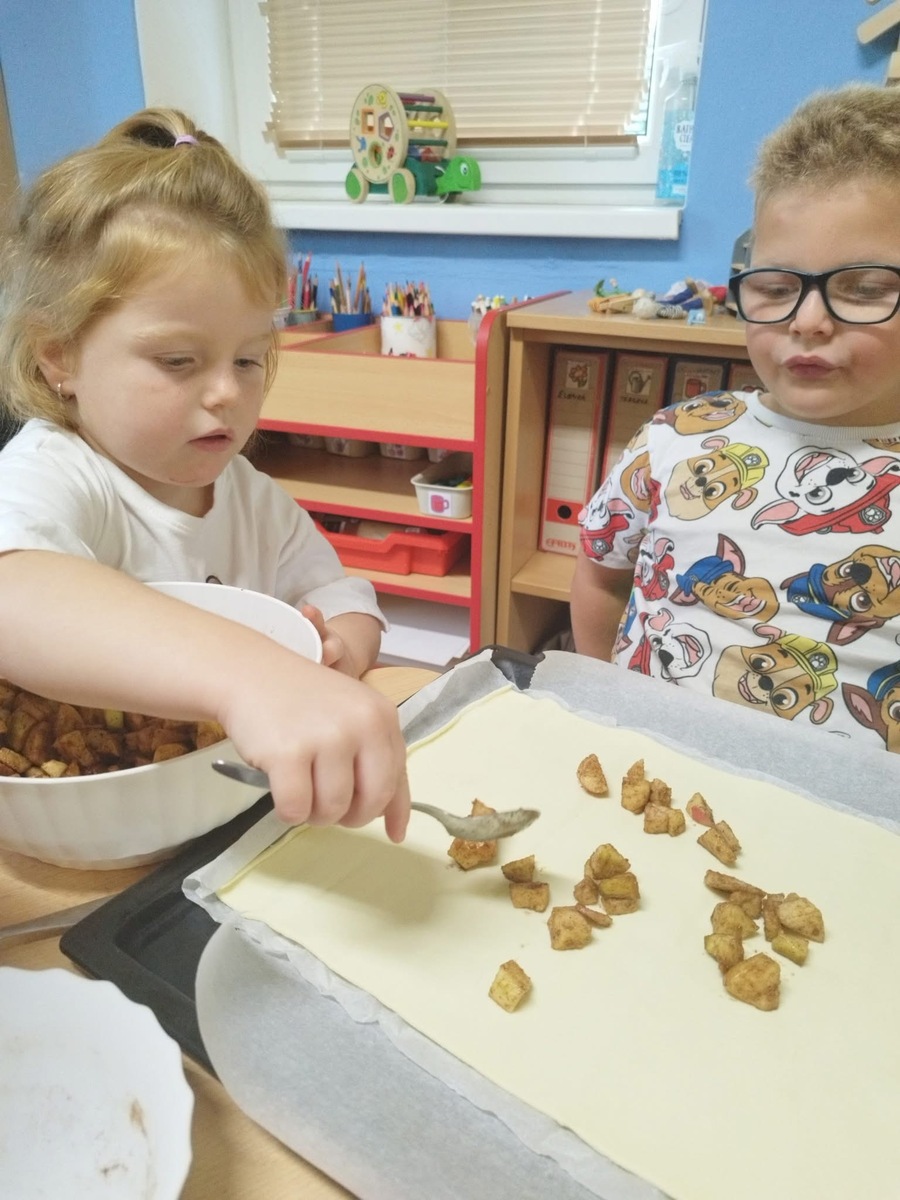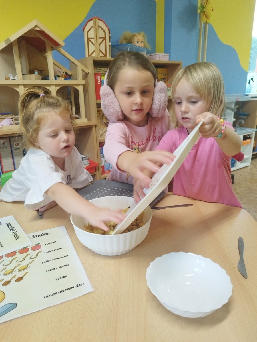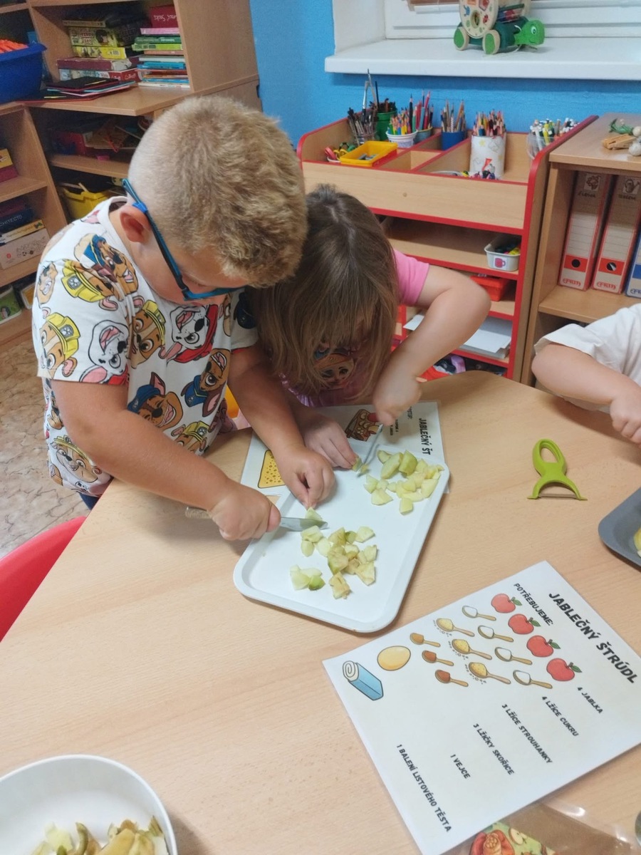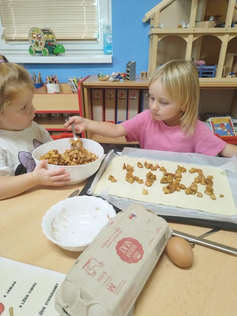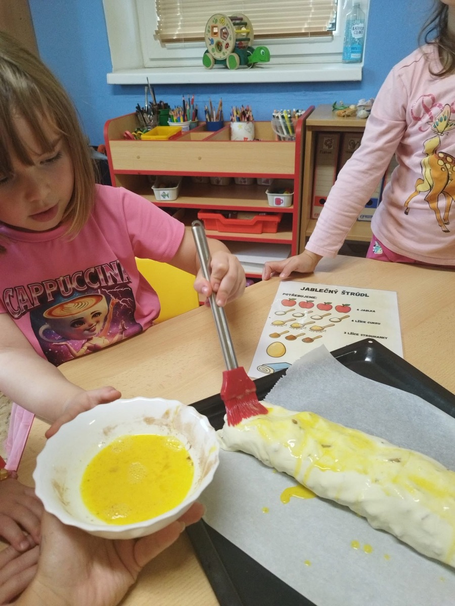 I u nás se pekl klasický "jablečný štrůdlík". Zapojily se úplně všechny děti- i ty nejmenší. Práce šla všem od ruky, protože už jsme zdatní pekaři a proto jsme na jablečné dobrotě pochutnali ještě před obídkem.