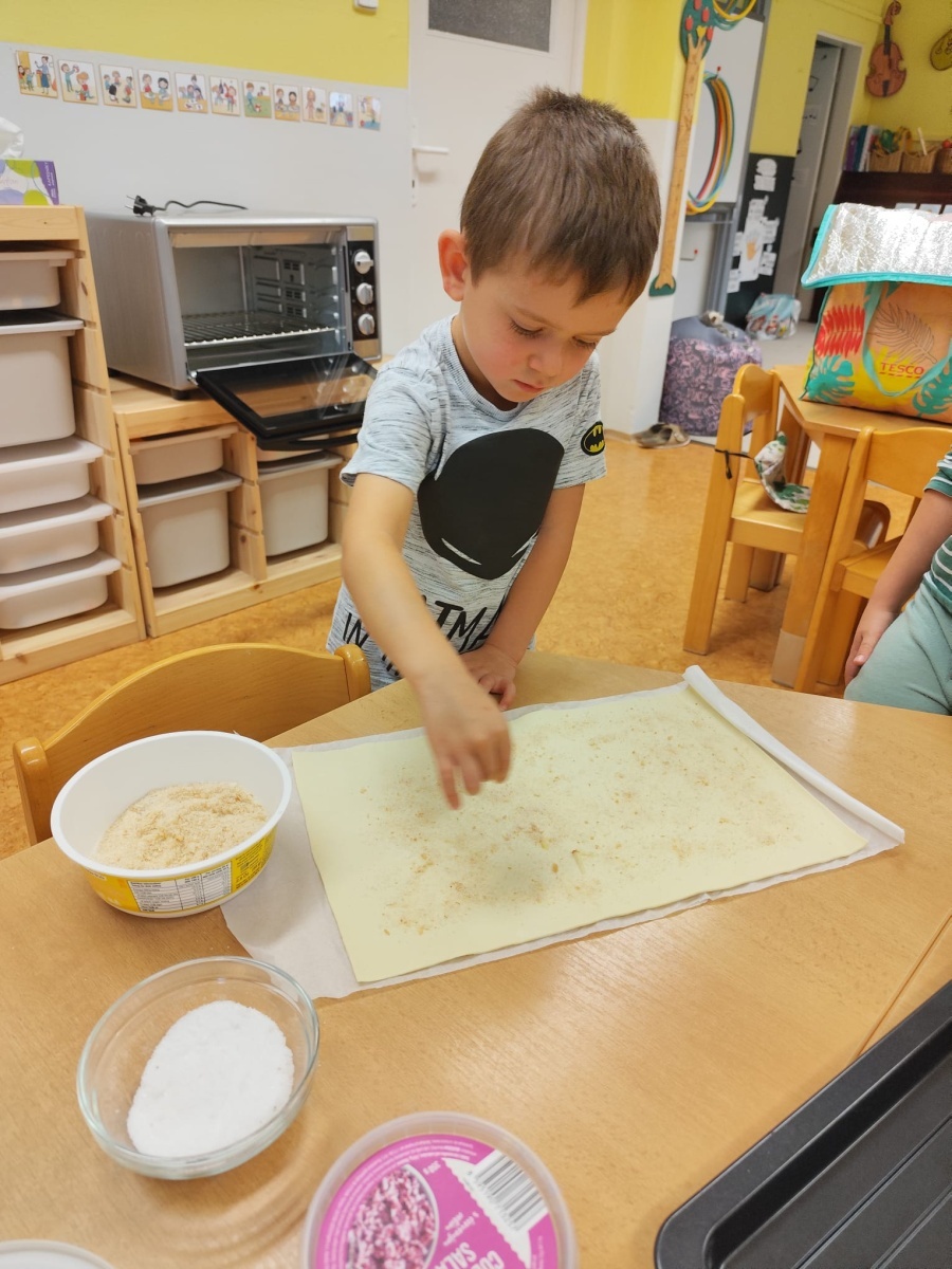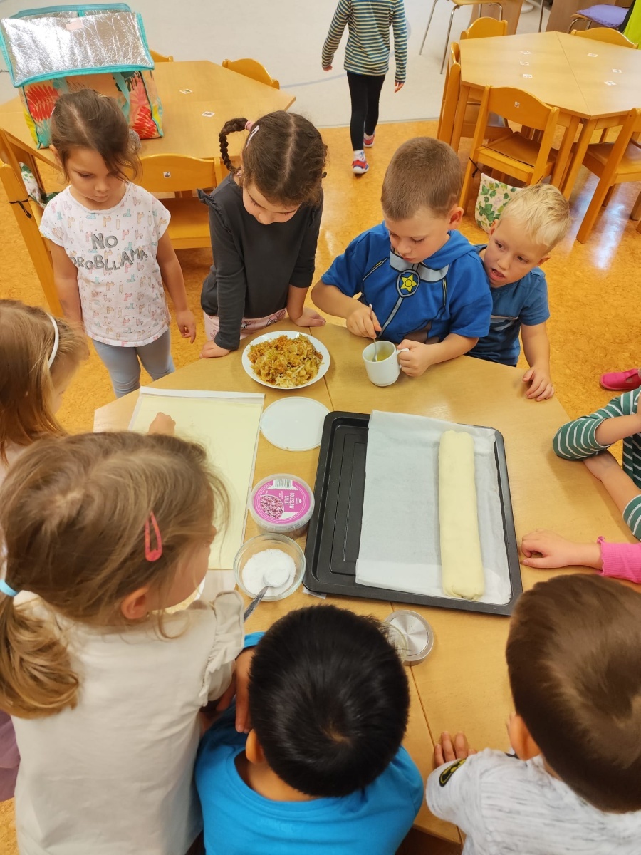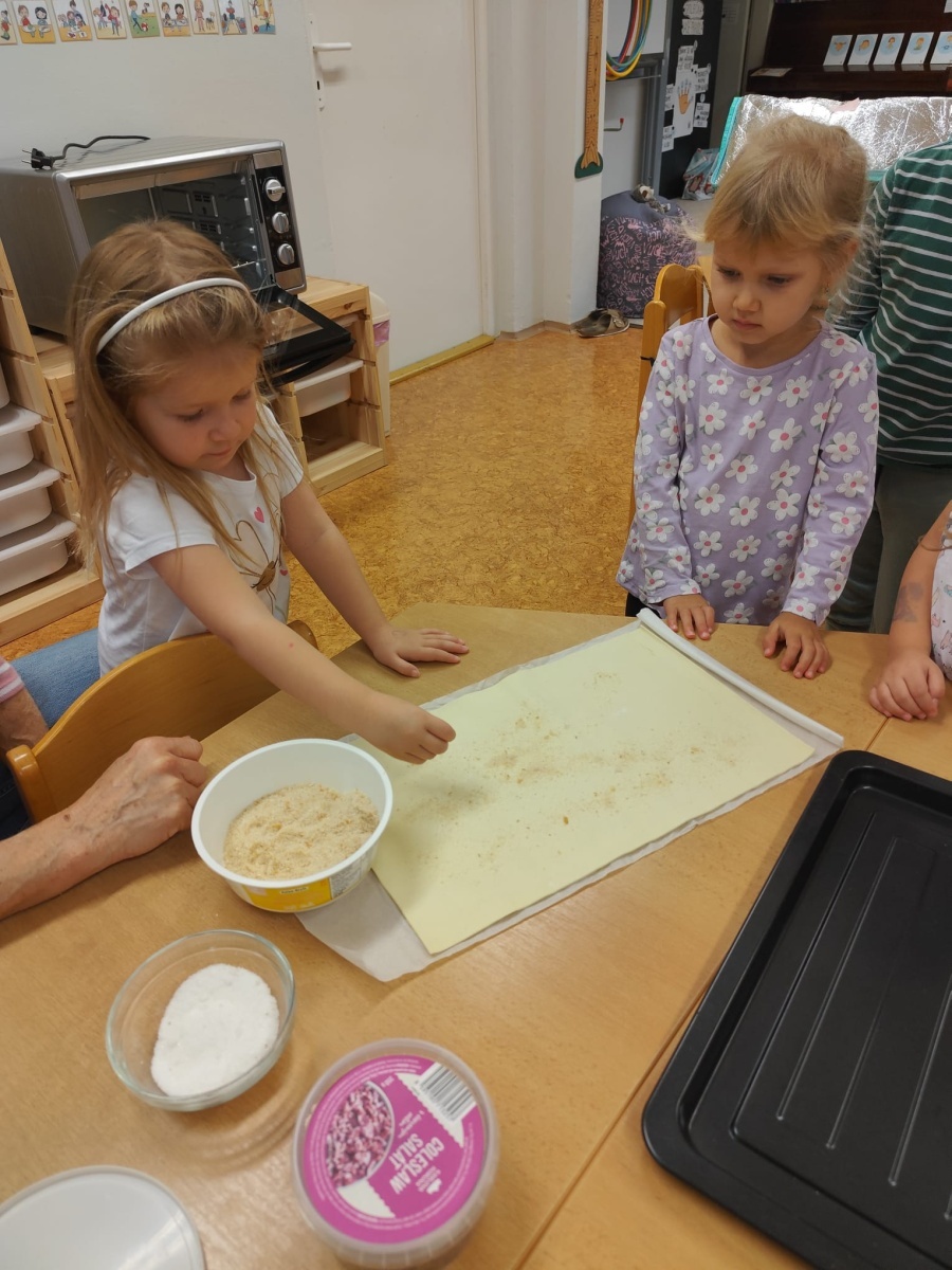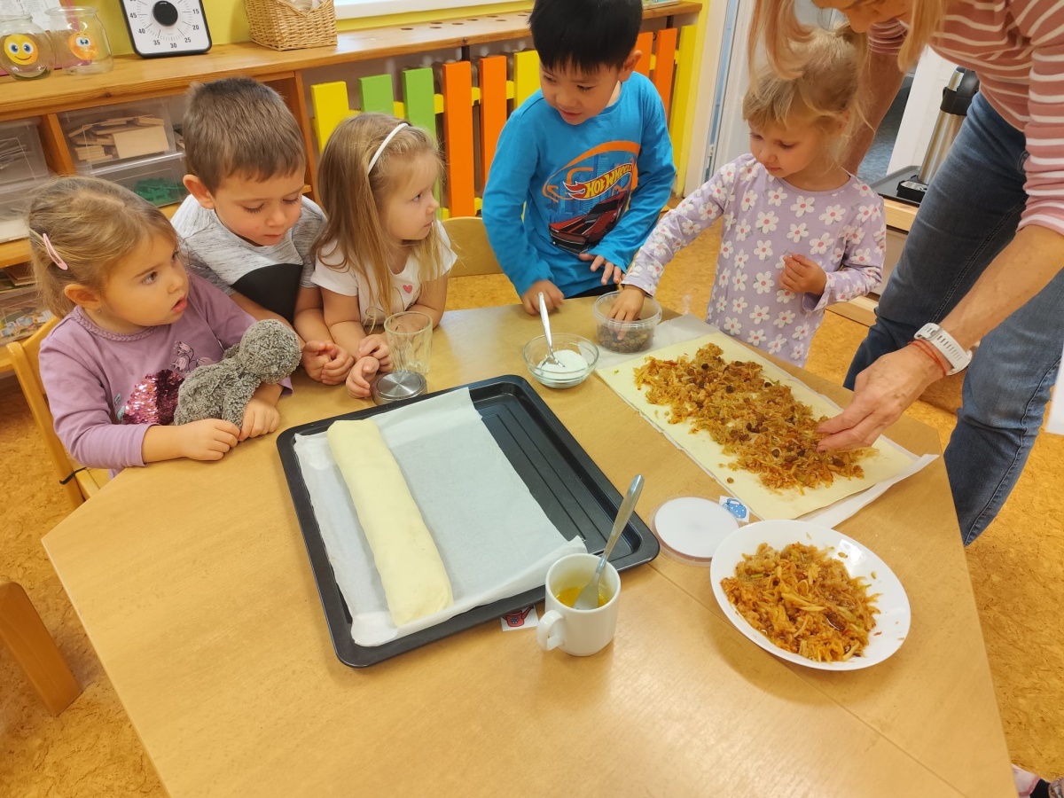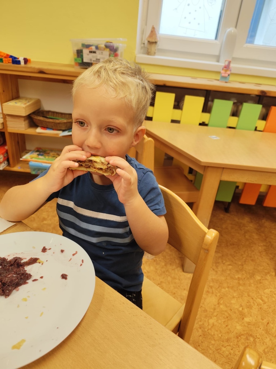 Na Fialkách jsme prožili další voňavé dopoledne – pekli jsme totiž jablečný štrúdl. Společně jsme si povídali o tom, odkud jablka pocházejí, jak rostou a proč jsou zdravá. Poté se děti s chutí pustily do práce – strouhaly jablka, sypaly skořici, přidávaly rozinky a pomáhaly srolovat štrúdl. Celá třída voněla po jablkách a skořici, a když se štrúdl upekl, děti jej s radostí společně ochutnaly. Byl výborný.