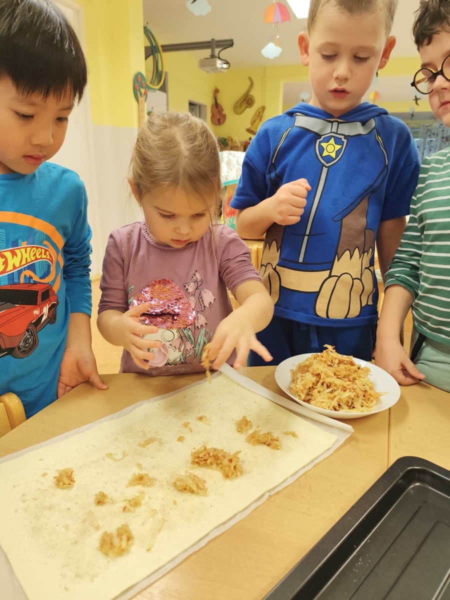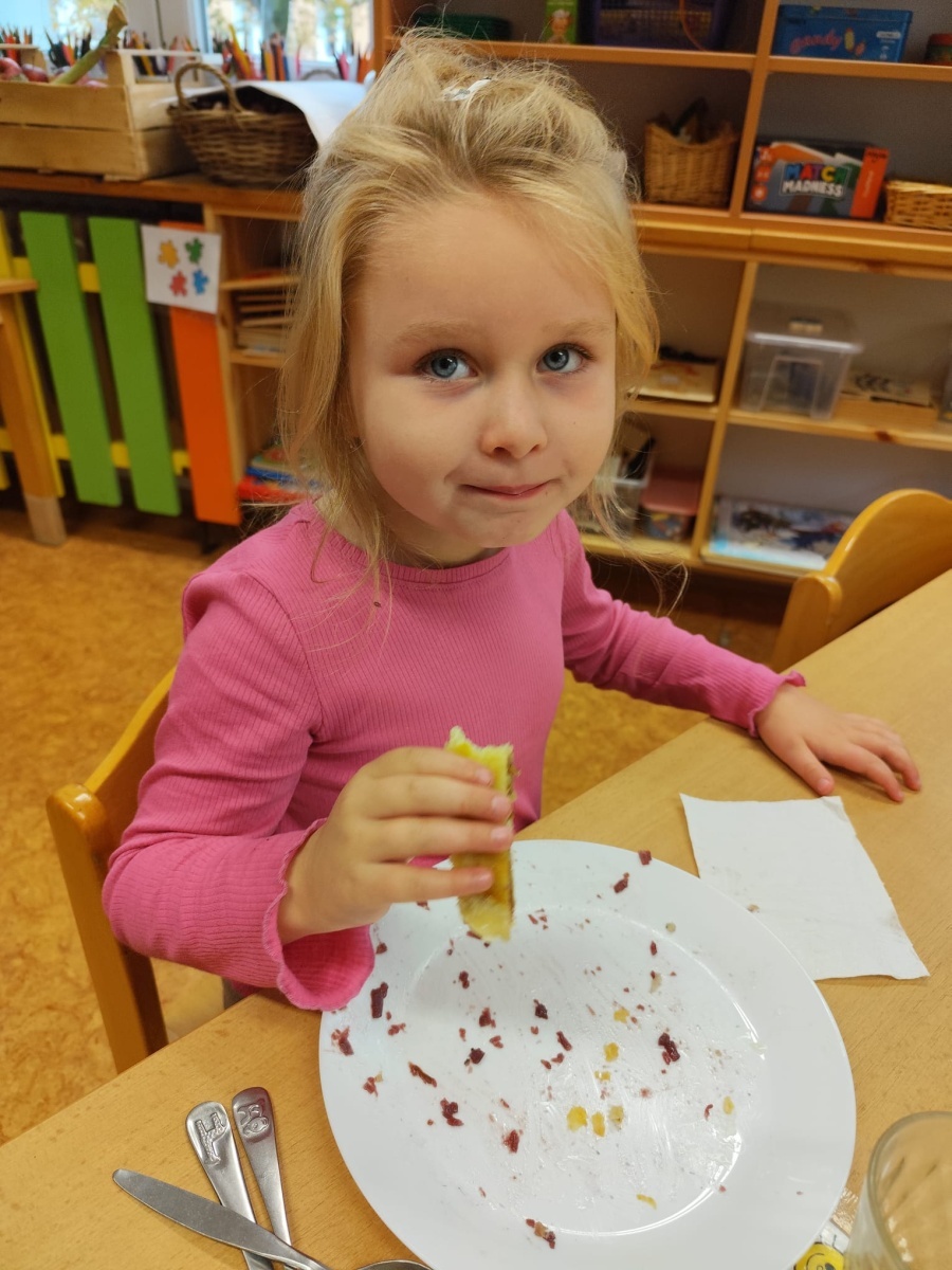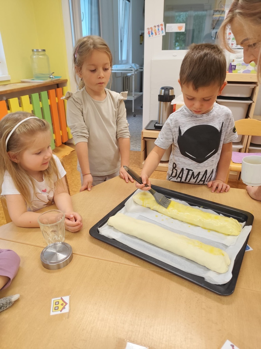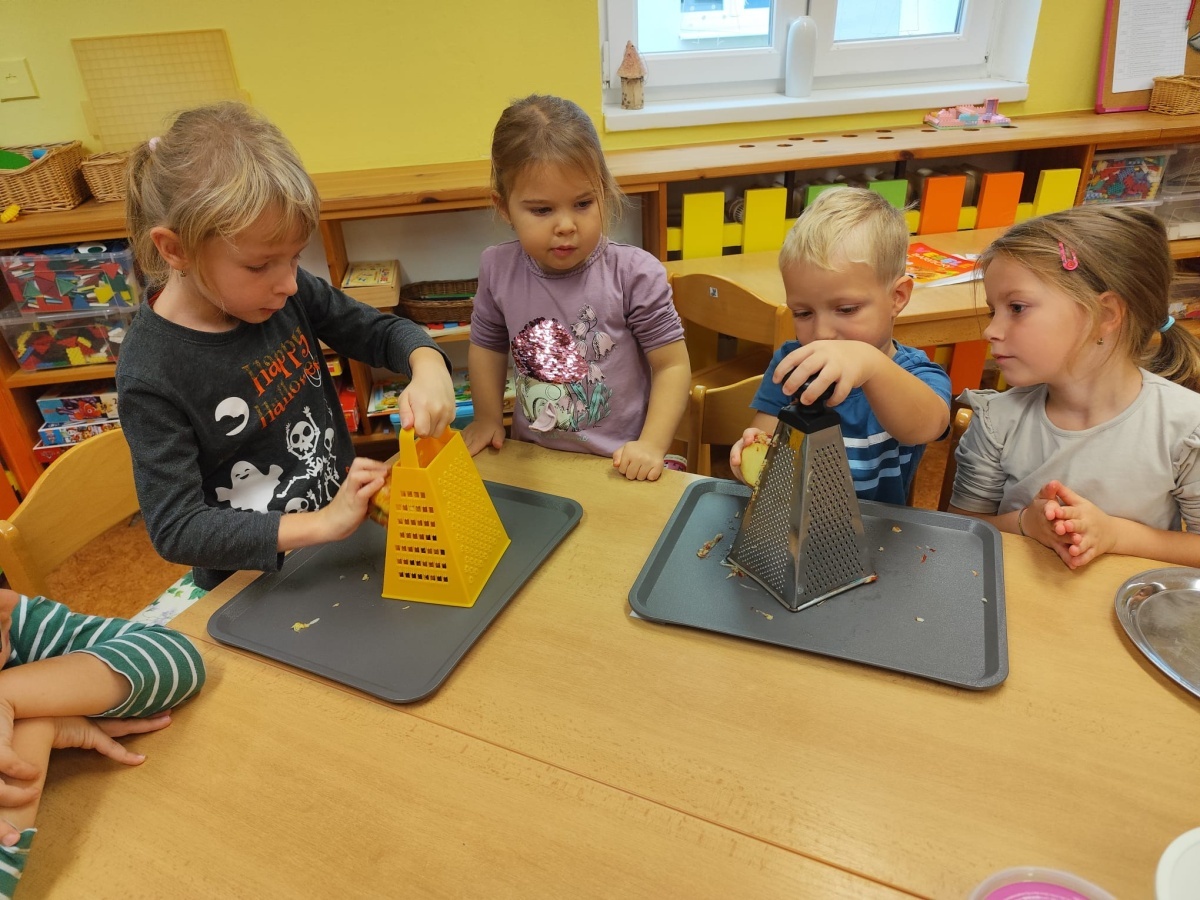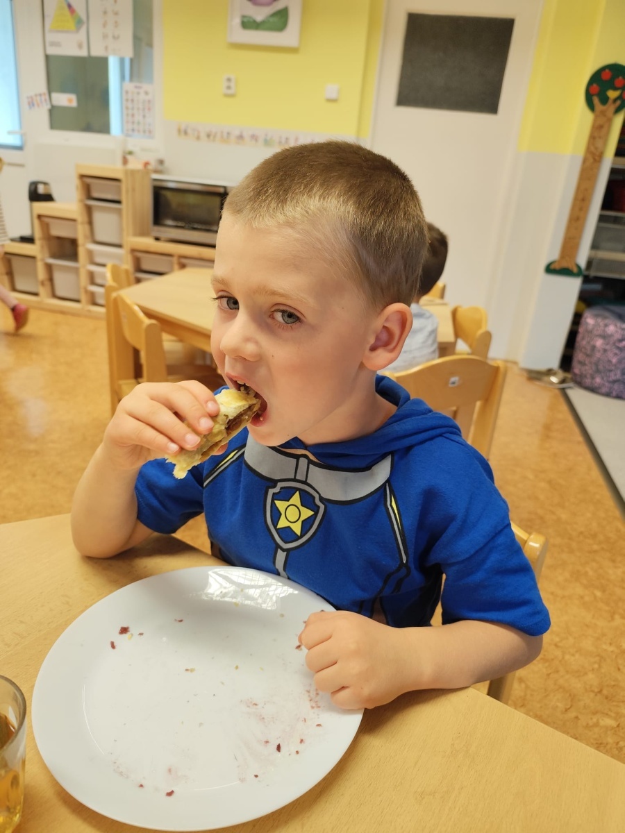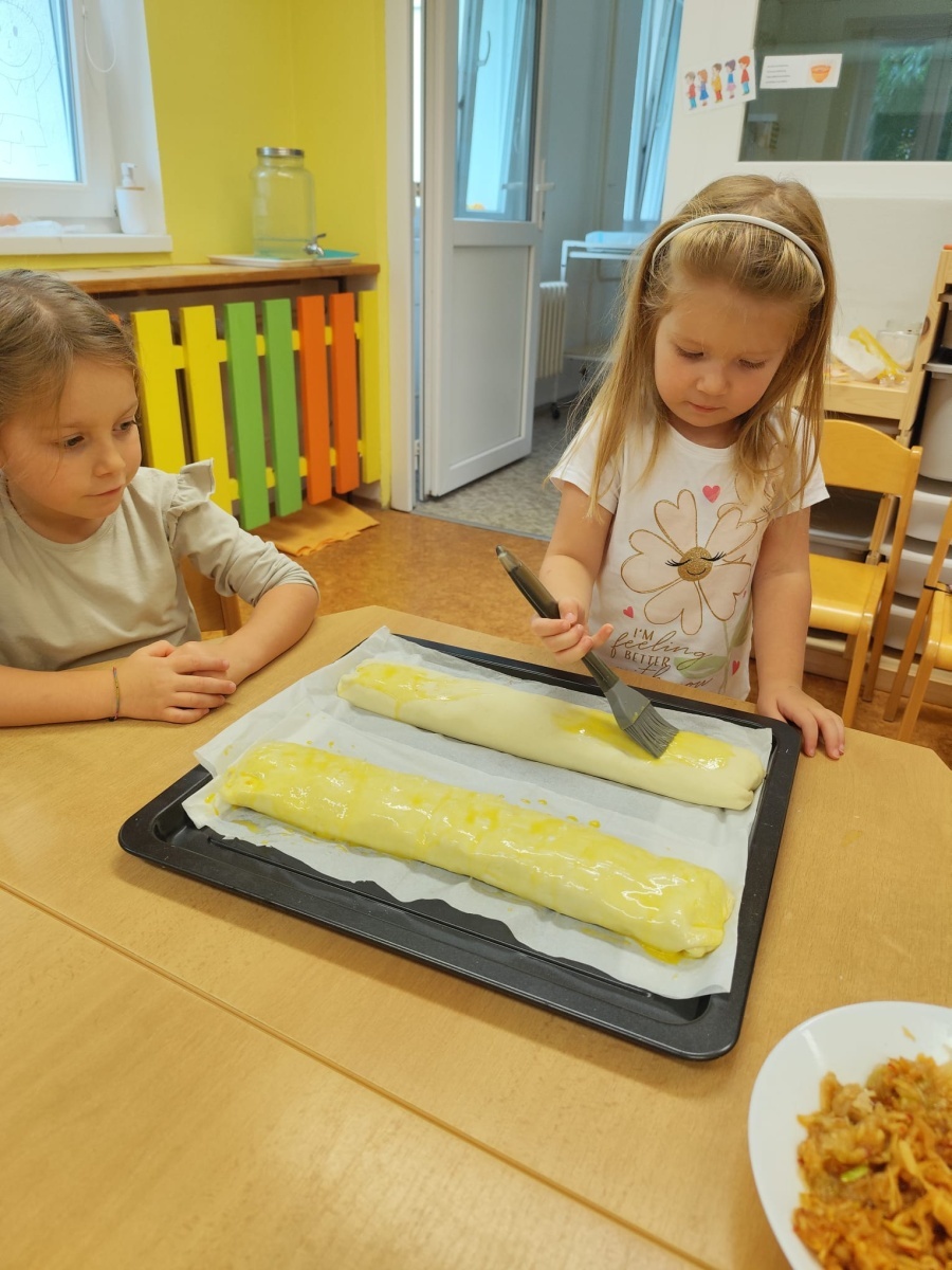 Na Fialkách jsme prožili další voňavé dopoledne – pekli jsme totiž jablečný štrúdl. Společně jsme si povídali o tom, odkud jablka pocházejí, jak rostou a proč jsou zdravá. Poté se děti s chutí pustily do práce – strouhaly jablka, sypaly skořici, přidávaly rozinky a pomáhaly srolovat štrúdl. Celá třída voněla po jablkách a skořici, a když se štrúdl upekl, děti jej s radostí společně ochutnaly. Byl výborný.