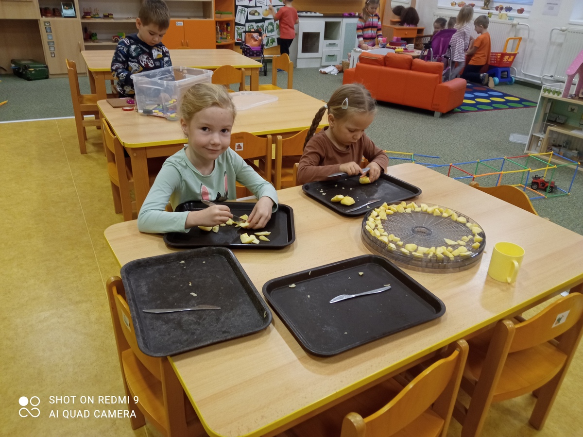 děti jablíčka umývaly a všichni společně je pak krájely a ukládaly na