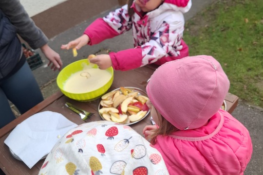 Podzim je tady, tak jsme se rozhodli, že si s dětmi na školní zahradě najdeme jablíčka. Děti si je umyly, nakrájely. Společně s oaní učitelkou připravili těsto. A poté již pomalu smažily na školní zahradě jablíčka v županu. Bylo jich tolik, že děti poté pozvaly všechny kamarády i paní učitelky ze školky.