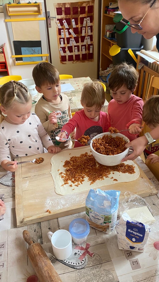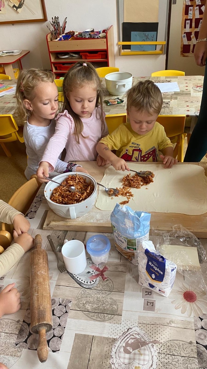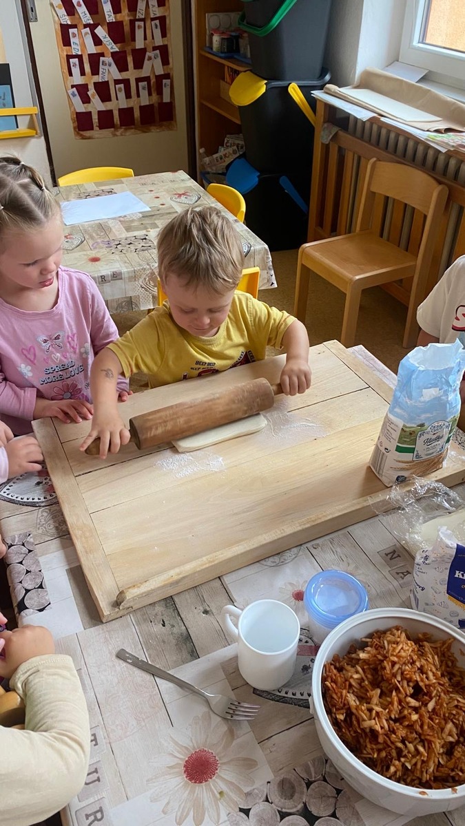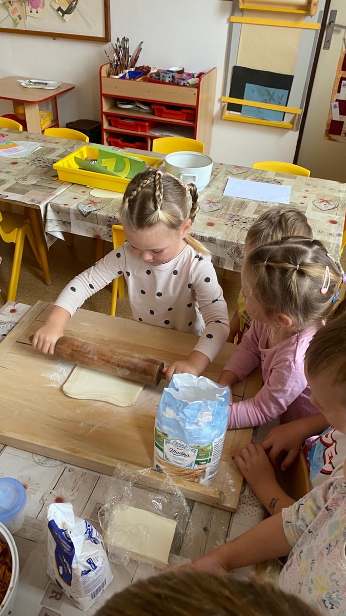 Po návratu se pustily do práce – jablíčka oloupaly, nakrájely a připravily těsto. Každý si zkusil těsto vyválet a naplnit voňavými jablky a potřít vajíčkem .
