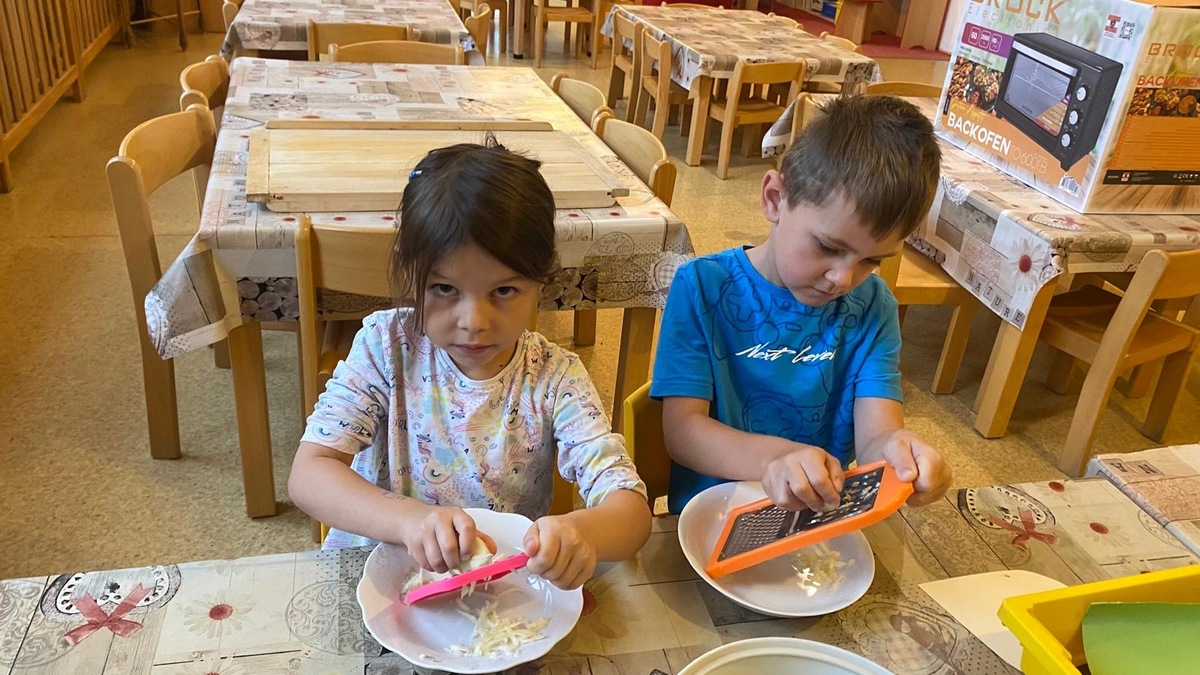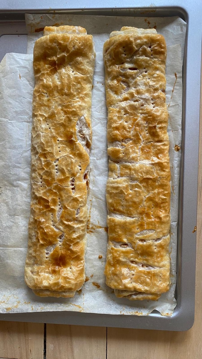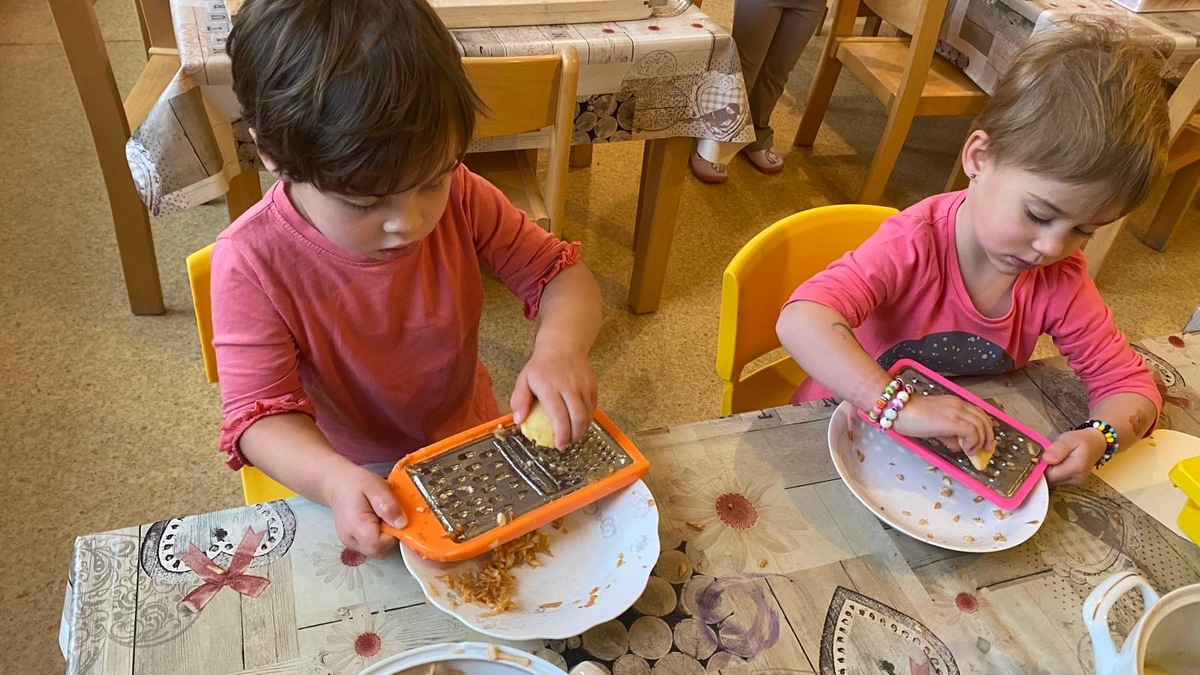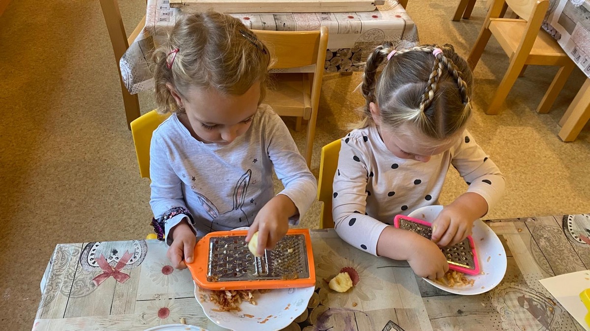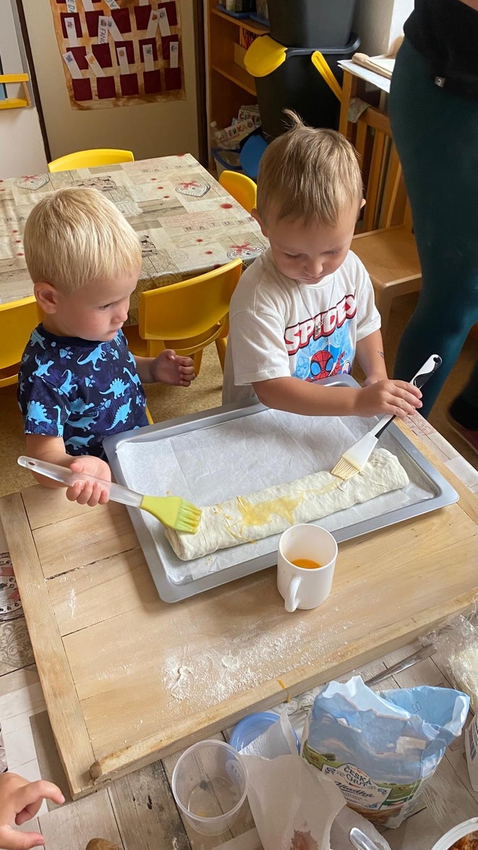 Po návratu se pustily do práce – jablíčka oloupaly, nakrájely a připravily těsto. Každý si zkusil těsto vyválet a naplnit voňavými jablky a potřít vajíčkem .