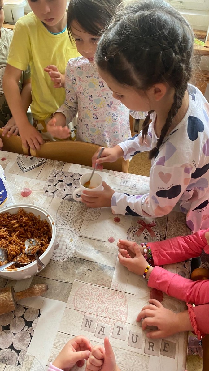 Když se štrúdl pekl, celá kuchyň voněla podzimem. A jakmile byl hotový, všichni si na něm s chutí pochutnali. Byl to krásný den plný práce, smíchu a sladké odměny.