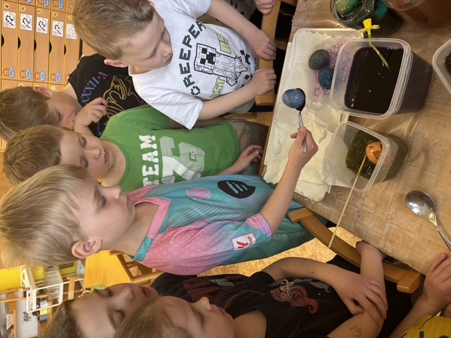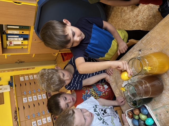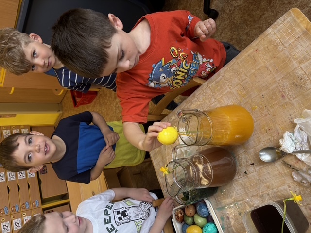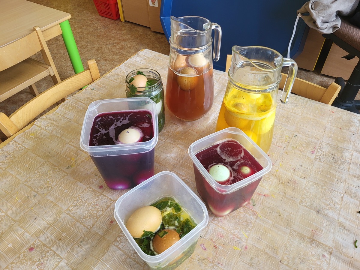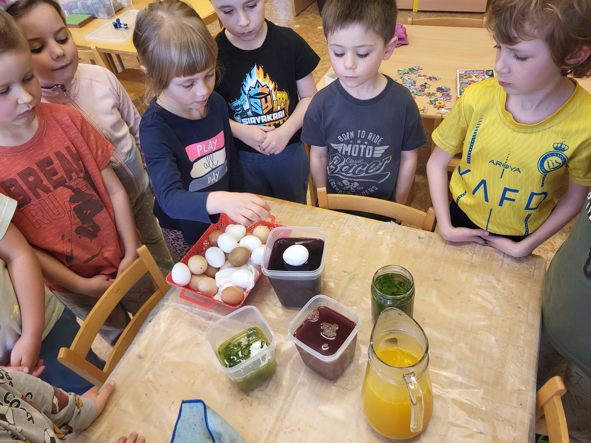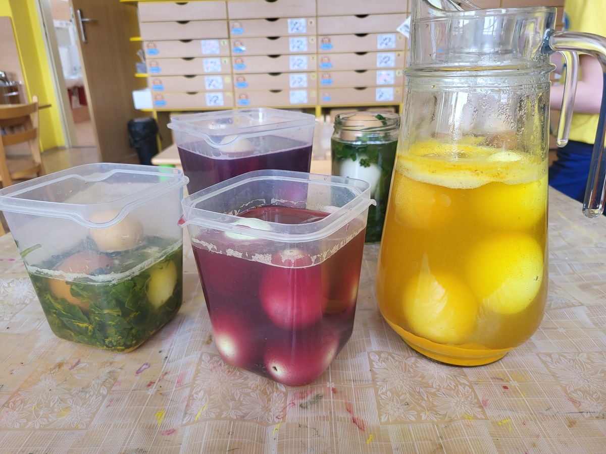 Připravili jsme si barviva - zelené: petržel a špenát (který jsme nezapomněli ochutnat), modré: červené zelí, žluté: kurkuma, hnědé: černý čaj. Suroviny jsme natrhali a povařili ve vodě. Některé nálevy jsme zkusili smíchat. Nechali jsme je vychladnout a potopili do nich vajíčka. Pak jsme čekali do druhého dne.... a druhý den ráno jsme lovili krásně a různě obarvená vajíčka. Porovnávali jsme, jak vypadá nabarevné bílé a hnědé vajíčko. Obarvená poucha jsme využili na velikonoční dekorace.