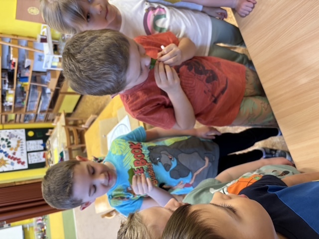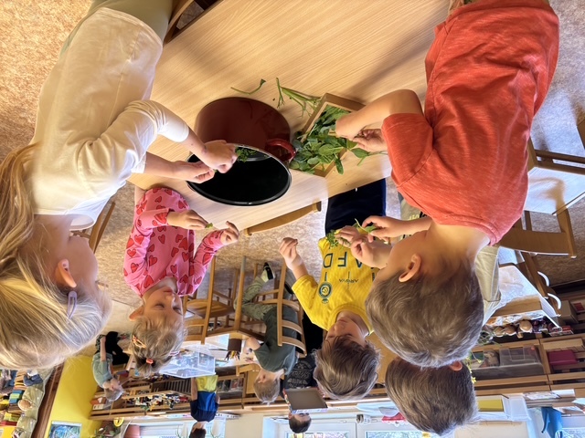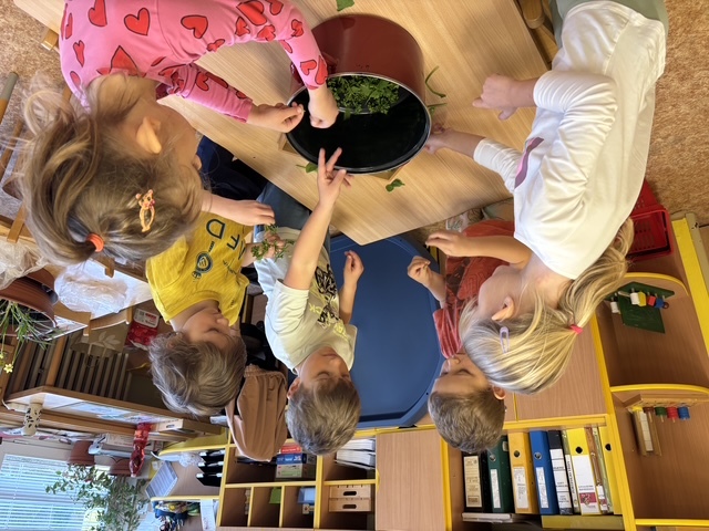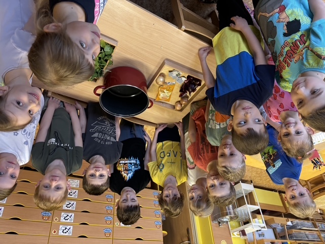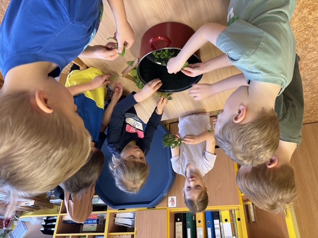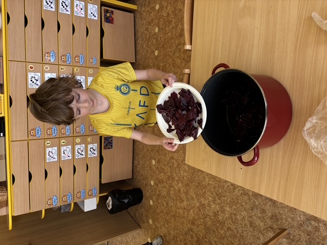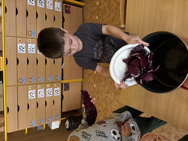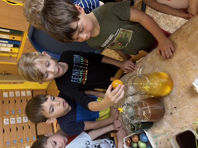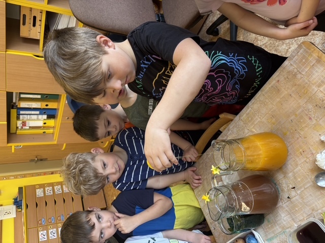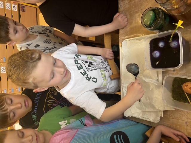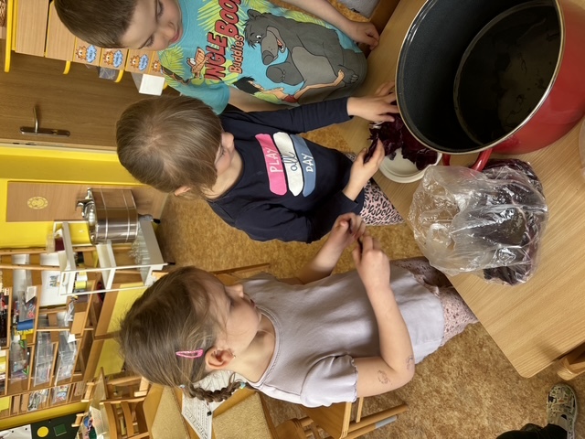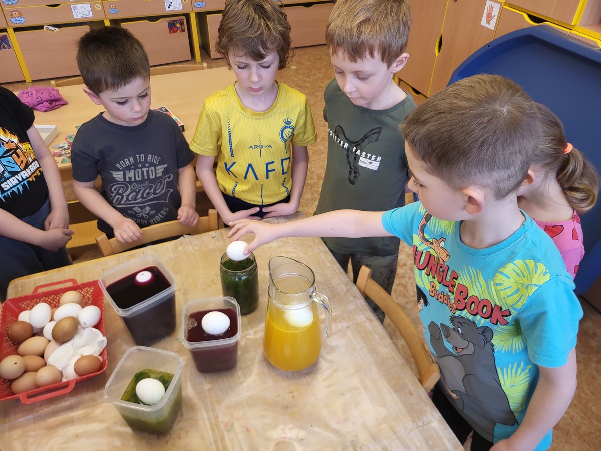 Připravili jsme si barviva - zelené: petržel a špenát (který jsme nezapomněli ochutnat), modré: červené zelí, žluté: kurkuma, hnědé: černý čaj. Suroviny jsme natrhali a povařili ve vodě. Některé nálevy jsme zkusili smíchat. Nechali jsme je vychladnout a potopili do nich vajíčka. Pak jsme čekali do druhého dne.... a druhý den ráno jsme lovili krásně a různě obarvená vajíčka. Porovnávali jsme, jak vypadá nabarevné bílé a hnědé vajíčko. Obarvená poucha jsme využili na velikonoční dekorace.