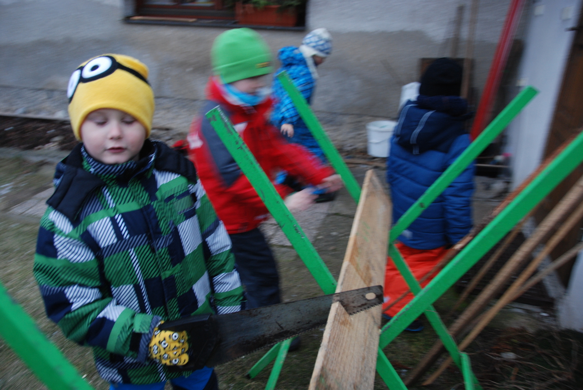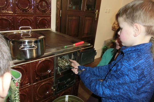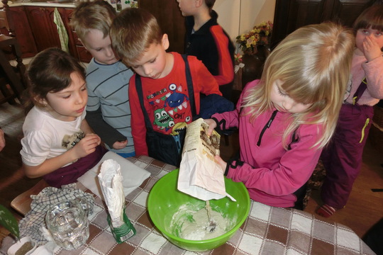 Na dvorku na naše pány kluky čekala připravená koza (ne ta živá, cesta mléka nás teprve čekáJ) a pila. Takže žádné lelkování kluci a vzhůru do práce, potřebujeme roztopit kamna! Holky hospodyňky, než kluci zatopili v peci, zadělaly těsto na chlebánky. Přitom zjistily, jaký je rozdíl mezi moukou bílou a celozrnnou, i to, že kvasnice rády pracují v teploučku. A teploučko už se linulo i od kachlových kamen. Však bylo na čase, aby kluci vystřídali holky v hnětení těsta, protože provzdušnit ho dalo docela dost práce. Než se trouba řádně nahřála a těsto nakynulo, měli jsme i my konečně čas na posilněnou. A protože my ve školce umíme cestovat časem nazpátek do dob minulých, ale i dopředu – simsalabim… a těsto bylo krásně nakynuté. Rozdělili jsme si ho na tolik dílů jako dětí a každý si mohl vytvarovat jeden bochánek. Než se chlebánky upekly, zbylo ještě dost času, aby se děti proběhly na čerstvém, i když trochu mrazivém vzduchu. Ale o to více nám naše chlebánky chutnaly..