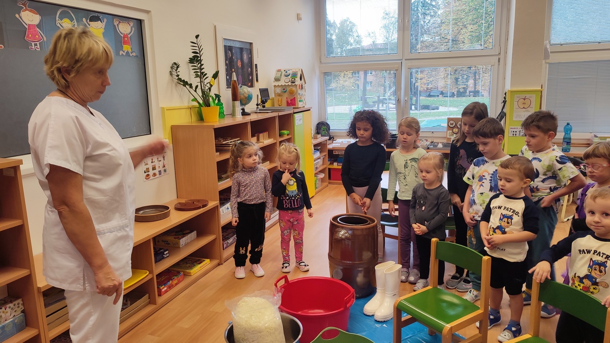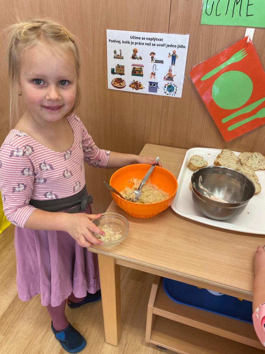 Naše paní kuchařka dětem ukázala, jak se zelí krouhá, vysvětlila postup nakládání a povídala o jeho zdravotních benefitech. Děti tak zjistily, že zelí není jen „obyčejná zelenina“, ale malý zázrak pro zdraví – a ještě se u toho dobře pobavily.