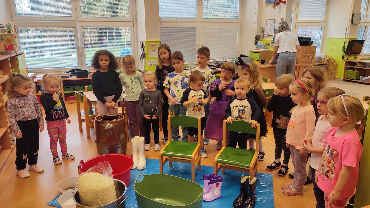 Do školky jsme letos pořídili pořádnou zásobu vitamínů – celkem 60 kilogramů zelí. Úkol byl jasný: děti měly zelí pošlapat, aby se mohlo naložit do velkého hlíněného zelňáku.