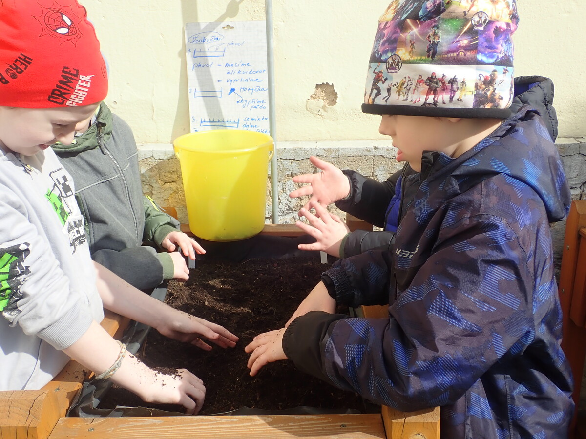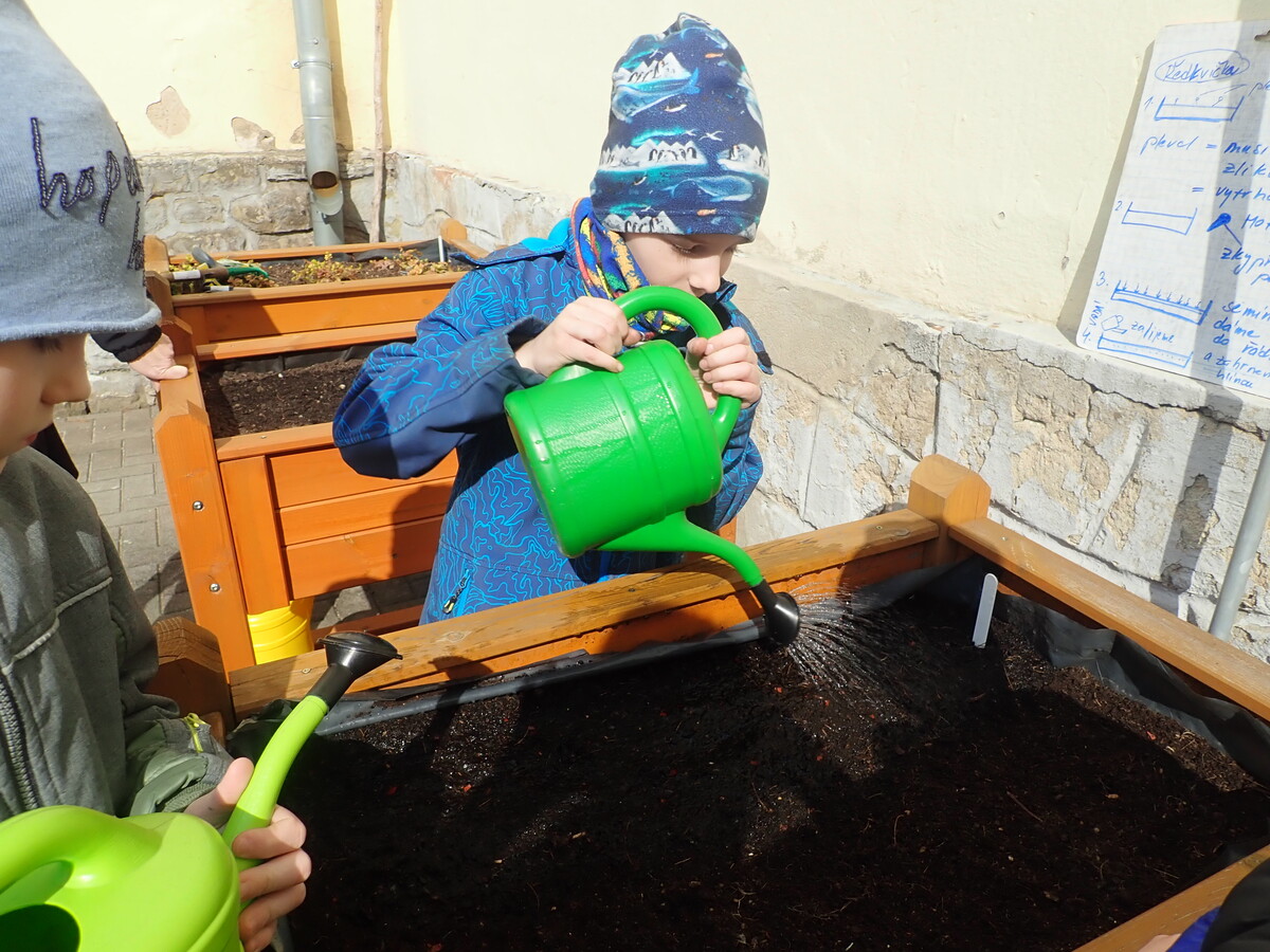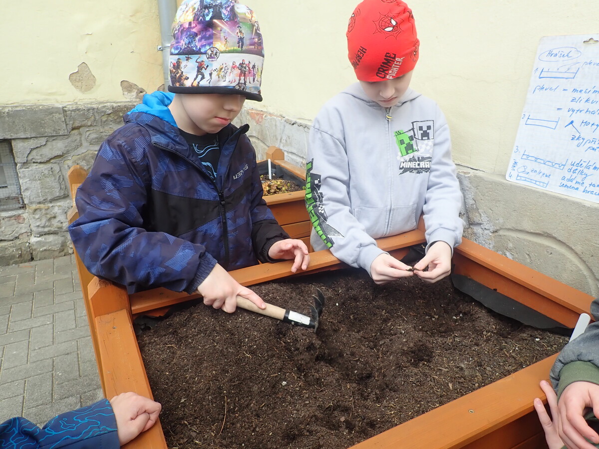 Naši žáci se opět pustili do jarních prací na zahradě a školním dvorku. Na školním dvorku mají žáci první a druhé třídy vyvýšené záhony, o které se celý školní rok starají. Teď vyseli ředkvičku a hrášek a taky stihli okopat česnek, který zasadili už na podzim.