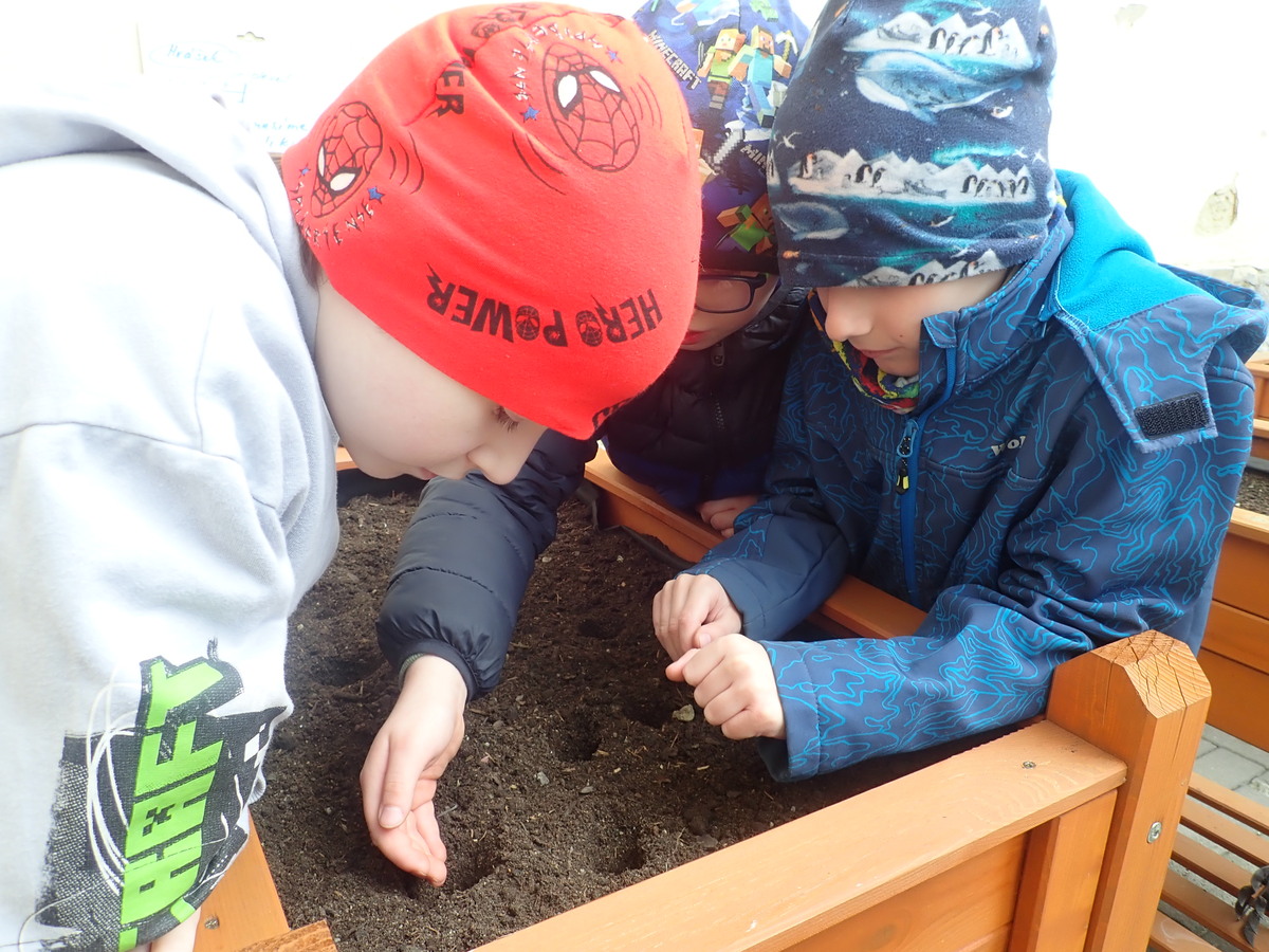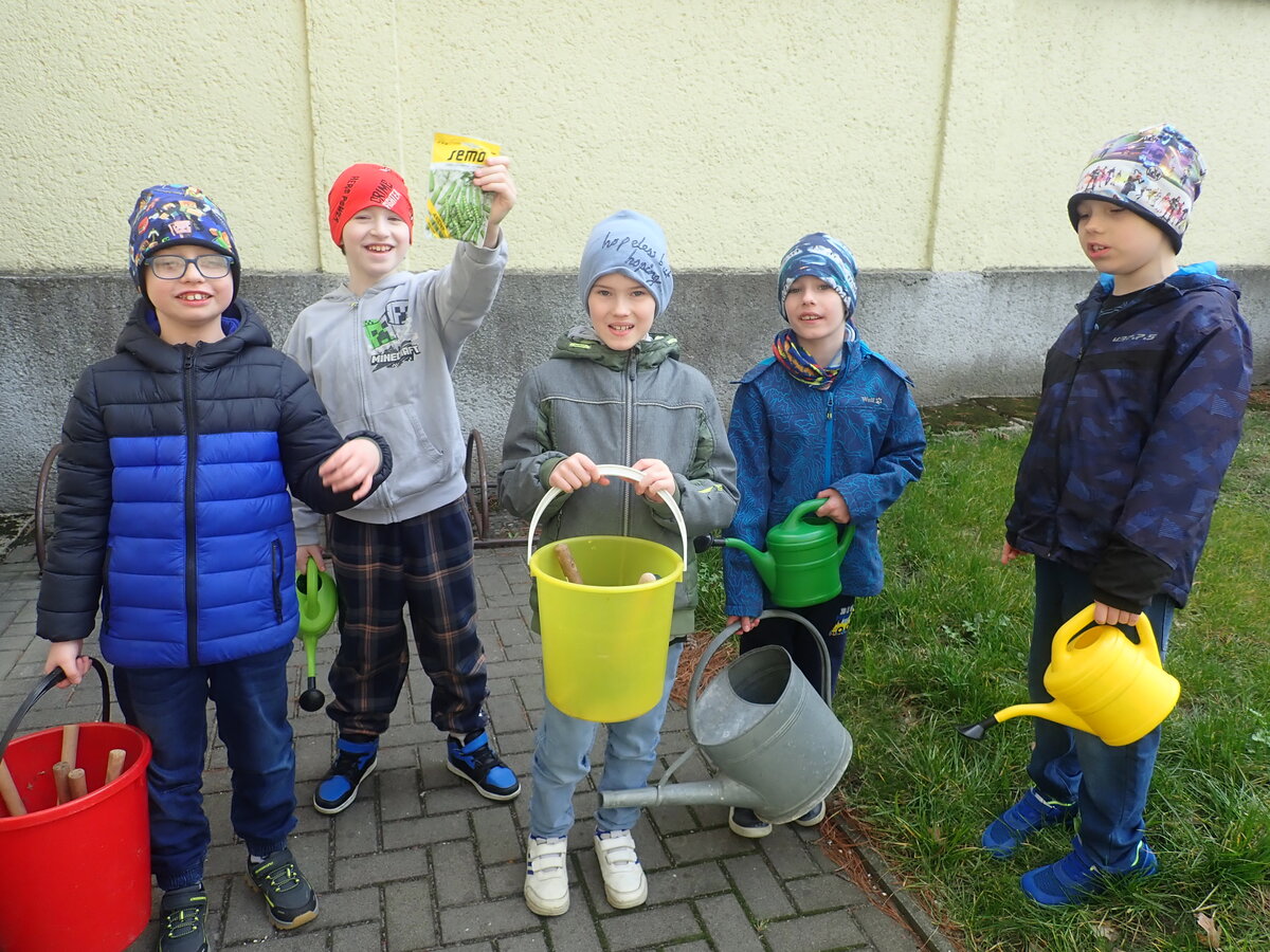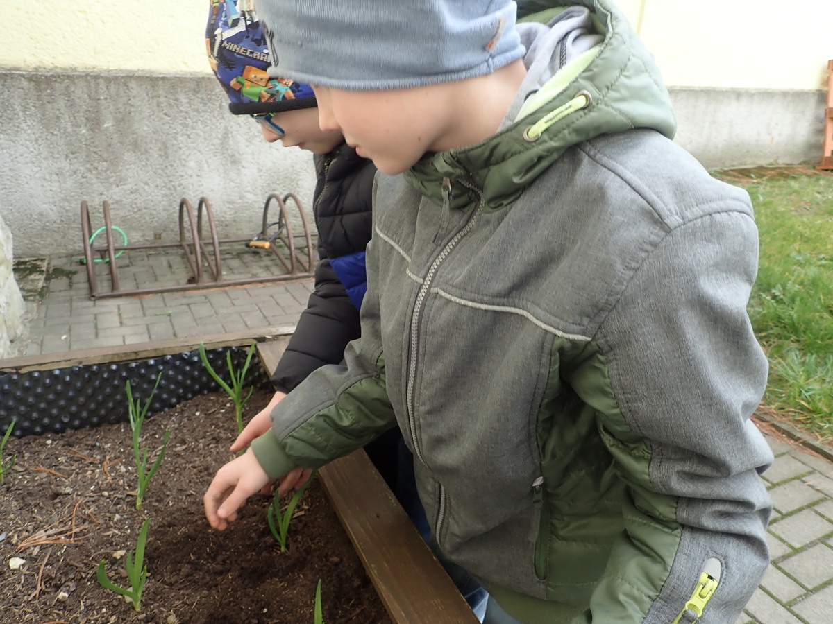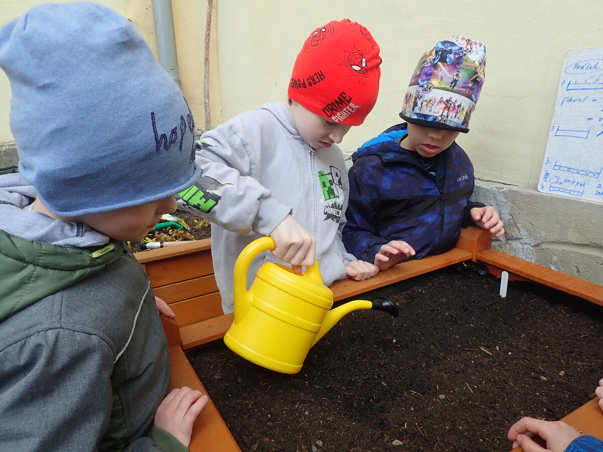 Naši žáci se opět pustili do jarních prací na zahradě a školním dvorku. Na školním dvorku mají žáci první a druhé třídy vyvýšené záhony, o které se celý školní rok starají. Teď vyseli ředkvičku a hrášek a taky stihli okopat česnek, který zasadili už na podzim.