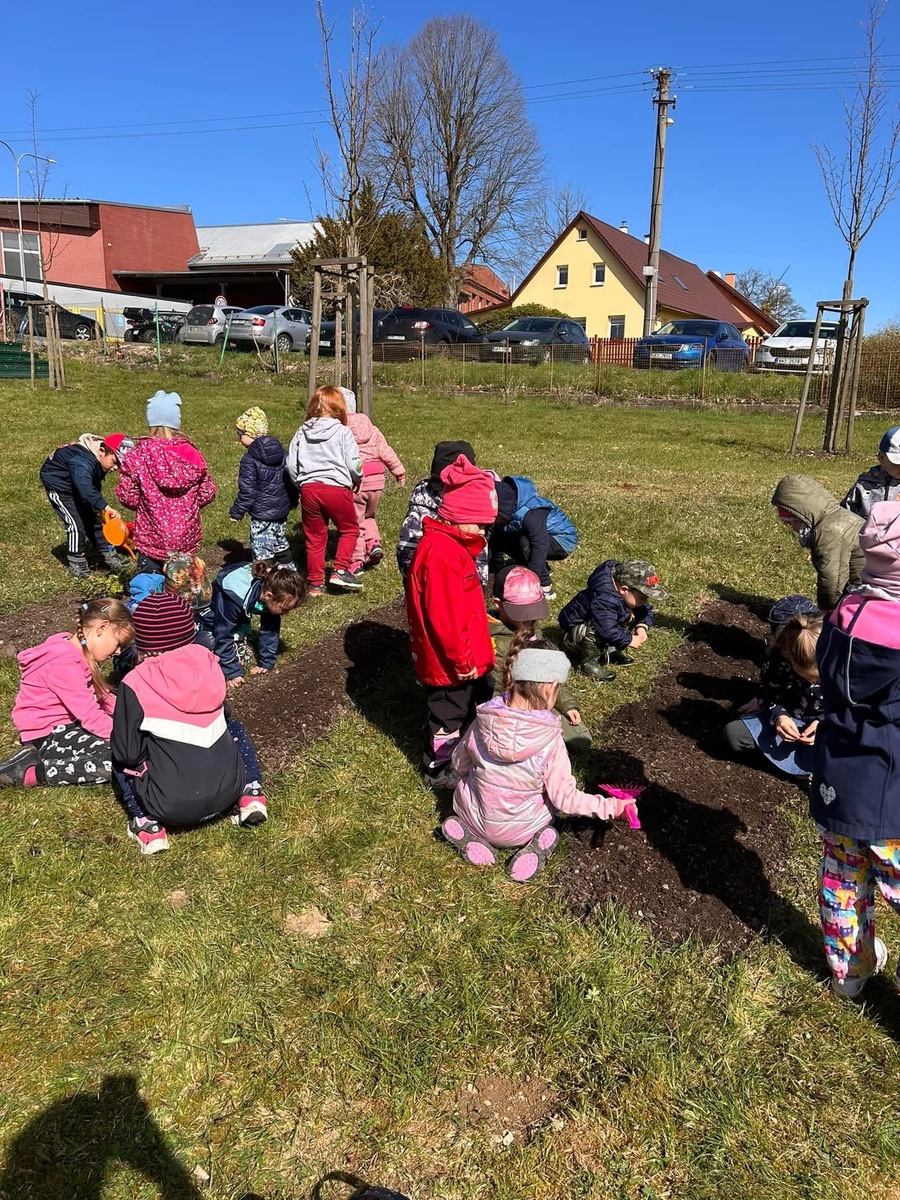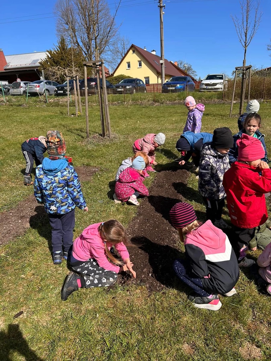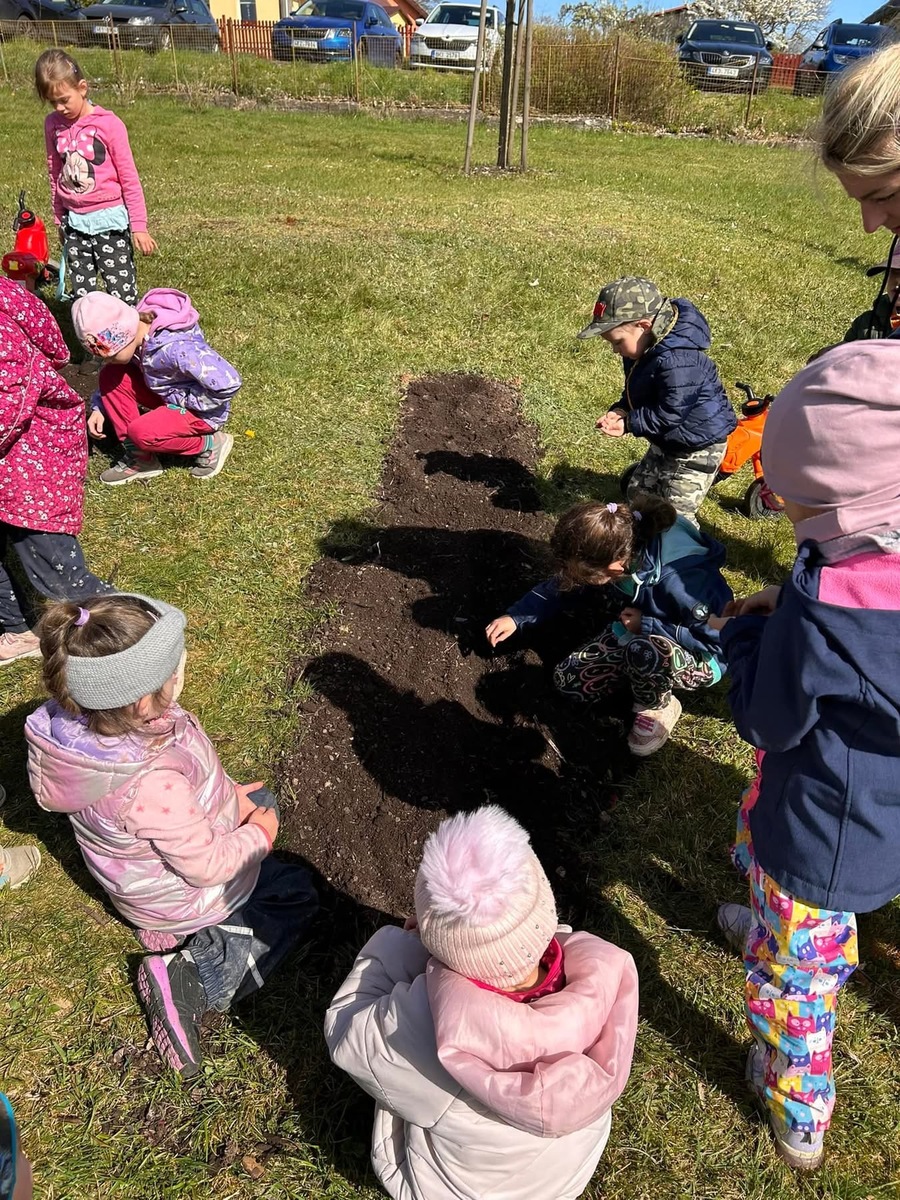 Po vybudování našich záhonů jsme se s dětmi hned vrhli do práce. Děti si záhony zryly, pohrabaly a zasely semínka ředkviček.