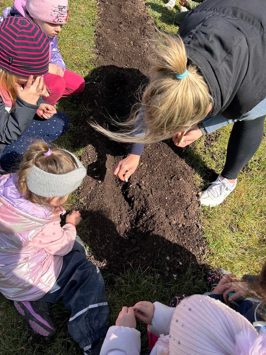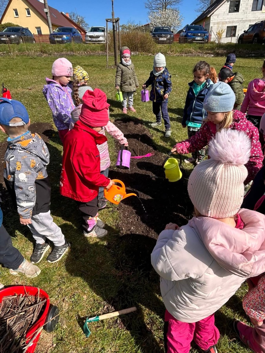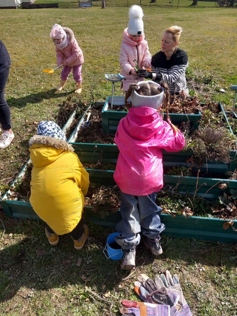 Po vybudování našich záhonů jsme se s dětmi hned vrhli do práce. Děti si záhony zryly, pohrabaly a zasely semínka ředkviček.