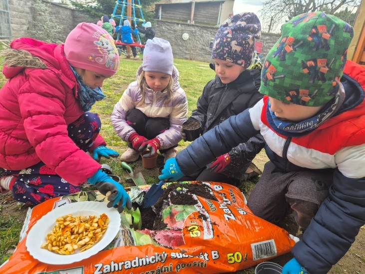 O semínka dýní se postaral zbytek třídy. Do připravených malých květináčků děti nasypaly čerstvou hlínu, sázecím kolíkem vyhloubily důlek a opatrně zasadily dýňová semínka, která nezapomněly pečlivě zalít. Než ze semínek vyrostou sazeničky, budou o ně děti pečovat v teple třídy.
