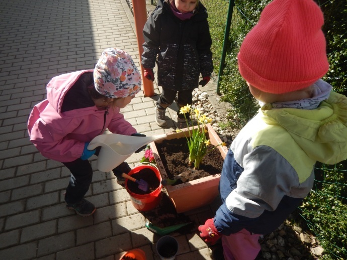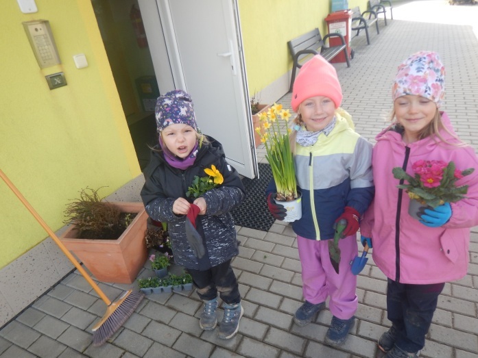O vysazení květin do květináčů před třídou se postaraly děti, které jsou zástupci třídy v malém ekotýmu. V ochranných rukavicích květiny zasadily do čerstvé hlíny a pečlivě zalily. Před vstupem do třídy nás nyní zdraví jaro svými hyacinty, maceškami, fialkami a narcisy.