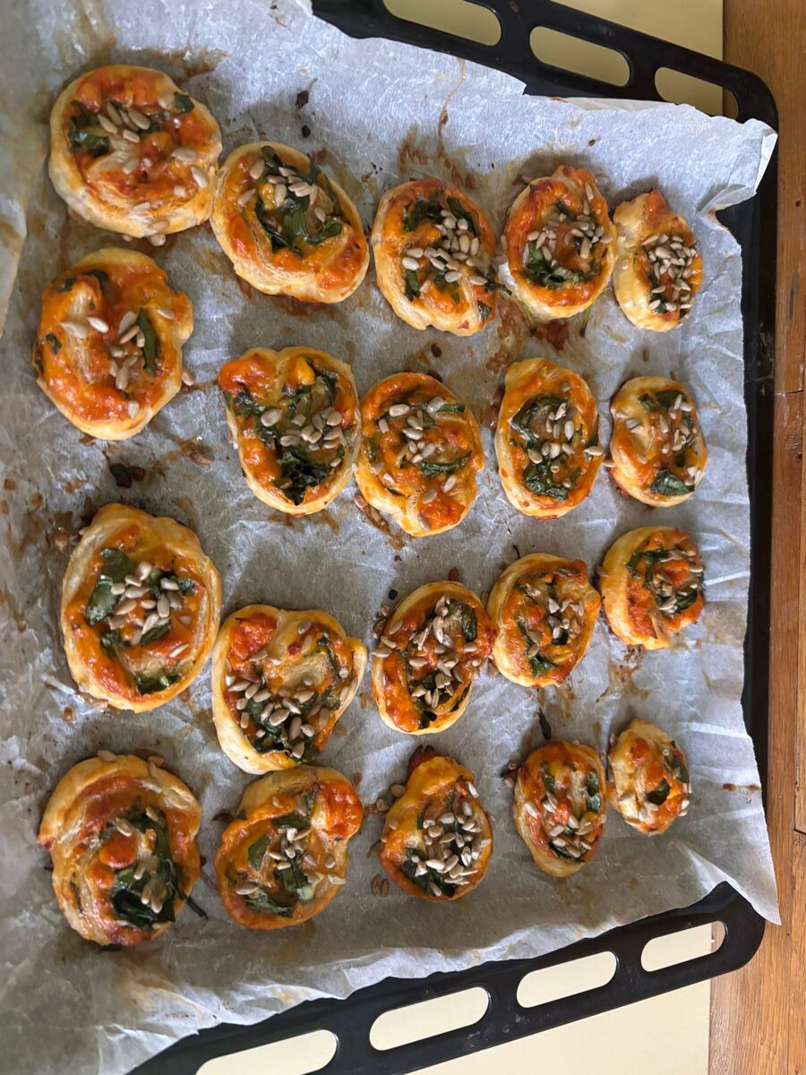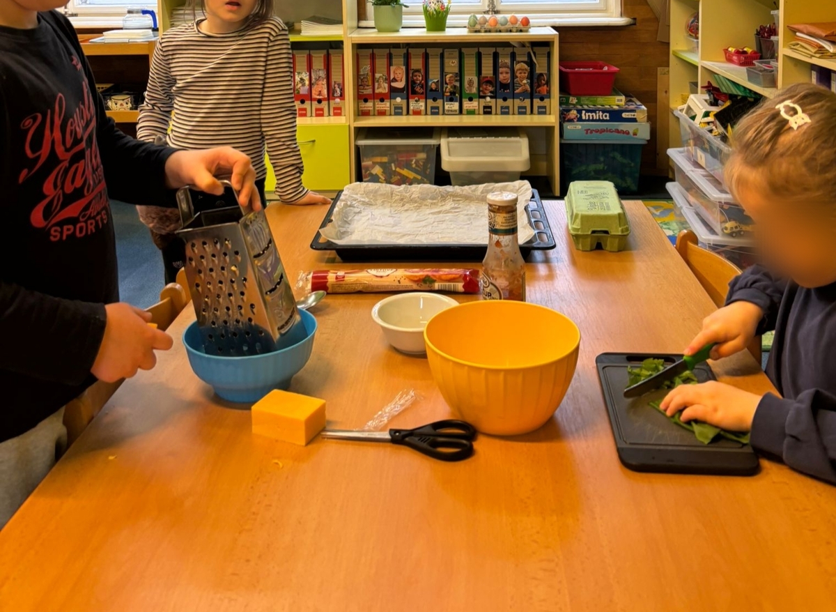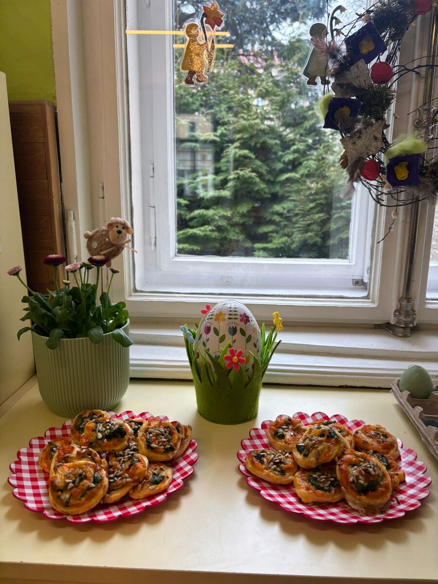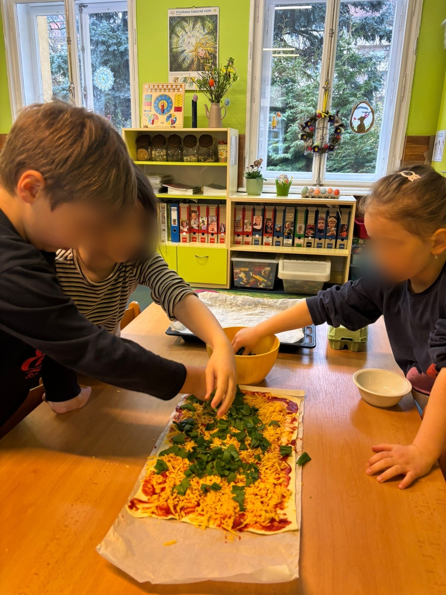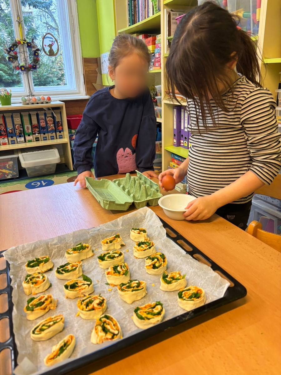 S příchodem jara jsme se pustili do pečení jarních šneků s medvědím česnekem. Připravili jsme si listové těsto, sýr chedar, který jsme nastrouhali a také pořádnou dávku medvědího česneku. Na listové těsto jsme nasypali chedar, pokryli jsme jej medvědím česnekem, smotali a nakrájeli na kolečka - šneky. Ty jsme potom pomazali rozšlehaným vejcem a posypali semínky. Potom už jsme jen poprosili paní kuchařky, aby nám naše jarní šnečky upekly. Byla to ohromná mňamka!