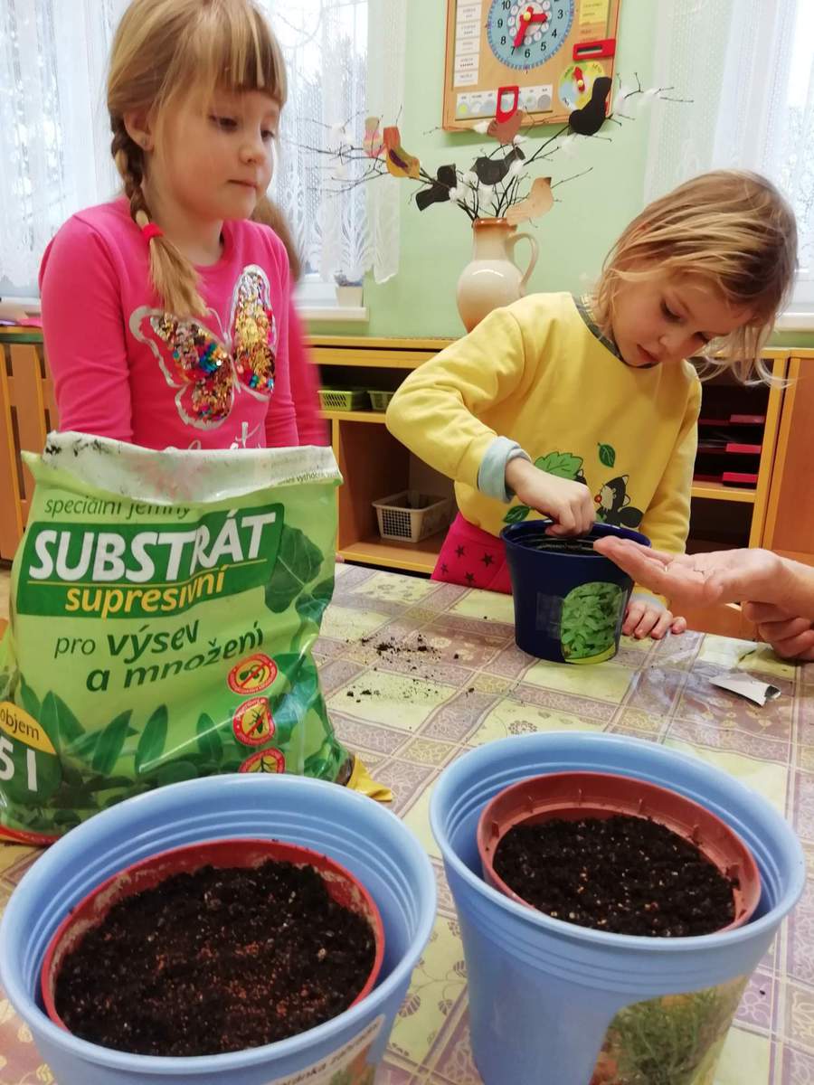 Jelikož zima bude pomaličku předávat svou vládu, začaly se děti v naší školce připravovat na jaro hrou na zahradníka. Do malých květináčků si připravily substrát a zasadily do nich bylinková semínka. O květináče se budou děti průběžně starat a budeme doufat, že až jaro převezme svou vládu definitivně, bylinky s dětmi přesadíme ven na školní zahrádku.