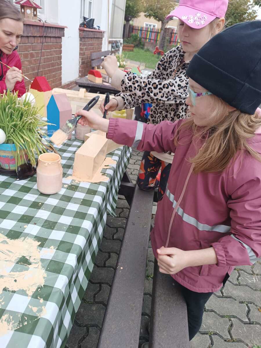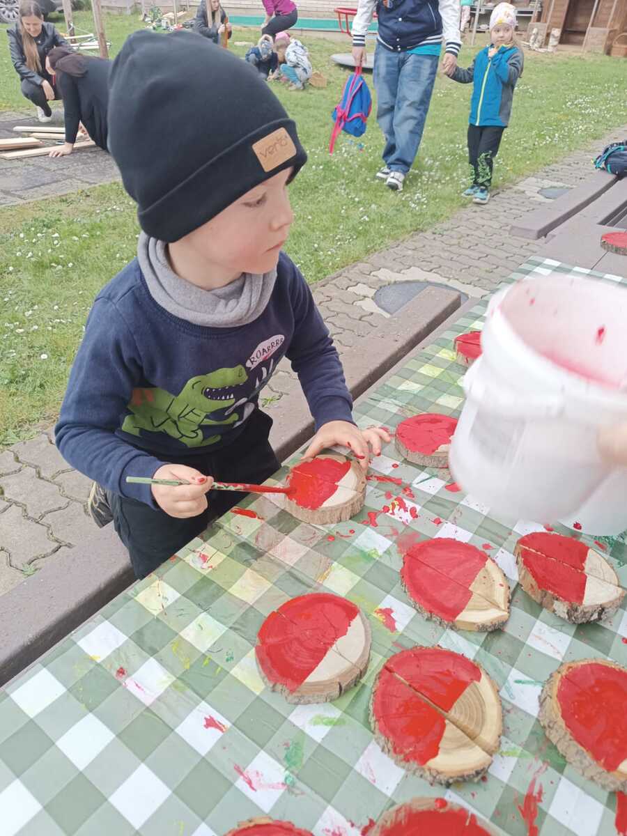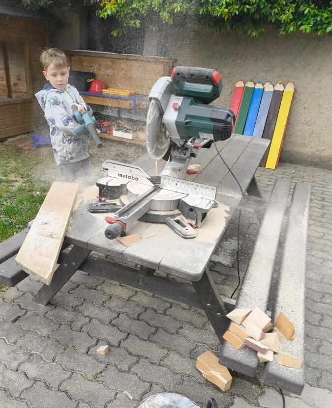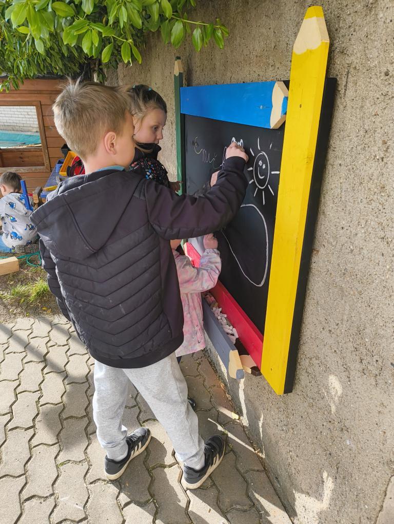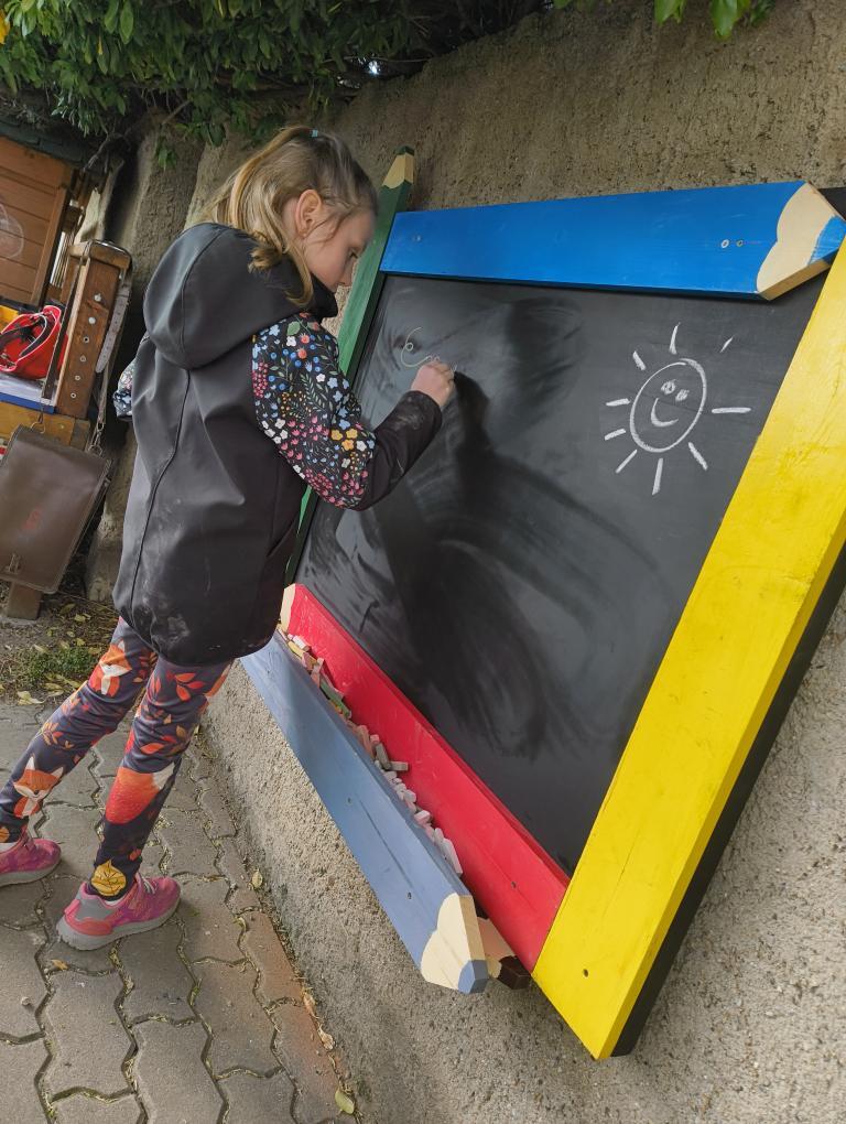 Při letošním odemykání zahrádky jsme si přály rozšířit prostor pro kreativní HRU na školní zahradě, založit SMYSLOVÝ chodníček, vyrobit DOMEČKY a DÝNĚ z dřevěných hranolů, vyřezat RYBIČKY z latí, které by děti zavěšovaly do sítě, beruškové DOMINO z dřevěných kulánků nebo SUDOKU na pařezu. Vytvořit pastelkovou TABULI na kreslení ze zbylých plotových latí a HUDEBNÍ pastelky, kde by děti mohly muzicírovat s nástroji, které jsme společně s nimi vyrobili. PASTELKY ještě doladíme a školkovou KOZÍ farmu založíme s dětmi