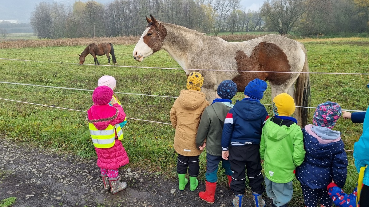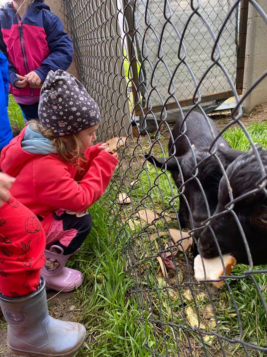 Než se nám podaří navštívit Kozí farmu Trk v Proboštově u Teplic, navštěvujeme s dětmi pravidelně zvířátka na místním ranči tady u nás v Soběchlebech. Zvířátka už nás znají a hlavně nás i poznají. Pokaždé, když se k nim s děti blížíme, běží nám naproti. Není to jediné místo kam s dětmi chodíme během dopoledních vycházek pozorovat zvířátka. Navštěvujeme pozemek našeho teď už bývalého kamaráda ze třídy Ježečků, který se stal toto září školákem. Chodíme se k němu koukat na husy a prase domácí. Máme jedinečnou možnost pozorovat, jak se z malého selete stane velké prase domácí. Dále chodíme, vždy po dohodě, krmit ovečky našeho pana školníka a kozy, které má pan soused hned naproti školce.