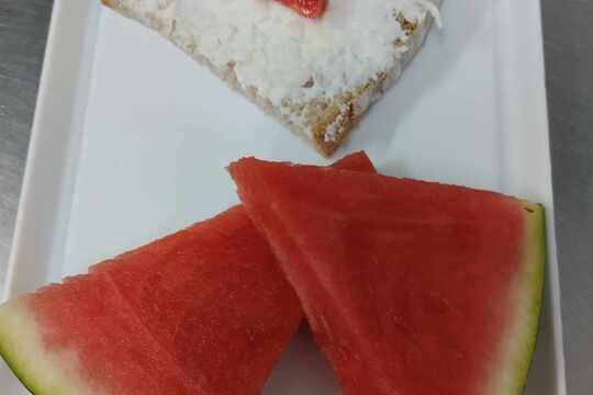 Od 1.srpna máme už zase provoz. Na dnešní den paní kuchařka Blanička dětem připravila na svačinku chléb s pomazánkou z mozzarelly, vodní meloun a čaj. Na oběd bylo bramborové suflé se sumečkem africkým. Byla to náramná dobrota.