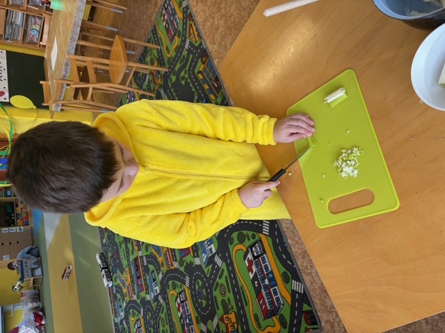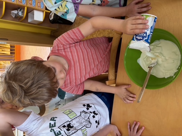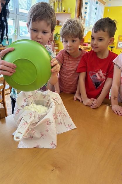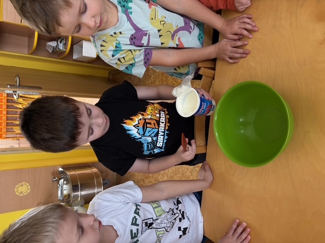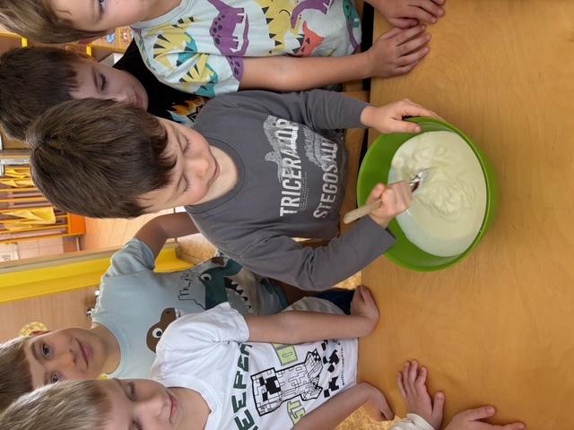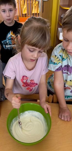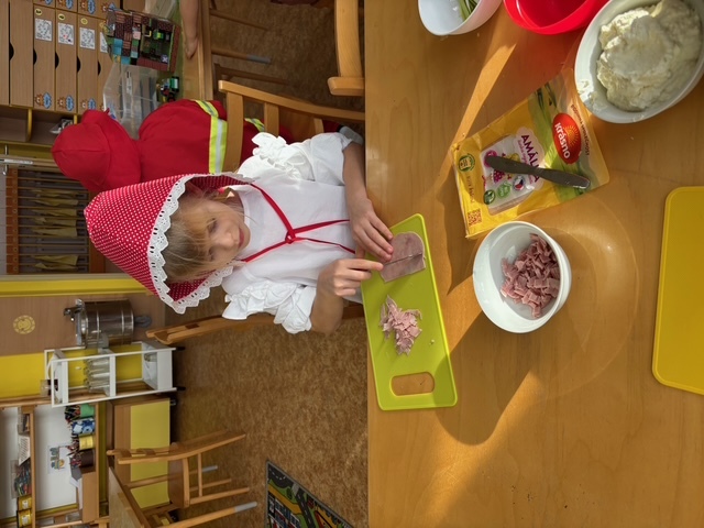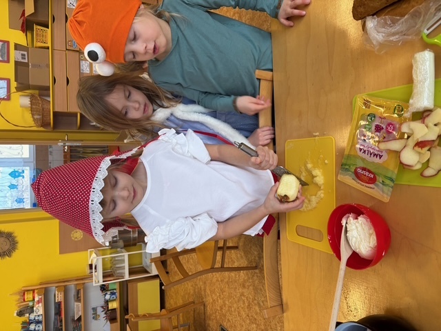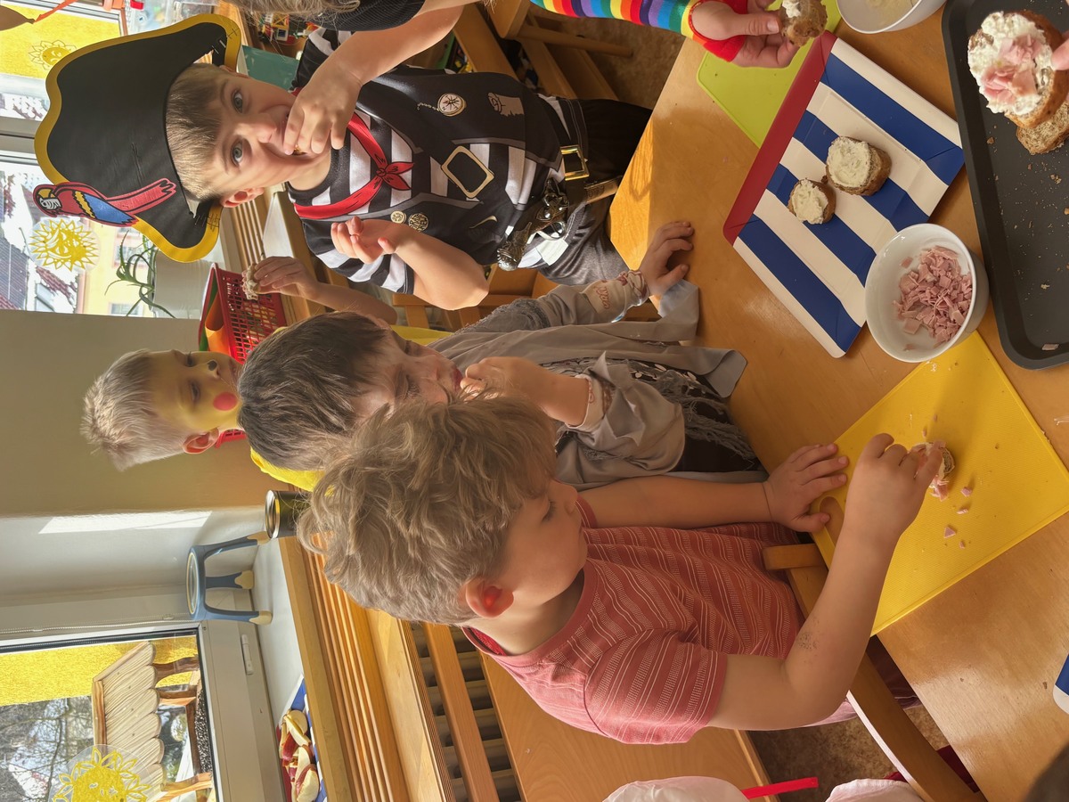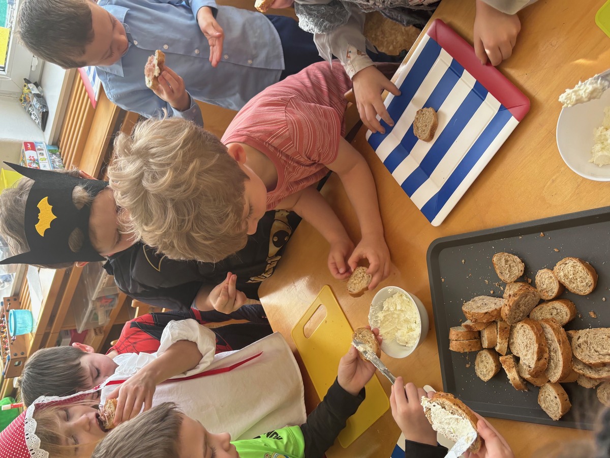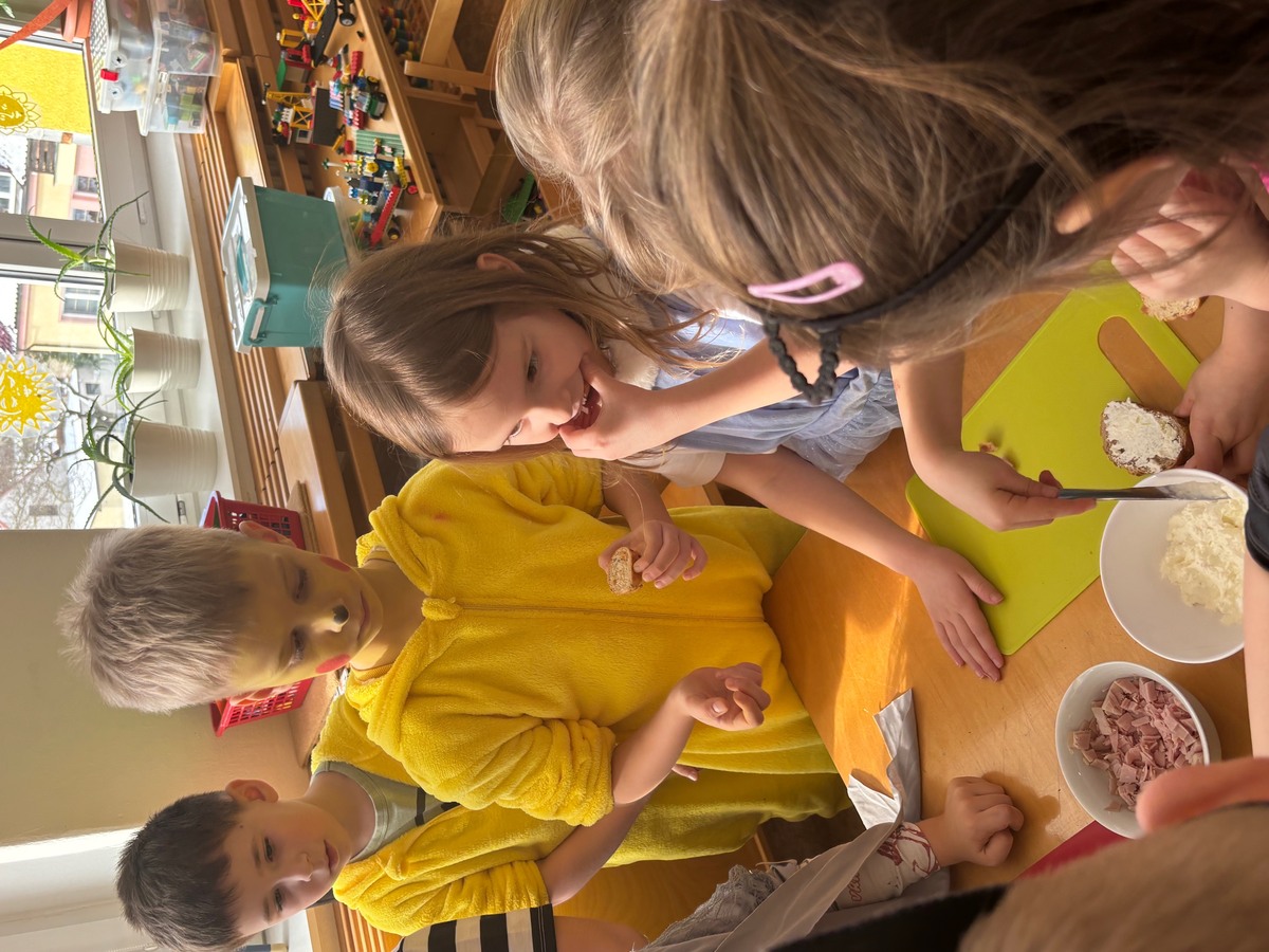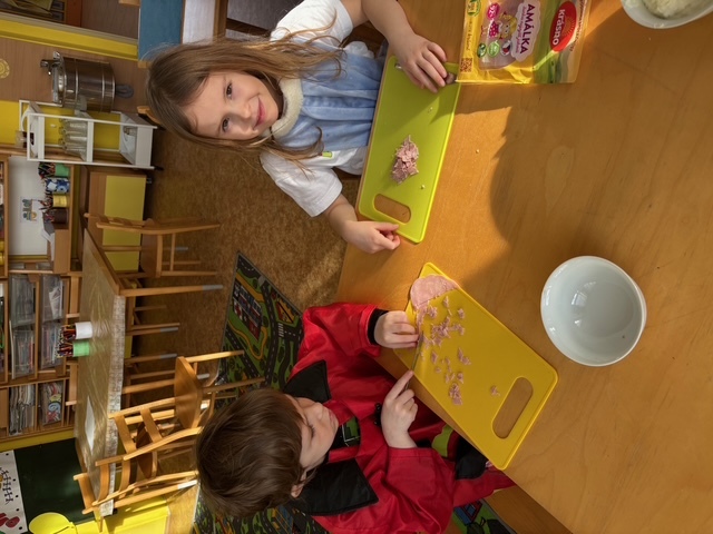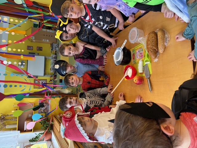 Děti si samy připravily pohoštění na karneval ve školce. Jeden den si připravily domácí lučinu a druhý den do ní přidaly podle receptu jablíčko a pórek. O karneval si ji namazaly na celozrnný rohlík a navrch posypaly šunkou... Jak dětem chutnalo jsme poznali podle toho, že nic nezbylo... a dokonce ochutnaly i děti, které většinou žádné pomazánky nejí :)