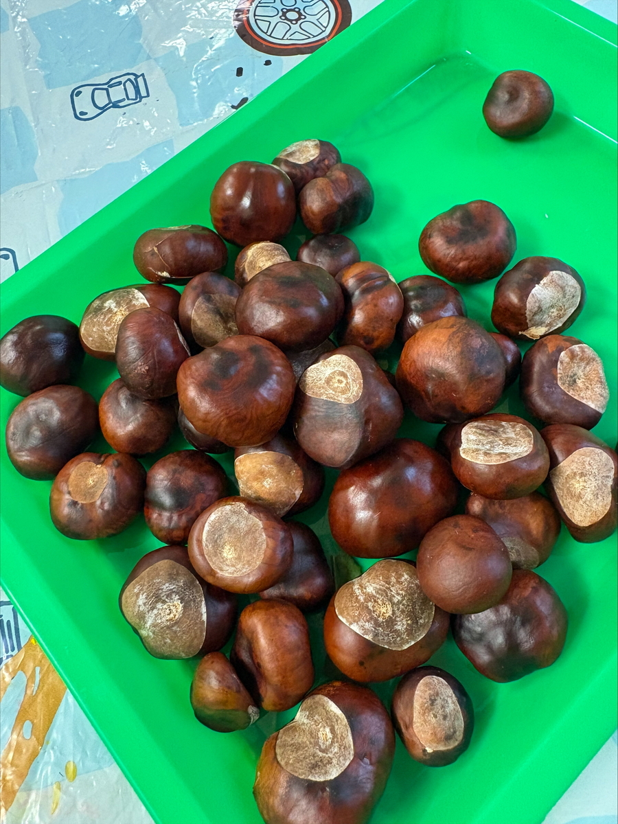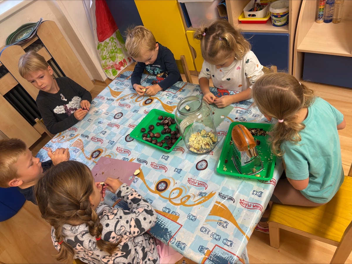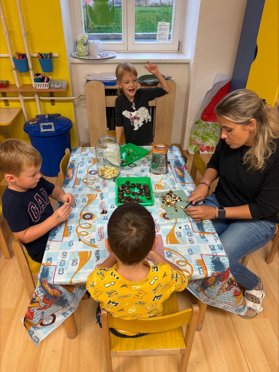 Děti si vyzkoušely, jak se dají kaštany využít jinak než na hraní. Kaštany loupaly, krájely a strouhaly na malé kousky. Potom je zalily vodou a čekaly, až se z nich uvolní přírodní „mýdlo“. Voda se zakalila a začala pěnit – kaštany totiž obsahují saponiny, které umí čistit.