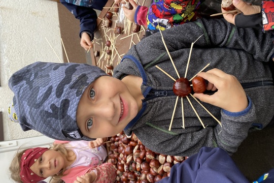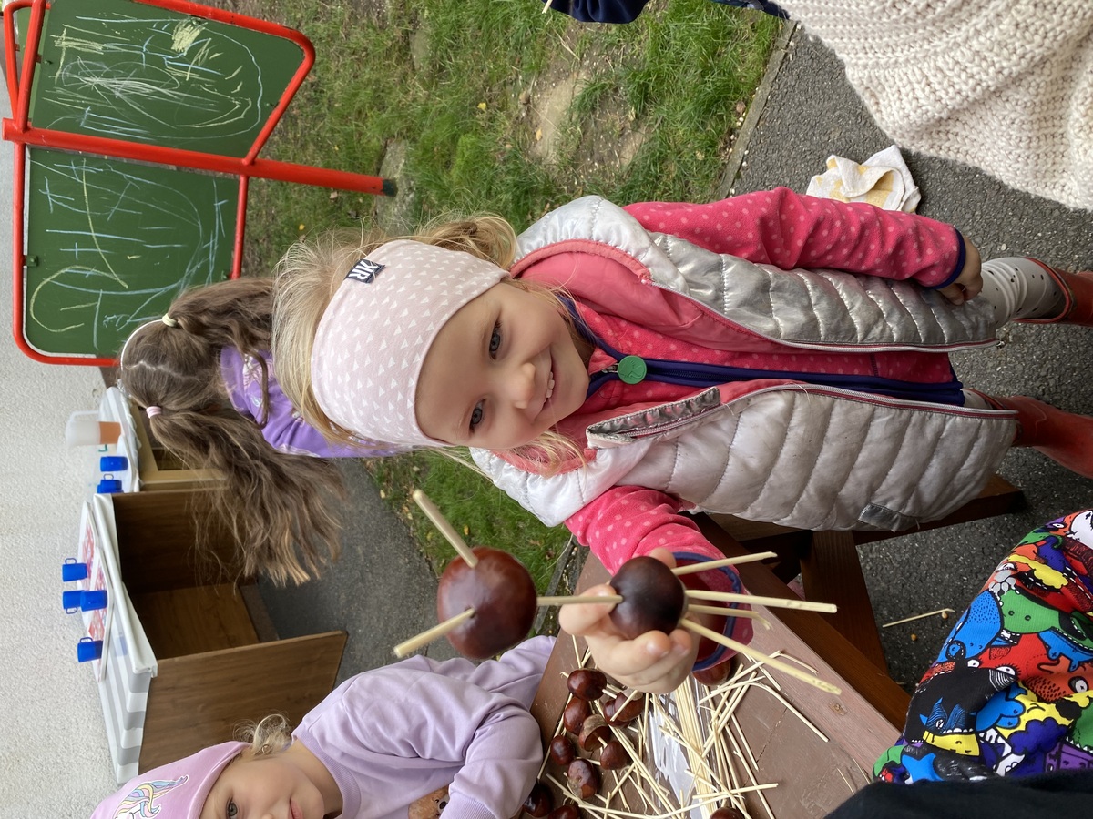 Na naší zahradě máme dva stromy, které mají děti nejraději na podzim. Je to Jírivec Maďal- v letošním školním roce máme mnoho nasbíraných kaštanů, tak s nimi vyrábíme, skládáme obrázky, tvoříme zvířátka.