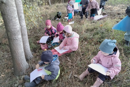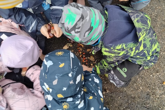 A poslední den jsme se zaměřili na zvířata, která potkáme v lese. Předvedli jsme si jak chodí, jak na sebe mluví a šli jsme jim vyrobit obrázek, který měl představovat jejich jídelní tabuli. Z mnoha přírodnin jsme vytvořili kruh plný dobrot.