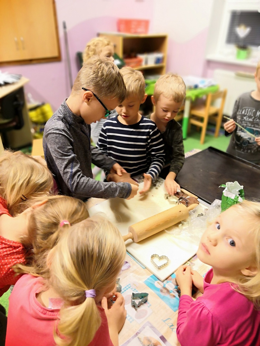 Před příchodem mikulášské družiny si děti mateřské školy vyzkoušely pečení perníčků. S paní učitelkou si připravily těsto. Větší kluci se chopili válečku (prý je potřeba mít svaly) a začaly vyvalováním těsta, ostatní děti pomáhaly s vykrajováním a pokládáním různých tvarů na plech. S upečením perníčků poté pomohli paní kuchařky naší školy.