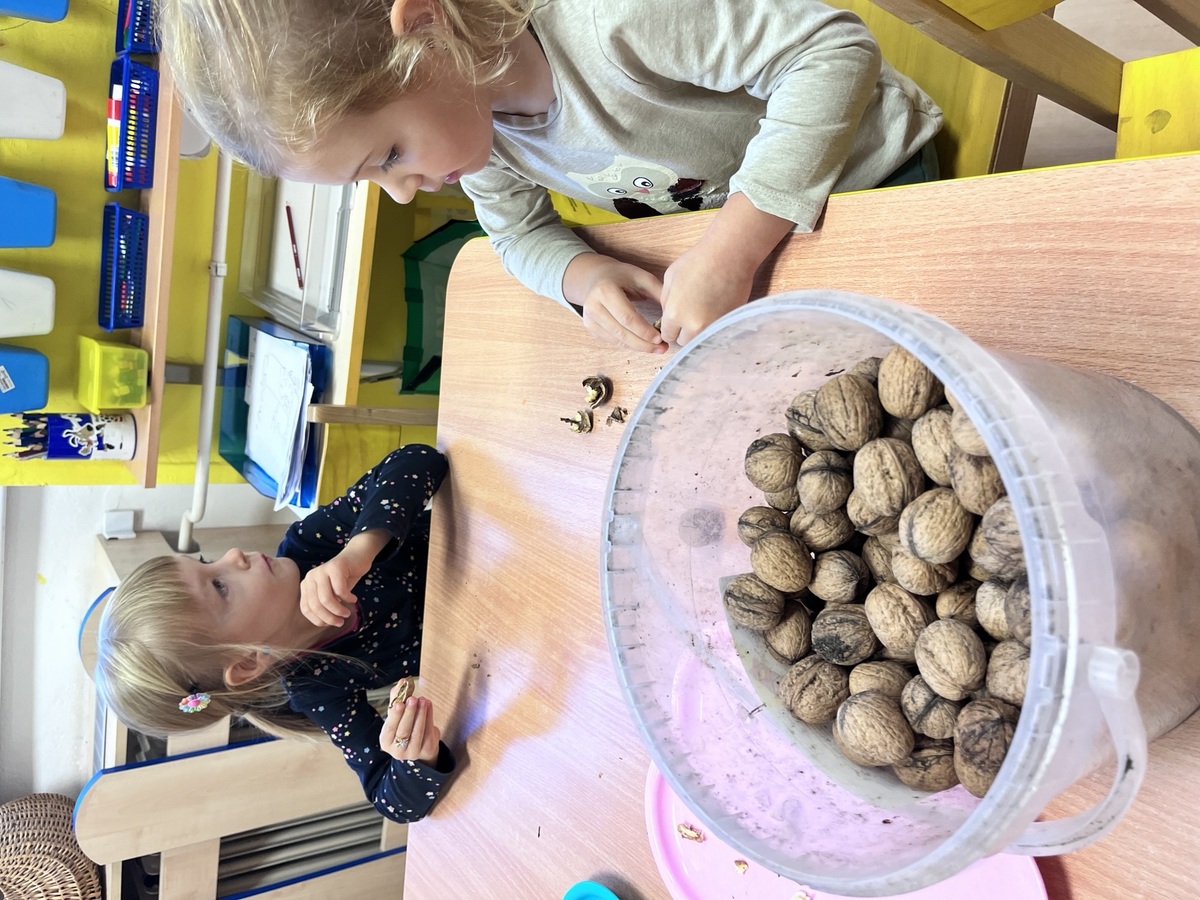 Tématem tohoto týdne byly Košík plný podzimního naladění-děti nosily přírodniny,hráli jsme si s nimi,navlékali,ochutnávali.Zbyl nám koš ořechů a protože p.kuchařka bude dělat pro děti ovesné sušenky,poprosili jsme jí zda by tam nedala i námi oloupané oříšky.