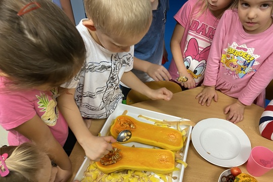 Paní učitelka Janička donesla dětem ze své zahrádky máslovou dýni. A třída Koťátka se rozhodla, že si z ní uvaří dýňovou polévku.