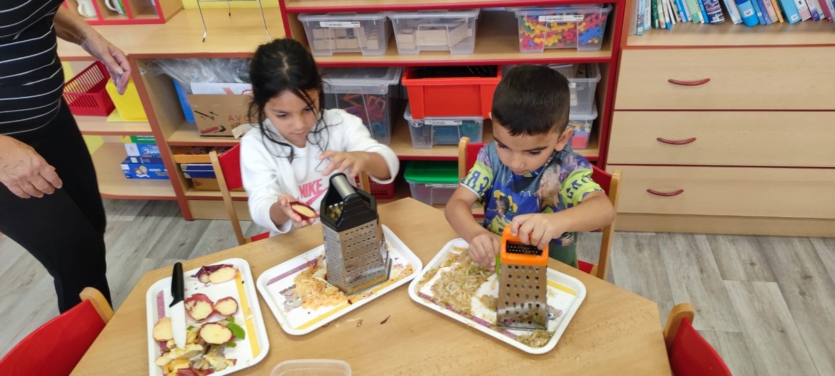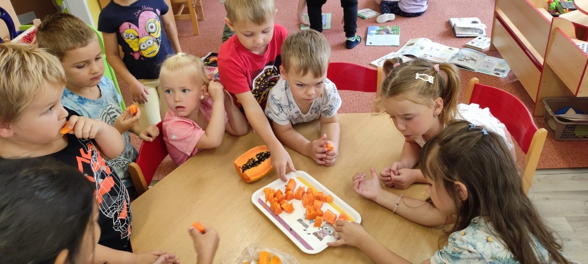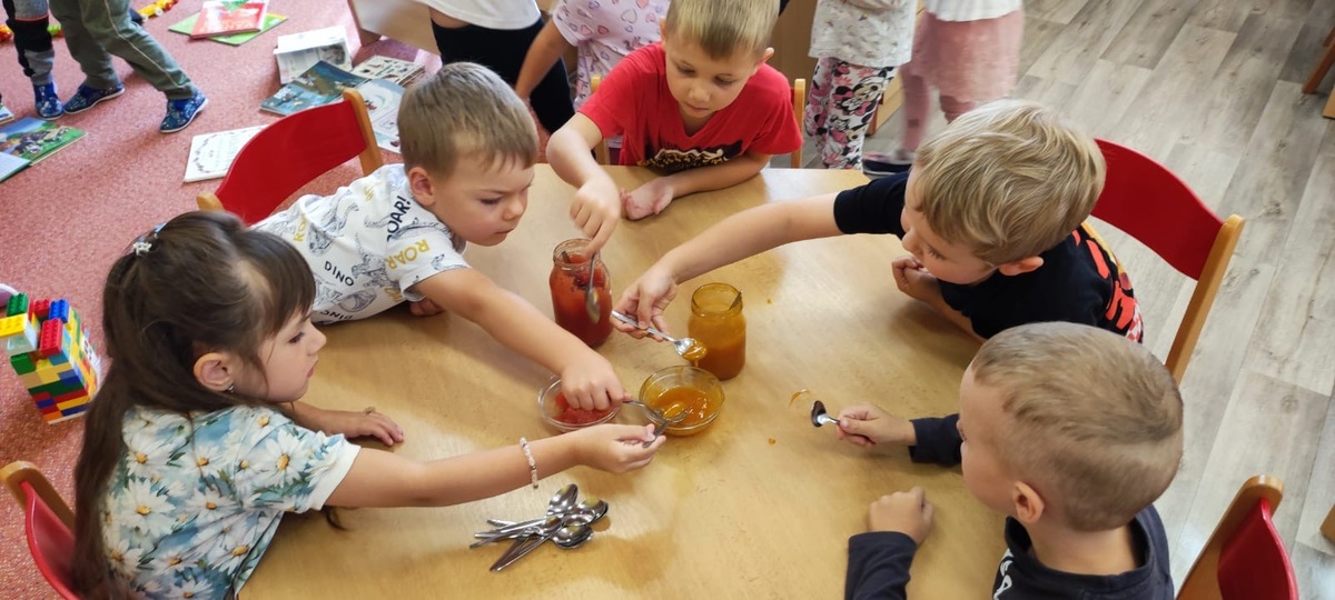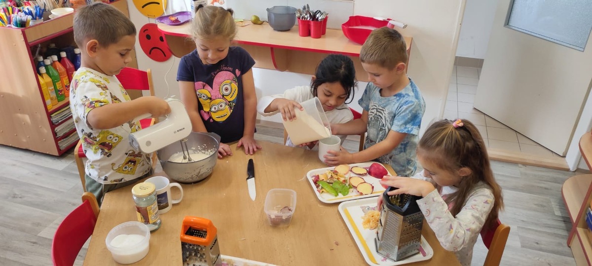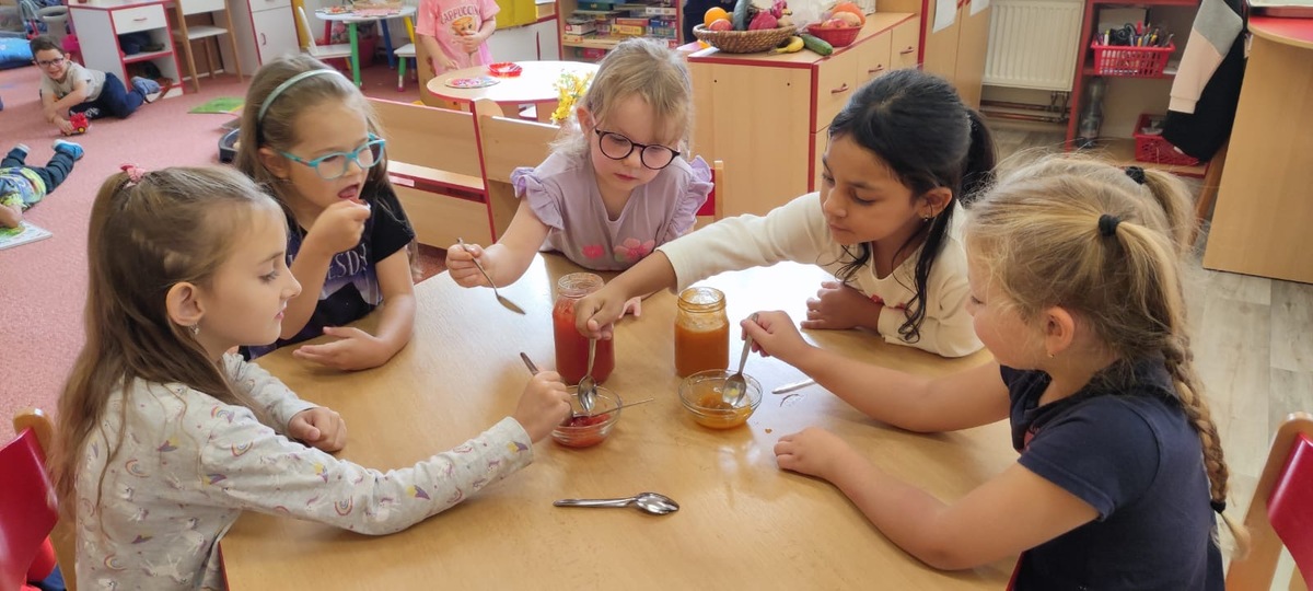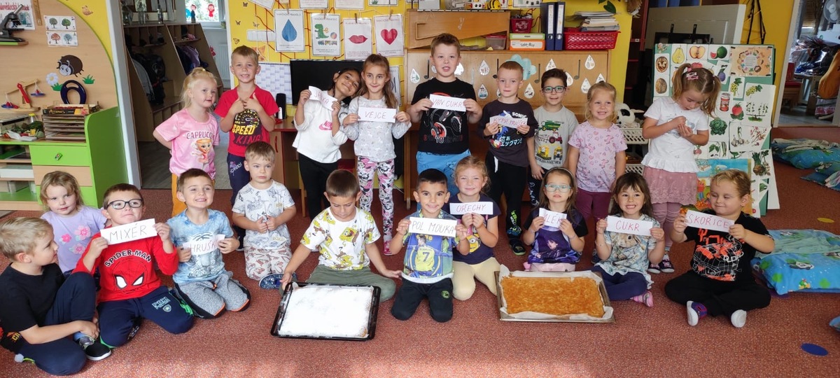 U Koťátek děti připravovaly jablečnou a hruškovou buchtu. Postupně si vyzkoušely míchání, mixování, krájení, strouhání, poznávaly vůně a suroviny. Během toho po skupinách probíhala ochutnávka domácích marmelád, kde děti hádaly, z jakého ovoce jsou a ochutnávaly také exotické ovoce Papayu.
