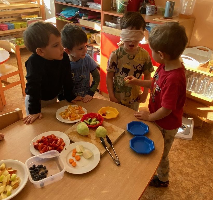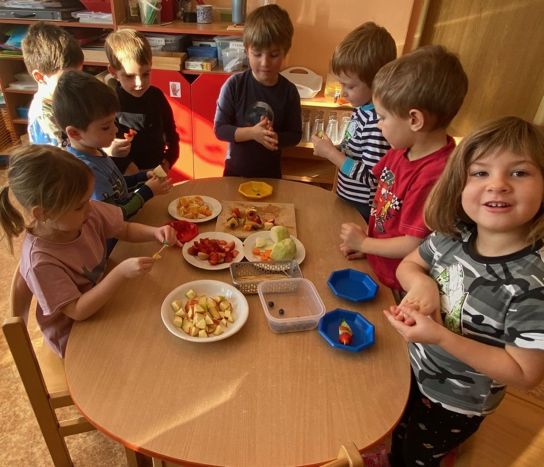 Děti si přinesly, co mají rády. Společně si ovoce a zeleninu připravily a poté poslepu podle chuti poznávaly, co to je. Nakonec si připravily špízy dle vlastní chuti. Nic nezbylo :)