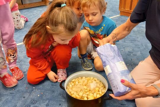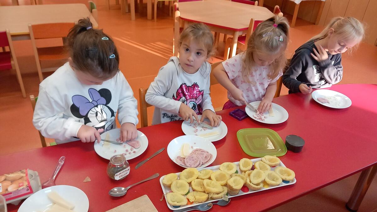 Děti ze třídy včeliček tento měsíc tvořily plněnou bramboru, do které přidaly šunku, sýr, vajíčko a pár bylinek. Poté si zkusily také uvařit jablečný kompot.