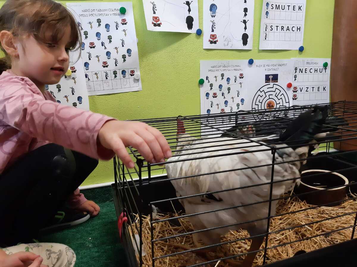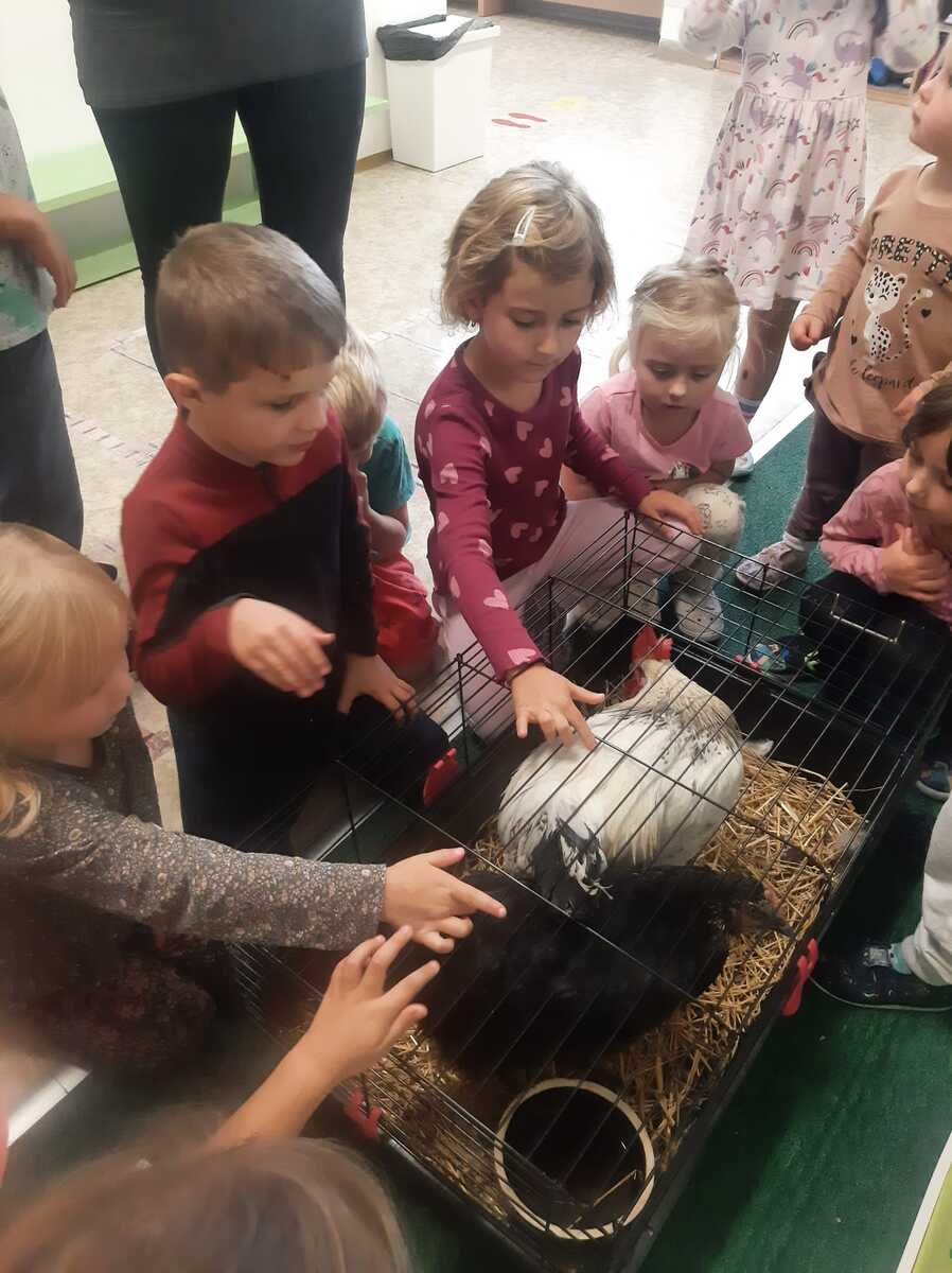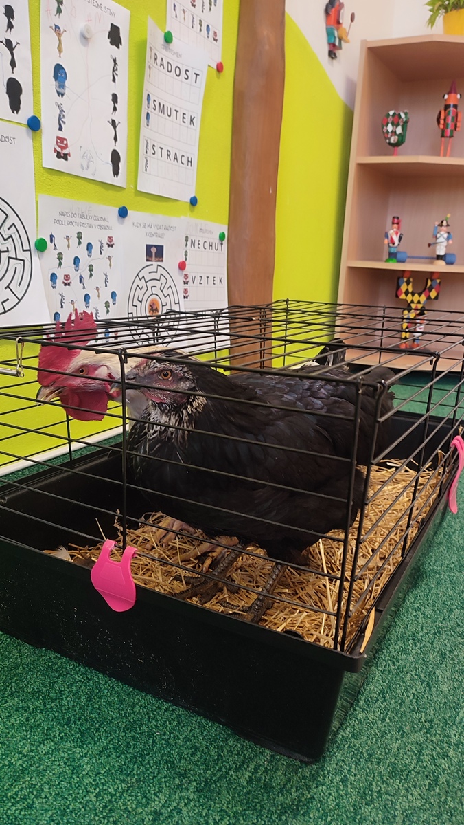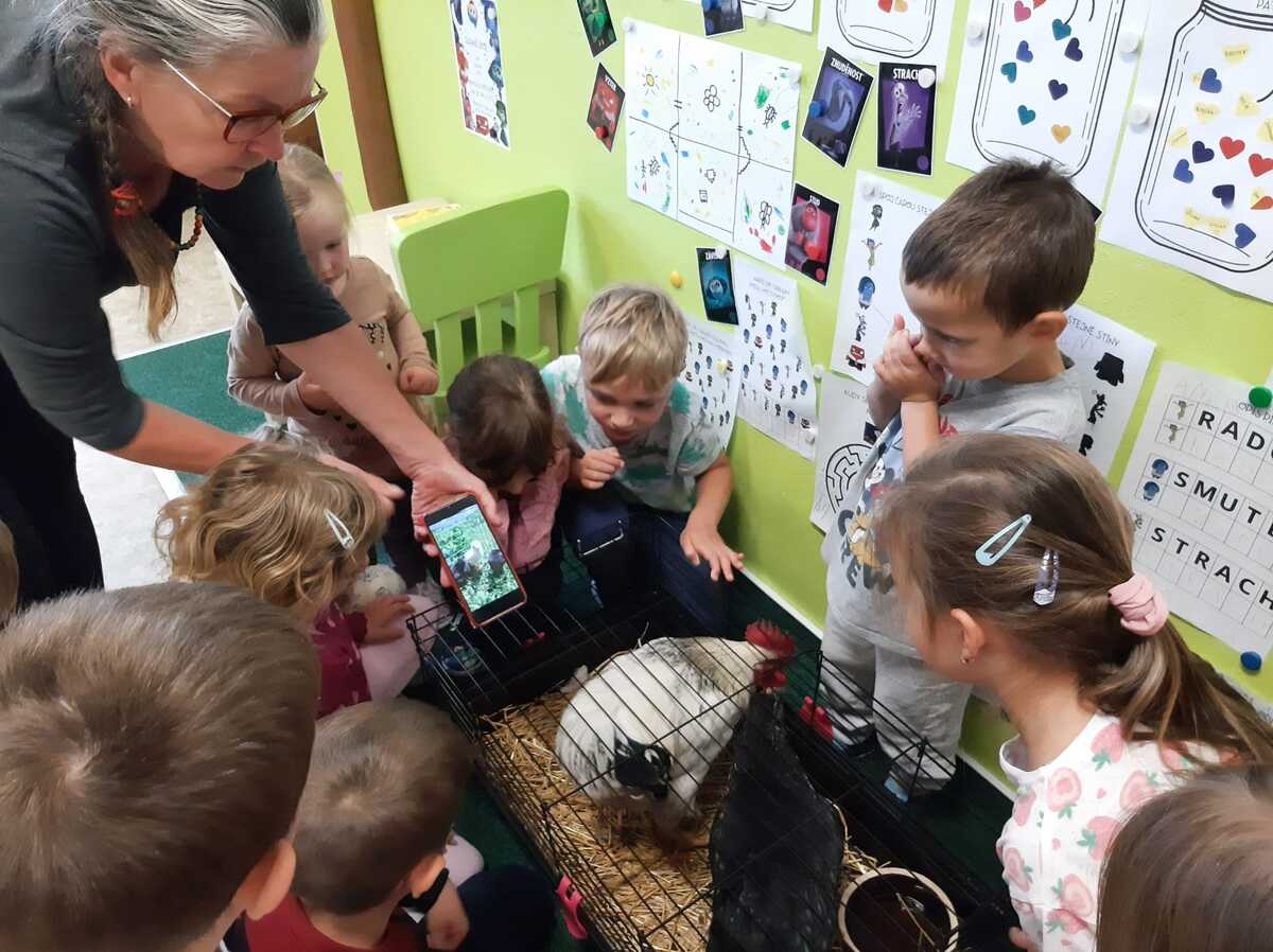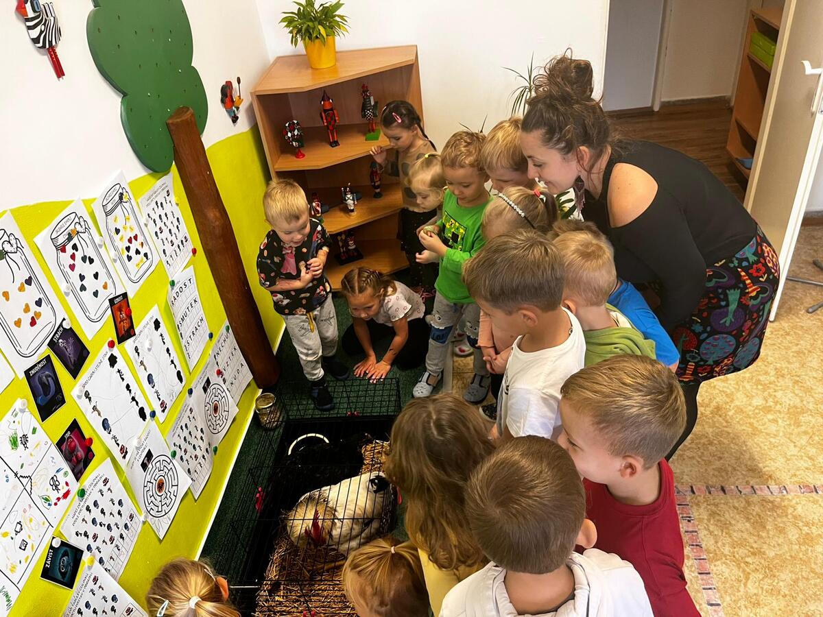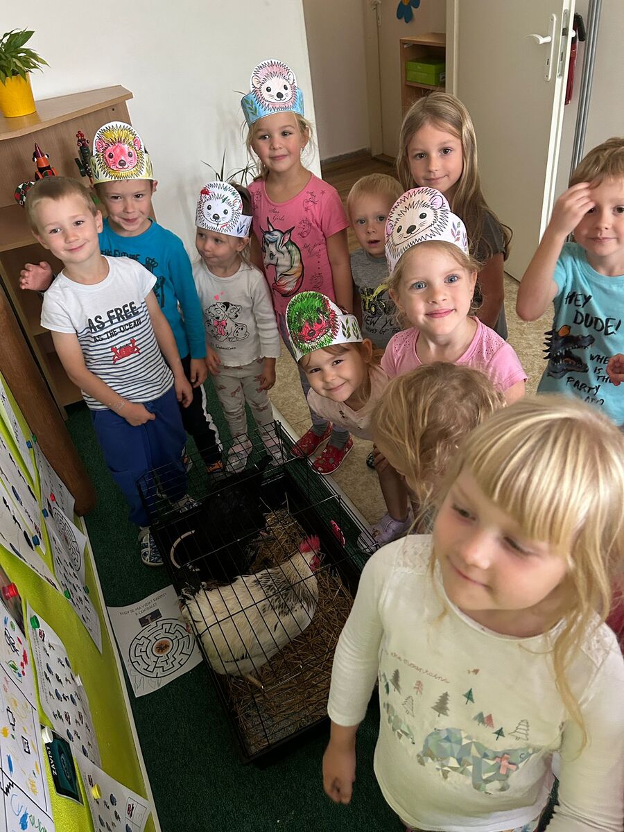 Po nezapomenutém zážitku z líhnutí kuřátek se naše mateřská škola proměnila v malou farmu. Kuřátka, která se u nás narodila, se už zabydlela v nových domovech u paní učitelek, a my jsme se vydali na další dobrodružství – poznávání života dospělé drůbeže. Do školky zavítali speciální hosté – naše kuřátka, ale už trochu povyrostlá - kohoutek a slepička. Děti byly nadšené! Mohly si zblízka prohlédnout, jak vypadá dospělý pták, který kdysi býval malým kuřátkem. Slepička se chovala klidně, zatímco kohoutek nás zdravil hlasitým kokrháním, které se stalo tématem dne. Děti si všímaly každého detailu – hřebínku na hlavě, záhadného laloku pod krkem, peříček různých barev. Ptaly se, proč kohout neklade vajíčka, jak slepička pozná, že je čas na snůšku, a co všechno potřebují k životu. Paní učitelky trpělivě odpovídaly a ukazovaly, jak se drůbež krmí, kde spí a jak se o ni pečuje. Diskutovalo se o tom, co se z vajíčka může narodit, a děti si připomněly, jak to celé začalo – příběhem „Jak to bylo, slepičko?“