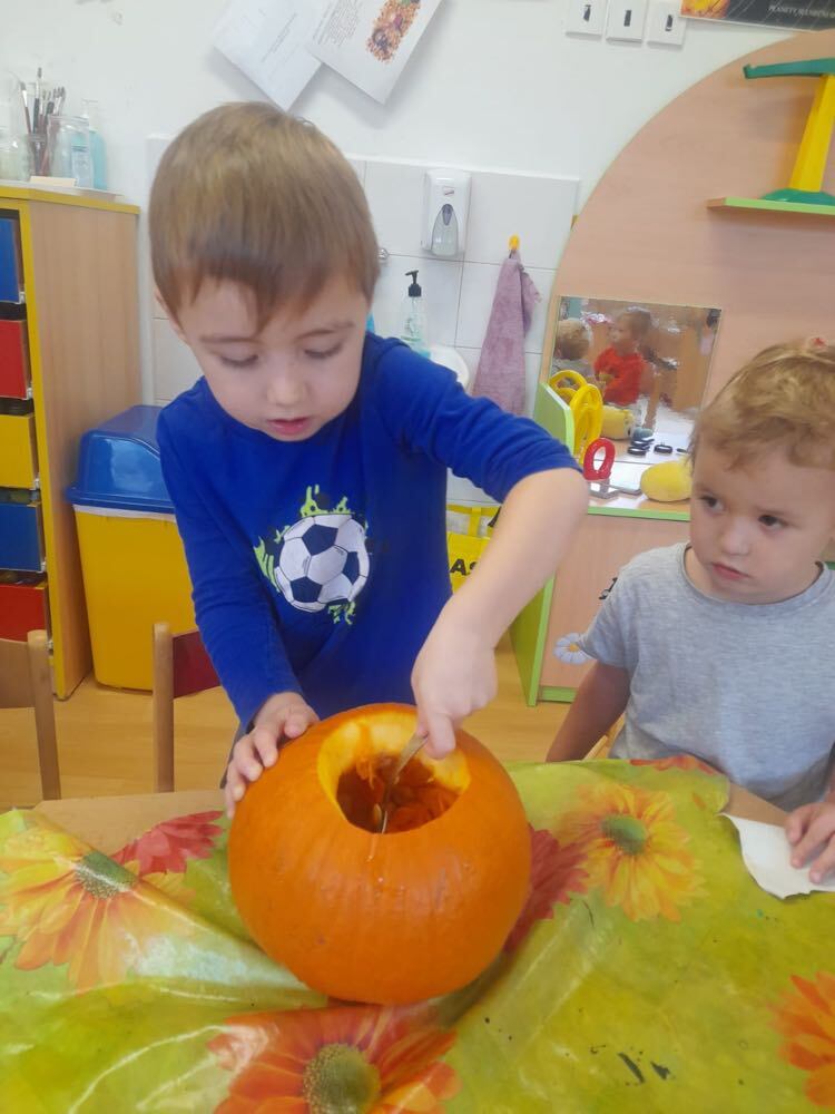 Na Haloween si děti samy vydlabaly dýně a paní učitelka dýním vyřezala obličej. Po vydlabání dýně šly děti třídit odpad na kompost na naší školní zahradě. Další den brzy ráno paní učitelka zapálila svíčku a děti koukaly, jak dýně vypadá strašidelně:).