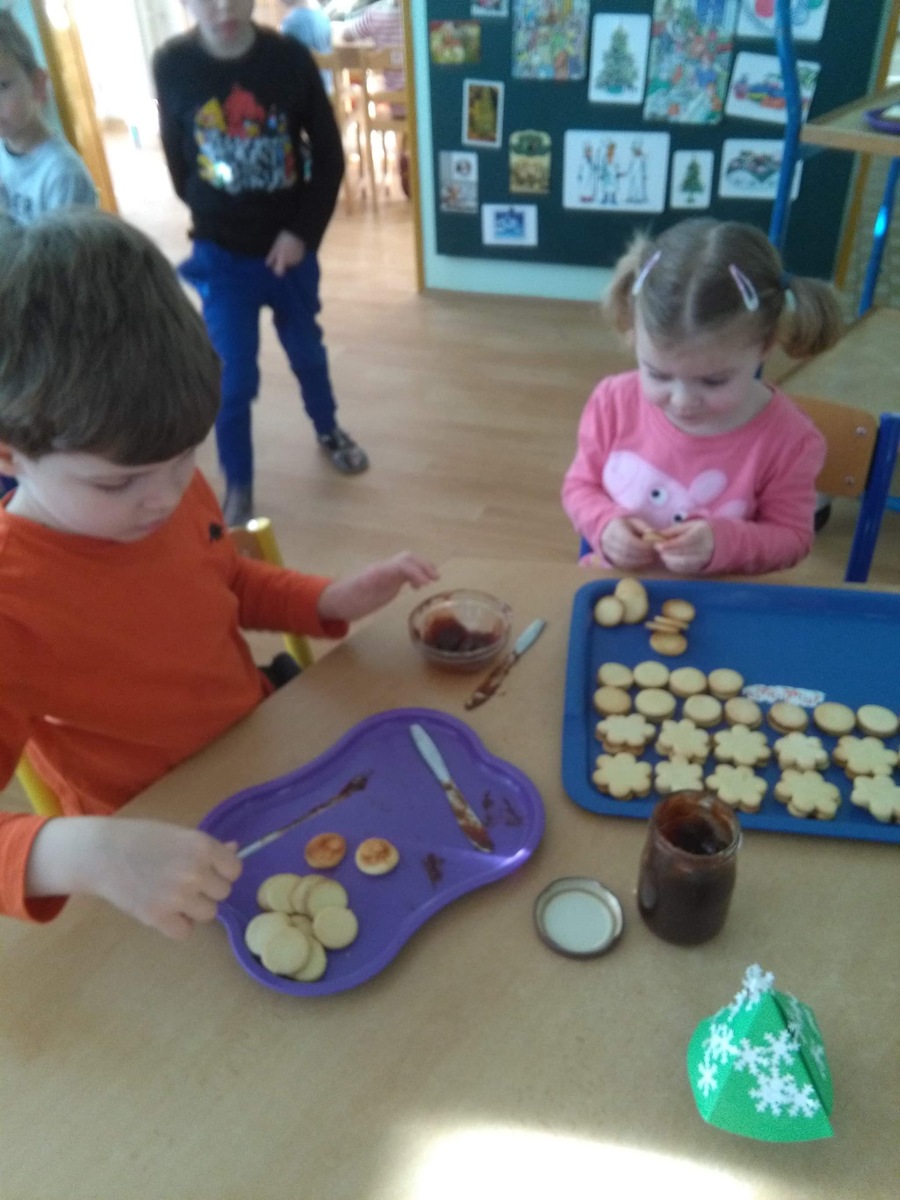 Mezi nejoblíbenější cukroví určitě patří linecké cukroví. Děti si samy vyrobily těsto, vyválely, vykrajovaly a lepily domácí marmeládou, kterou donesly maminky. Hodné paní kuchařky nám upekly cukroví v kuchyni. Některé cukrovinky byly ozdobeny 70% čokoládou rozpuštěnou s máslem. Děti byly zamazané a ulepené až za ušima, ale to jim vůbec nevadilo :-).