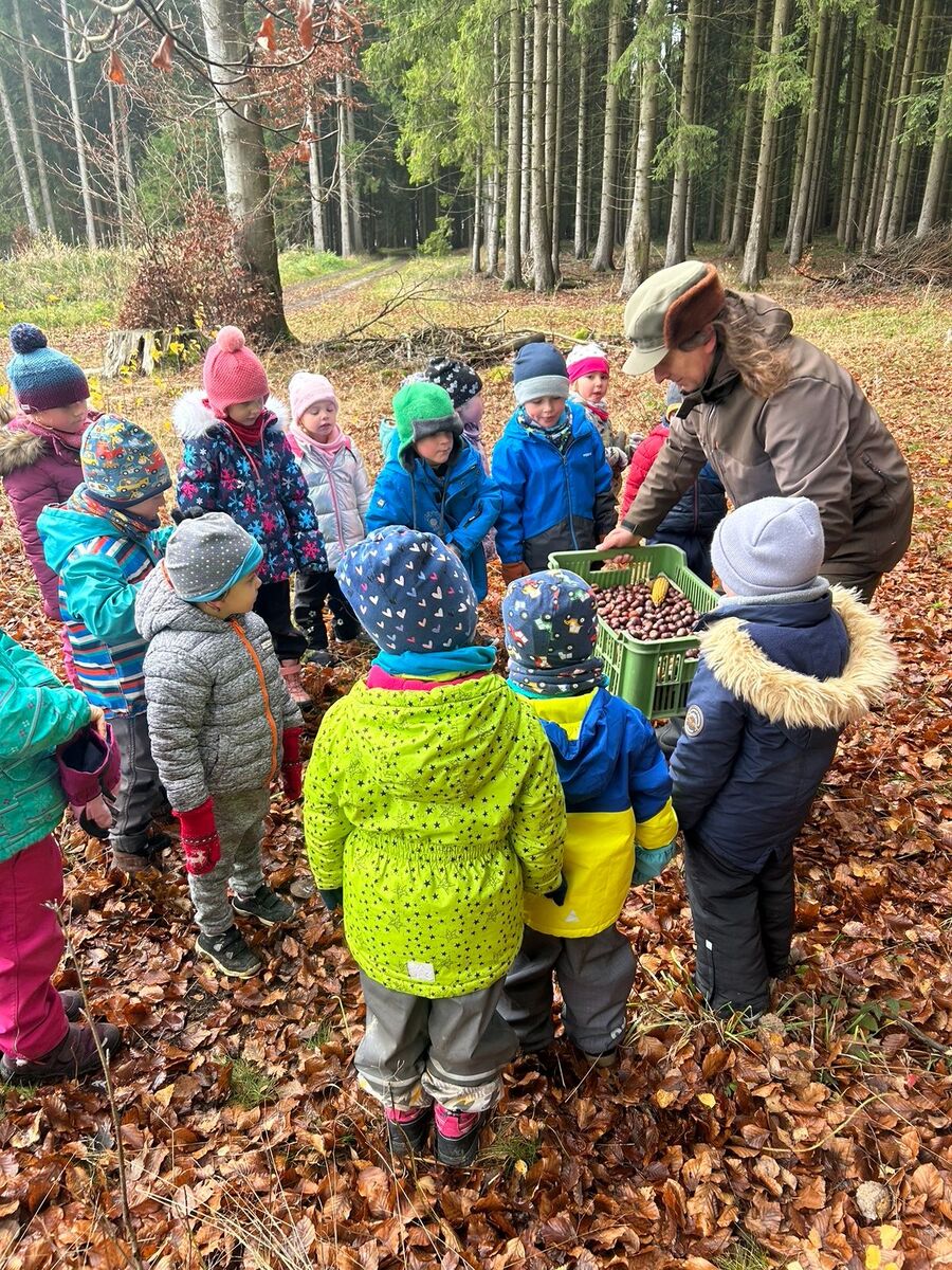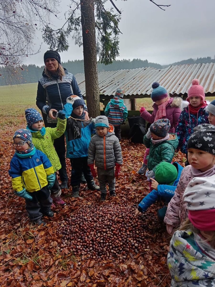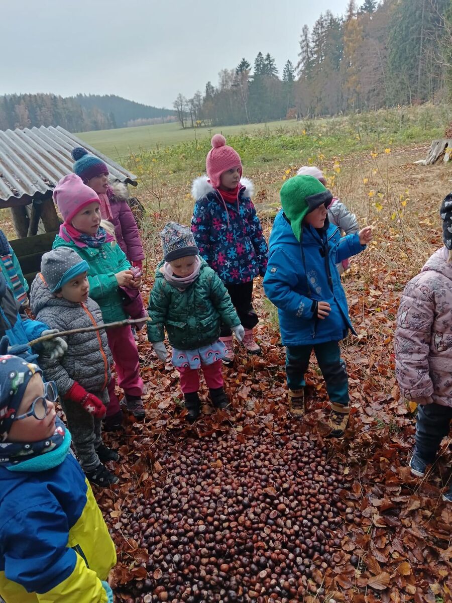 Začátkem listopadu jsme se jako každý podzim vydali s panem myslivcem nakrmit lesní zvířátka k nedalekému krmelci. Děti si samy nasbíraly kaštany, které jsme s sebou přinesli jako přírodní dobroty pro zvířata, a společně jsme je do krmelce uložili.