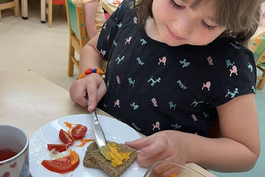 Dnes děti mají k dopolední svačině mrkvovo-tvarohovou pomazánku, která nejen že lahodí oku, ale děti mají opět možnost namazat si dle své chuti. Máme již 3.měsíc ve školním roce a pomazánku ochutnají všechny děti. Namazat si sám zvládne již i 3leté dítko. Dětem to jde krásně u stolečku a paní kuchařce v kuchyni. Souhra je prostě souhra.
