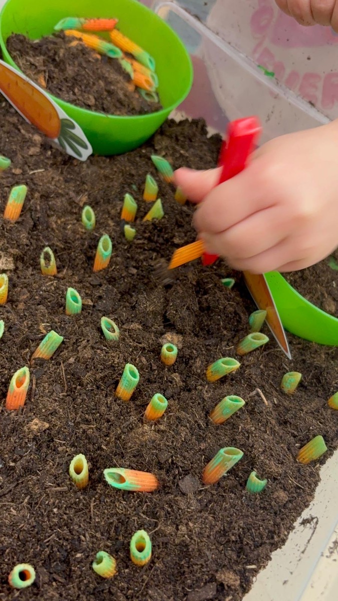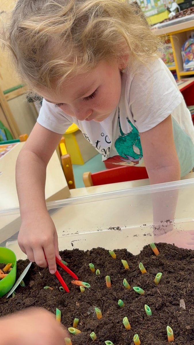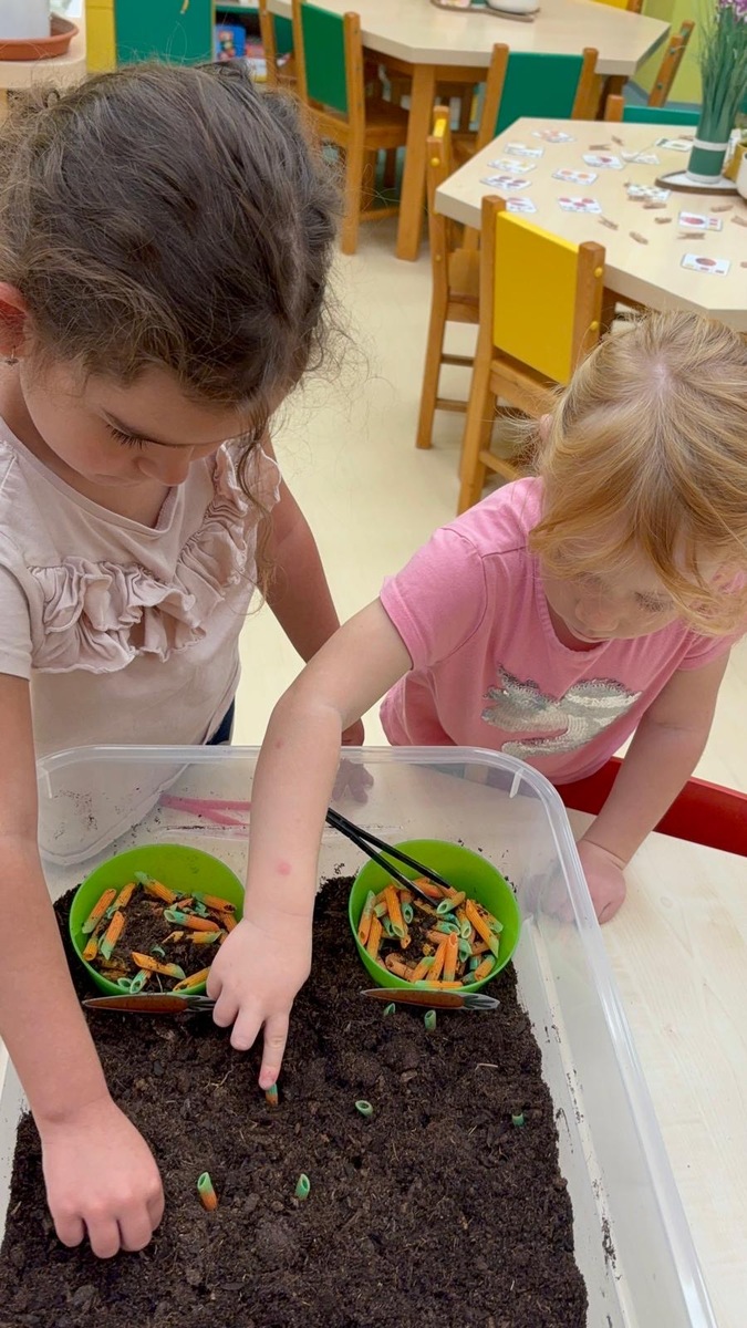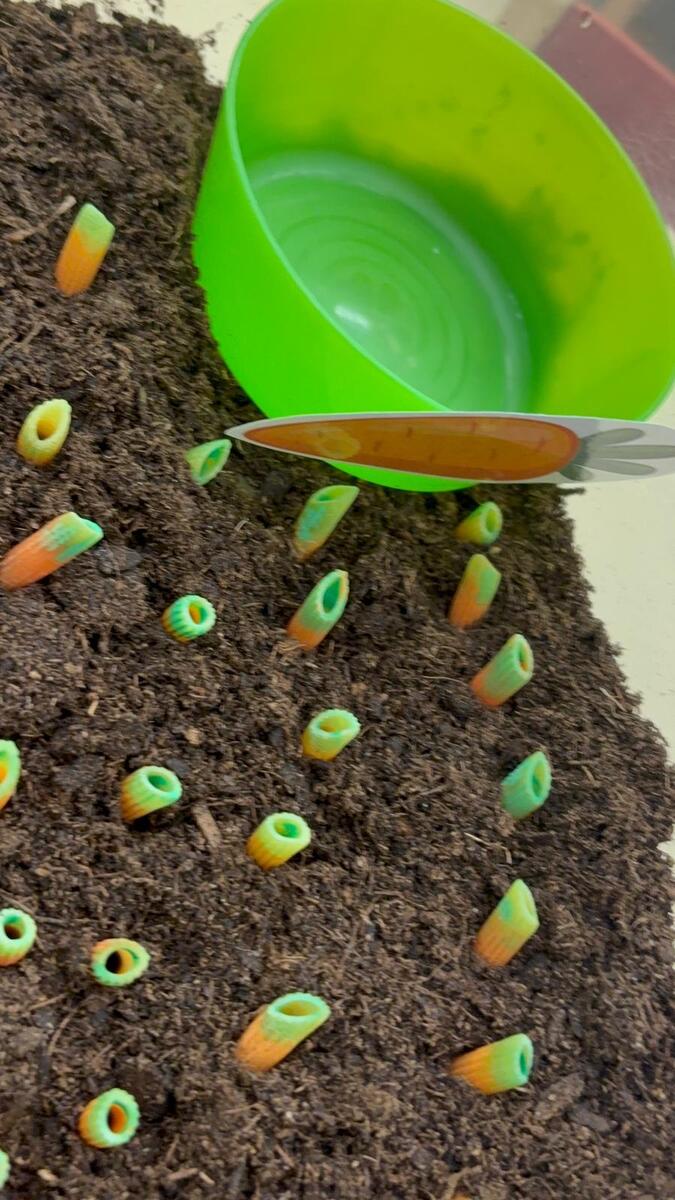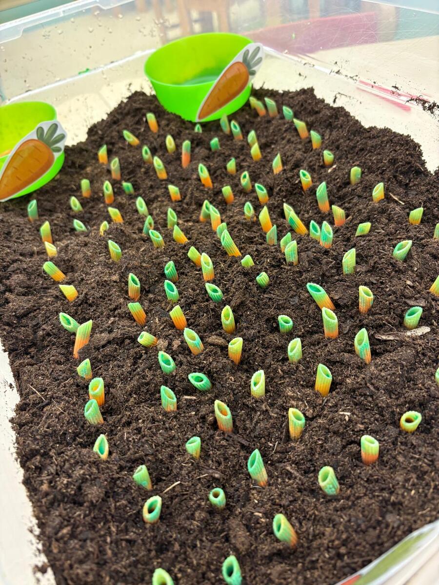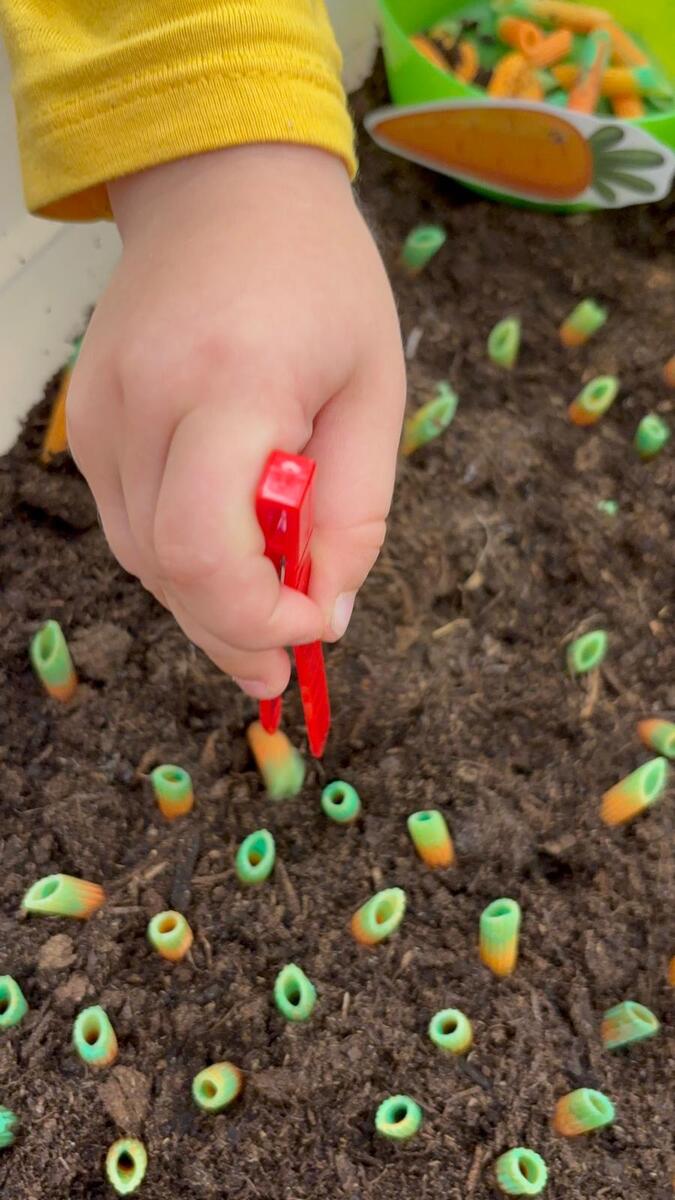 PROCVIČUJEME JEMNOU MOTORIKU Dnes si děti hrály na malé zahradníky. Do „hlíny“ nejprve zasadily obarvené těstoviny, které představovaly mrkvičky, a potom je pomocí pinzet opatrně vytahovaly. Tato aktivita pomáhá dětem rozvíjet jemnou motoriku, trpělivost i soustředění – a navíc je to pro ně zábava! Procvičování motoriky jde hlavně zábavnou formou.