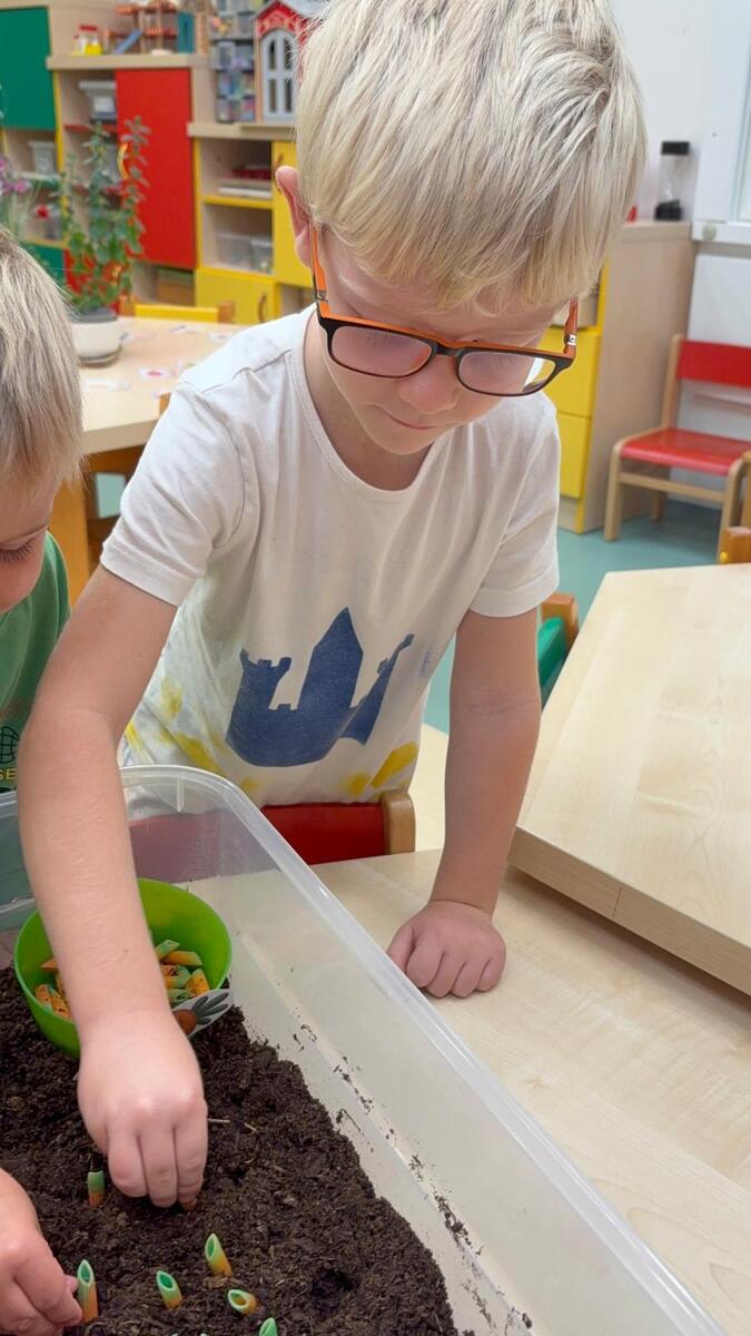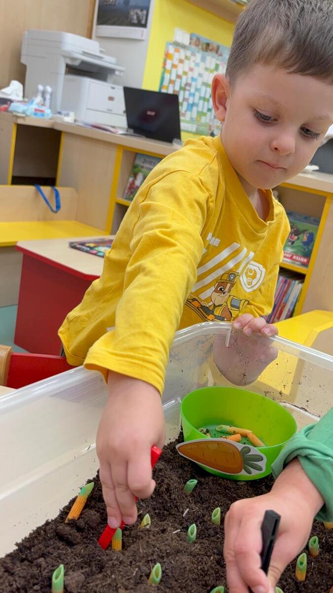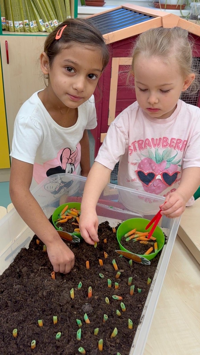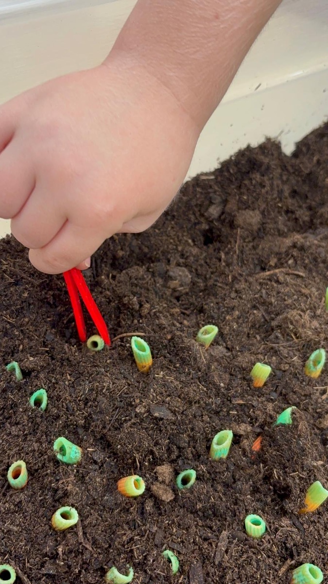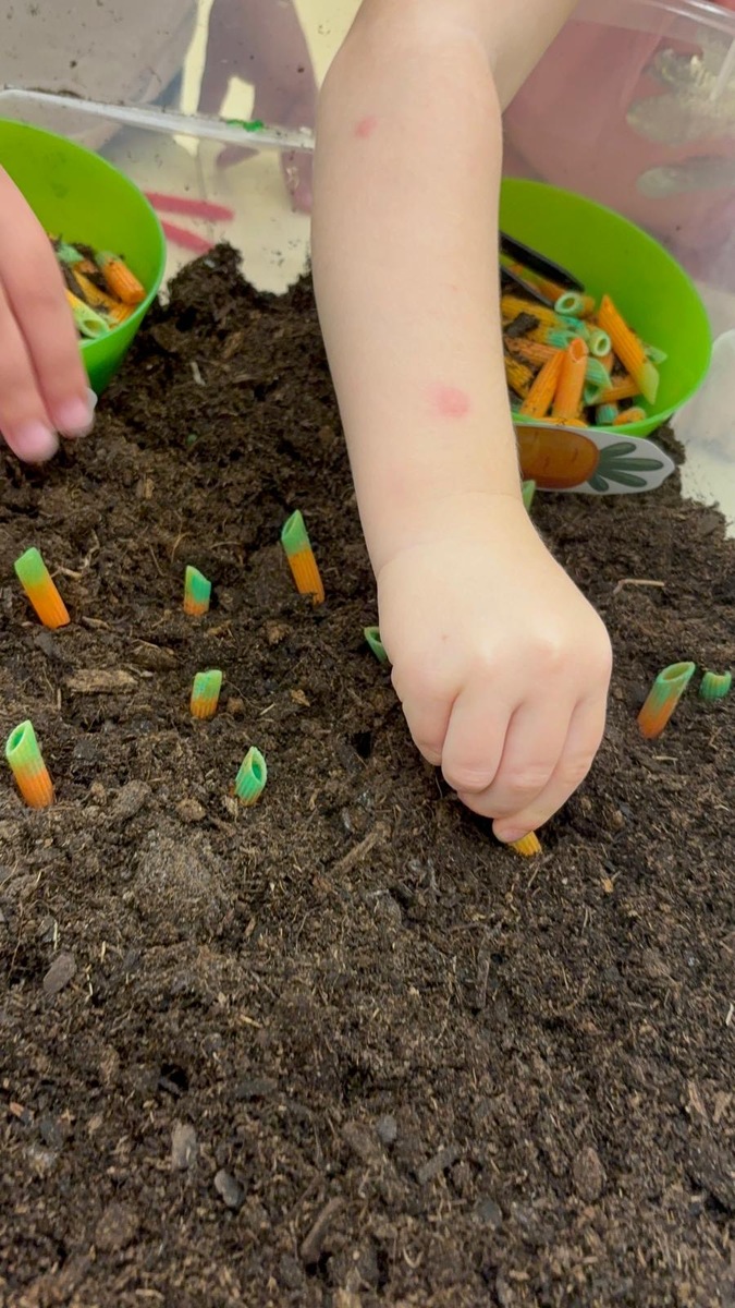PROCVIČUJEME JEMNOU MOTORIKU Dnes si děti hrály na malé zahradníky. Do „hlíny“ nejprve zasadily obarvené těstoviny, které představovaly mrkvičky, a potom je pomocí pinzet opatrně vytahovaly. Tato aktivita pomáhá dětem rozvíjet jemnou motoriku, trpělivost i soustředění – a navíc je to pro ně zábava! Procvičování motoriky jde hlavně zábavnou formou.