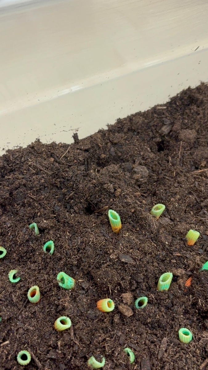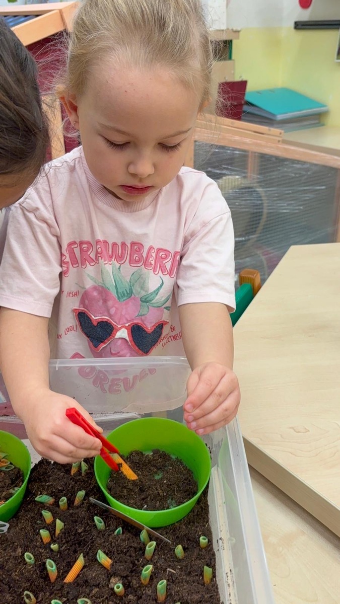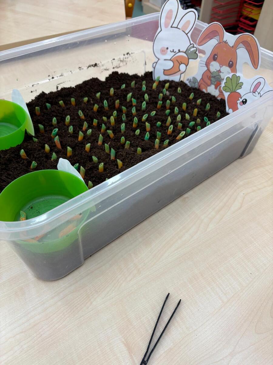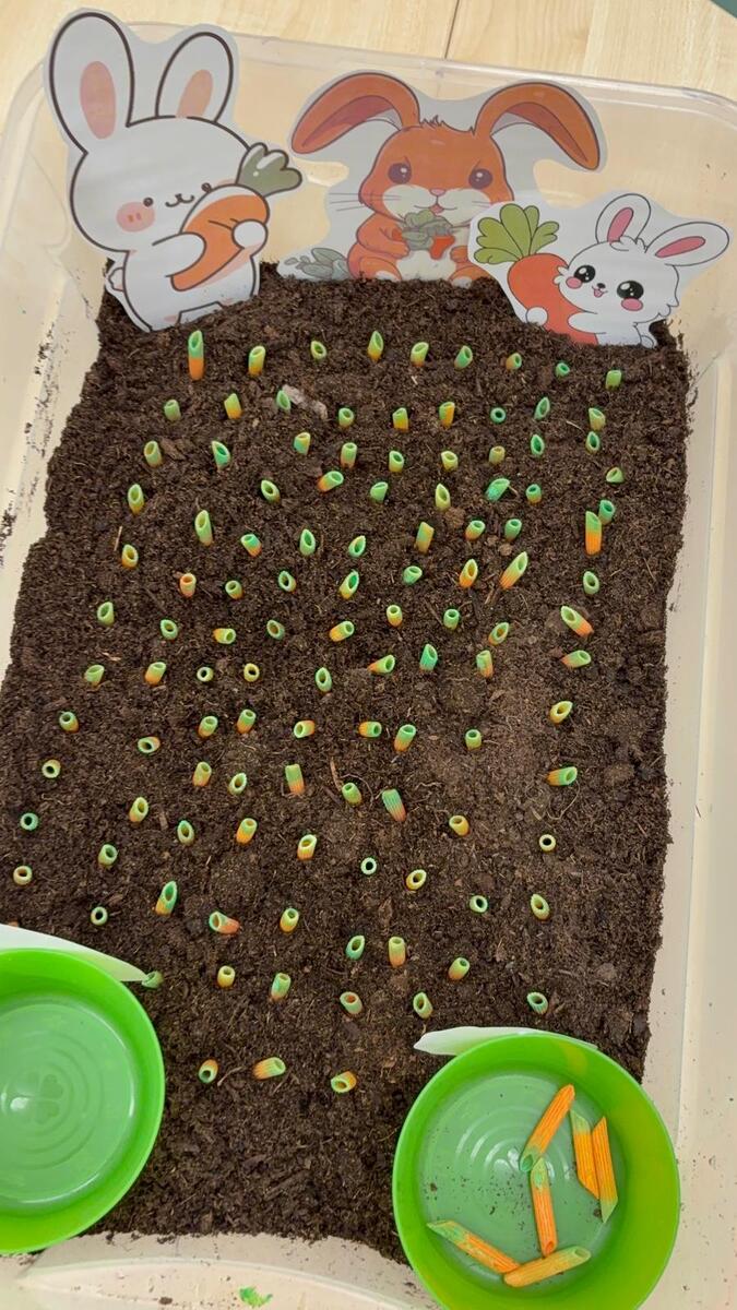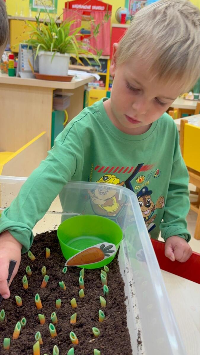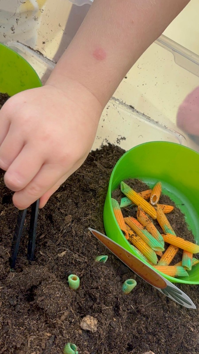PROCVIČUJEME JEMNOU MOTORIKU Dnes si děti hrály na malé zahradníky. Do „hlíny“ nejprve zasadily obarvené těstoviny, které představovaly mrkvičky, a potom je pomocí pinzet opatrně vytahovaly. Tato aktivita pomáhá dětem rozvíjet jemnou motoriku, trpělivost i soustředění – a navíc je to pro ně zábava! Procvičování motoriky jde hlavně zábavnou formou.
